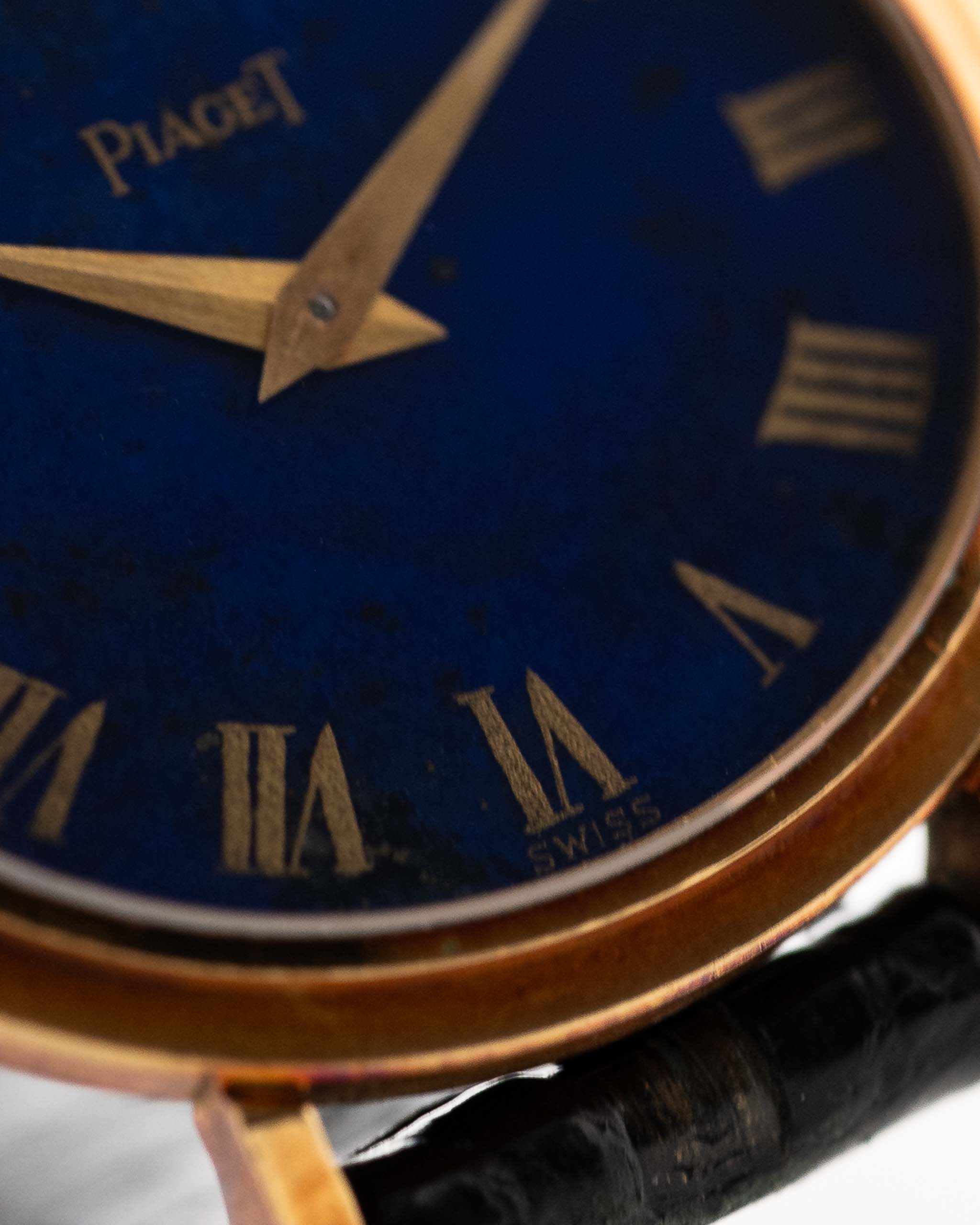 Sa minceur n'était pas seulement une prouesse technique, elle permettait aussi à la manufacture de monter des cadrans en pierres dures tout en conservant un profil fin comme cette Piaget 18k impeccable avec un beau cadran en pierre de Lapislazuli et un Patin très chaleureux sur le boîtier en or jaune 18k.
