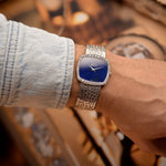 Montre Piaget TV 12735 Lapis Lazuli Diamond des années 1970 sur un poignet. 32mm en or blanc 18k avec calibre automatique 12P1, cadran en lazuli, lunette en diamant et bracelet intégré en or blanc 18k. 12P1, cadran en Lapis Lazuli, lunette en diamant et bracelet intégré en or blanc 18k.