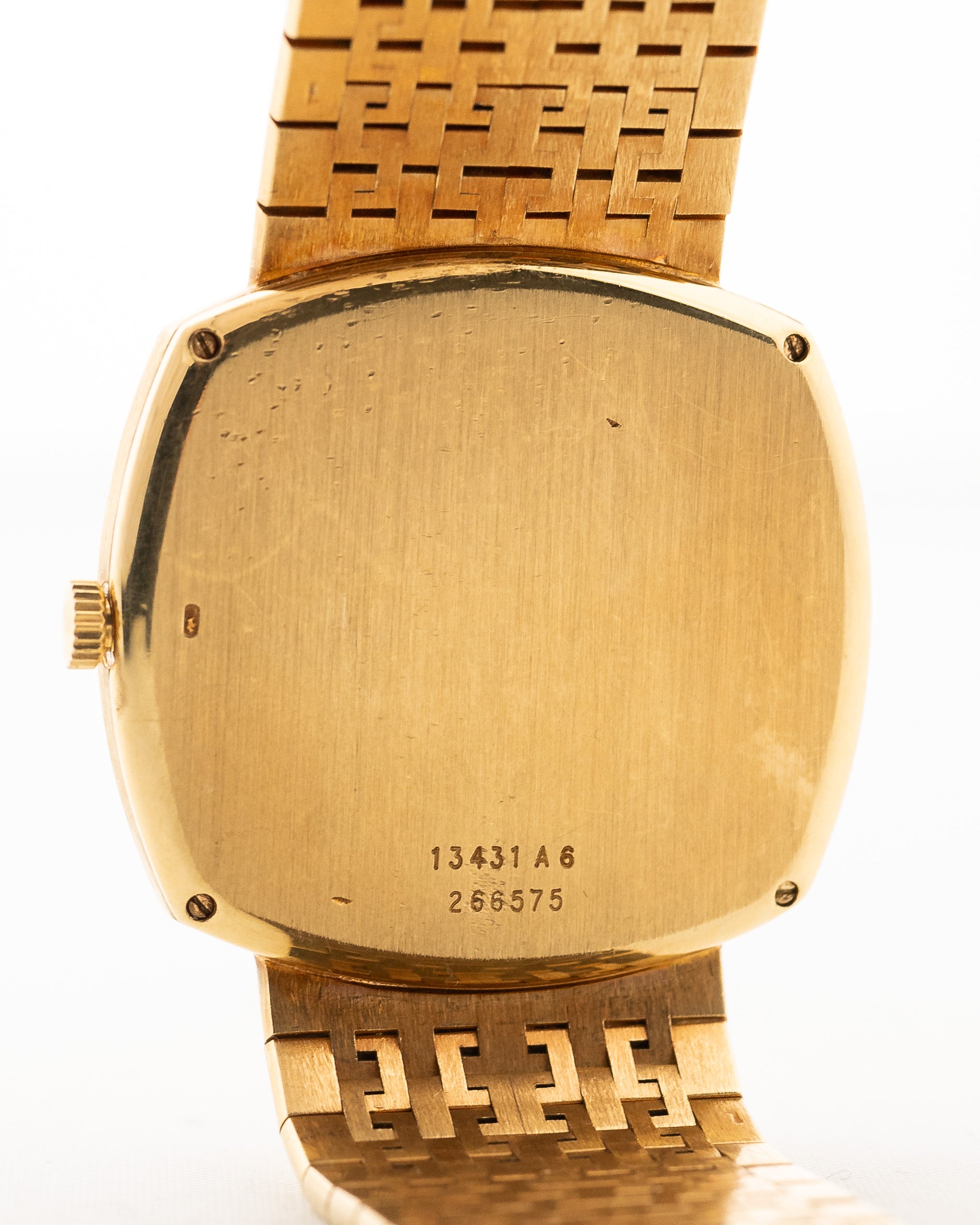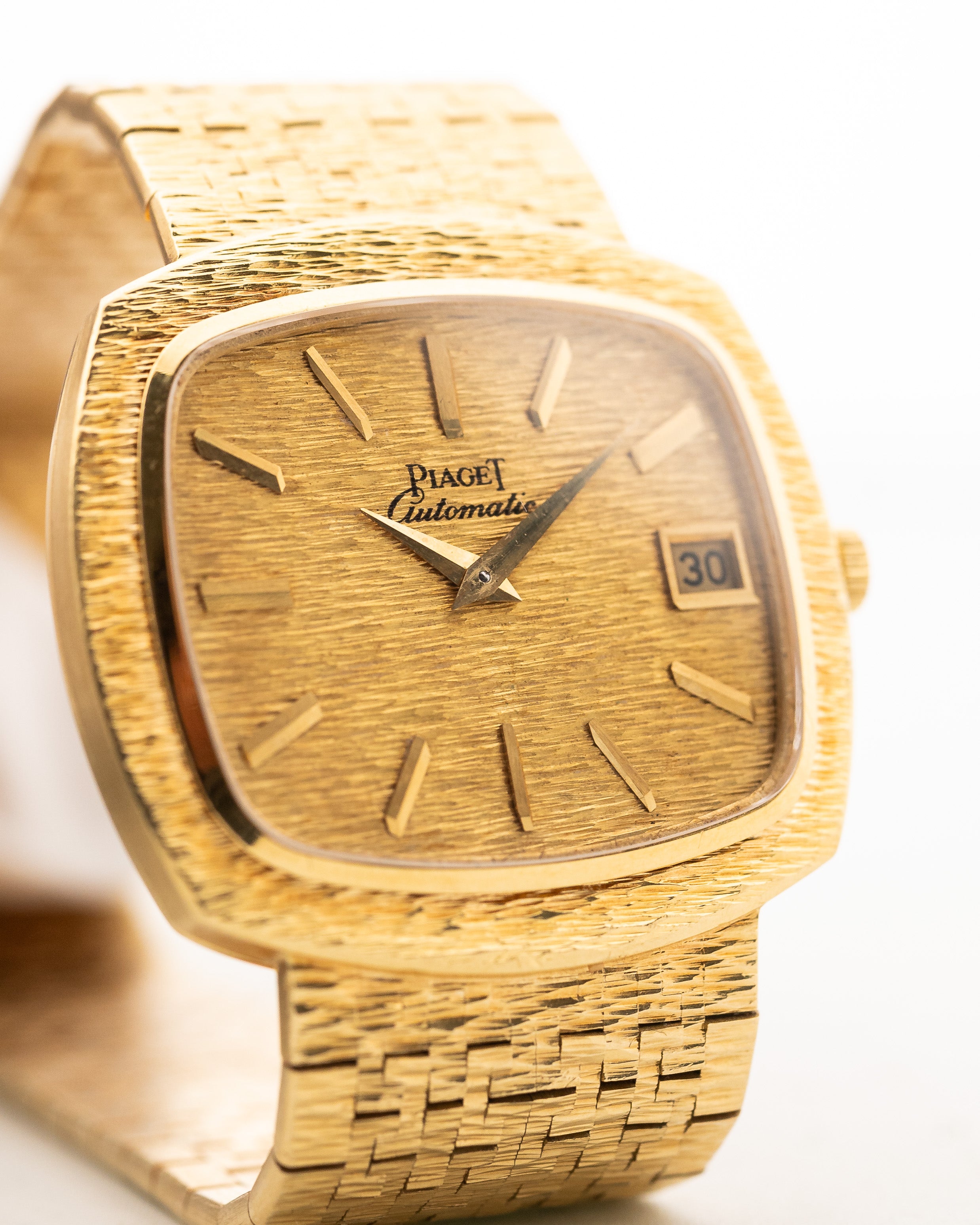 Notre pièce se présente dans un état fantastique, presque jamais portée, avec un superbe bracelet Piaget en or jaune 18 carats intégré, le cadran doré est en parfait état et la forme du boîtier TV est une pièce d'art vraiment unique.