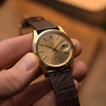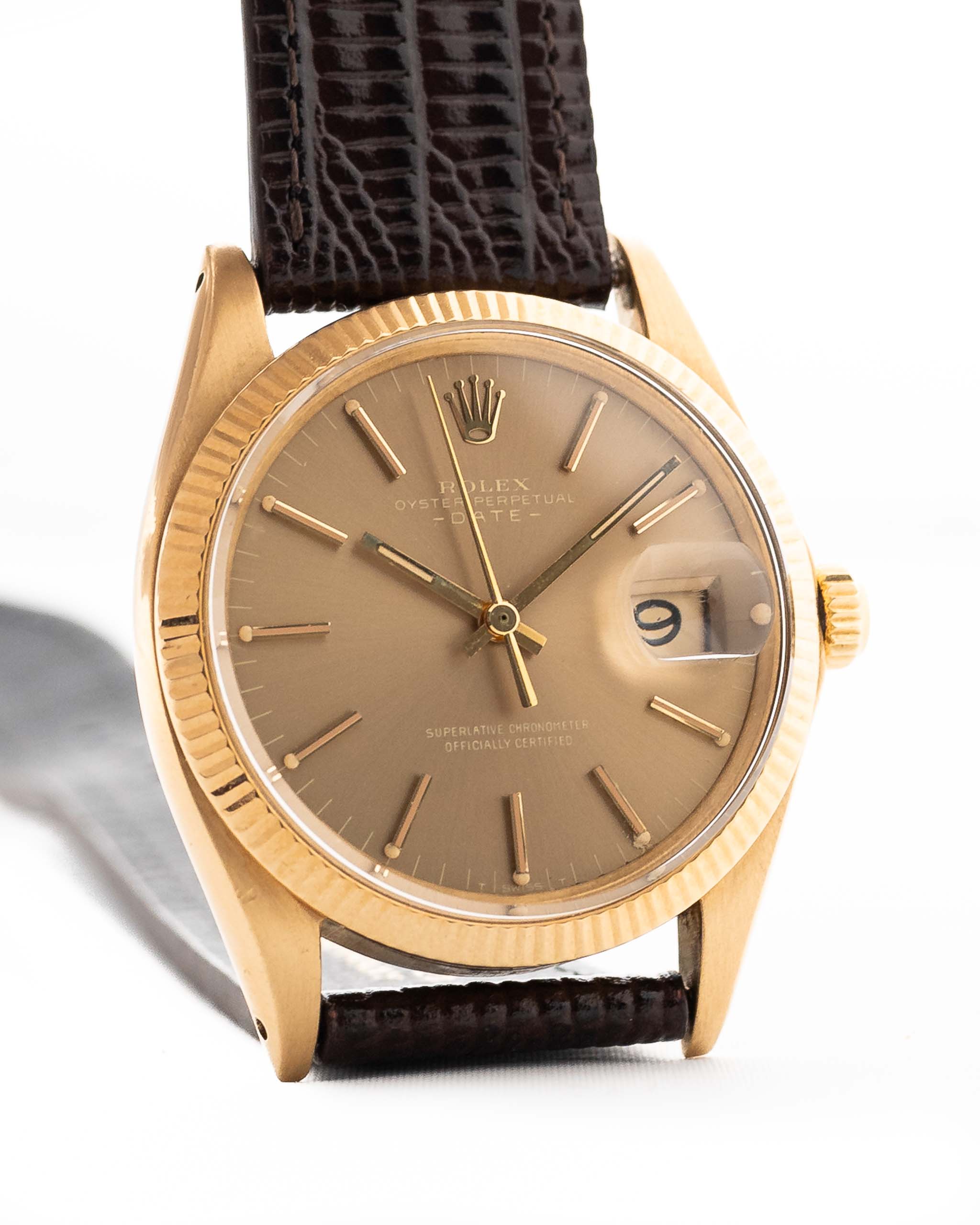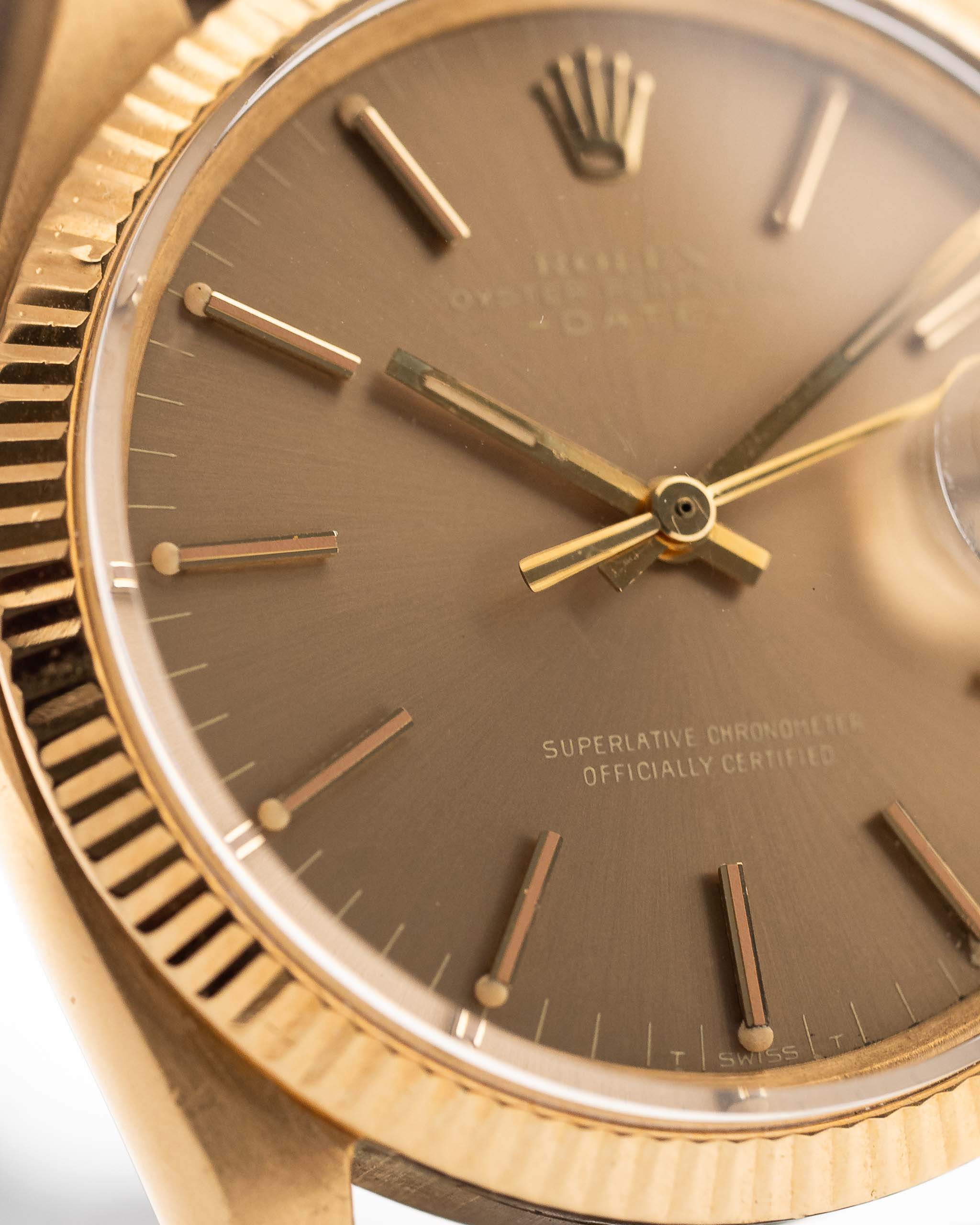 Gros plan sur une Rolex Oyster Perpetual 1503 Date de 1971, boîtier en or jaune de 34,5 mm, calibre automatique 1570, cadran soleillé.