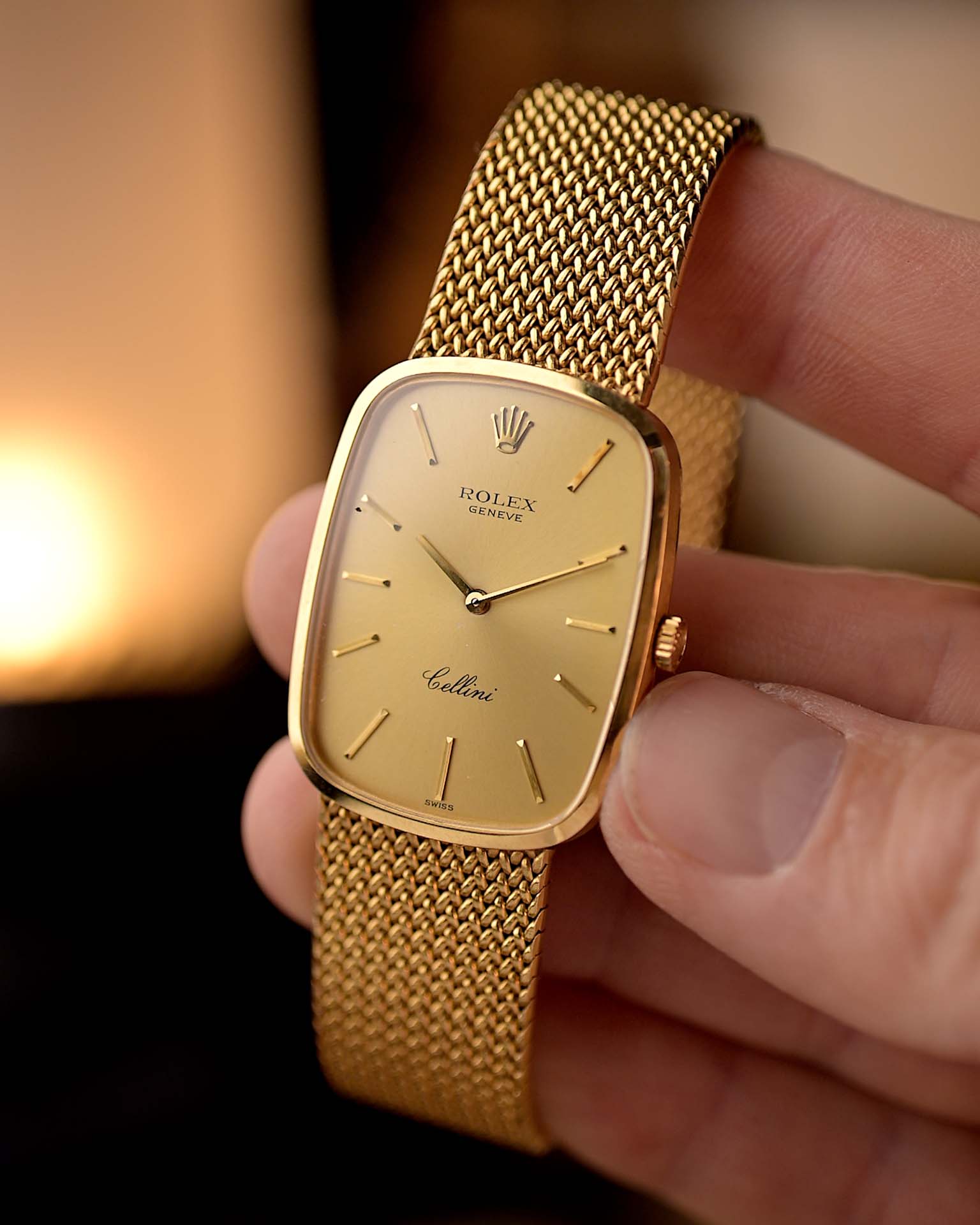 La ligne Rolex Cellini illustre le côté raffiné et habillé de la marque, loin des modèles sportifs Oyster. Cette rare Réf. 4310 se distingue au sein de la collection : un élégant boîtier en forme d'ellipse, magnifiquement proportionné, entièrement réalisé en or jaune 18 carats. Un langage de conception unique à son époque et rarement vu aujourd'hui.