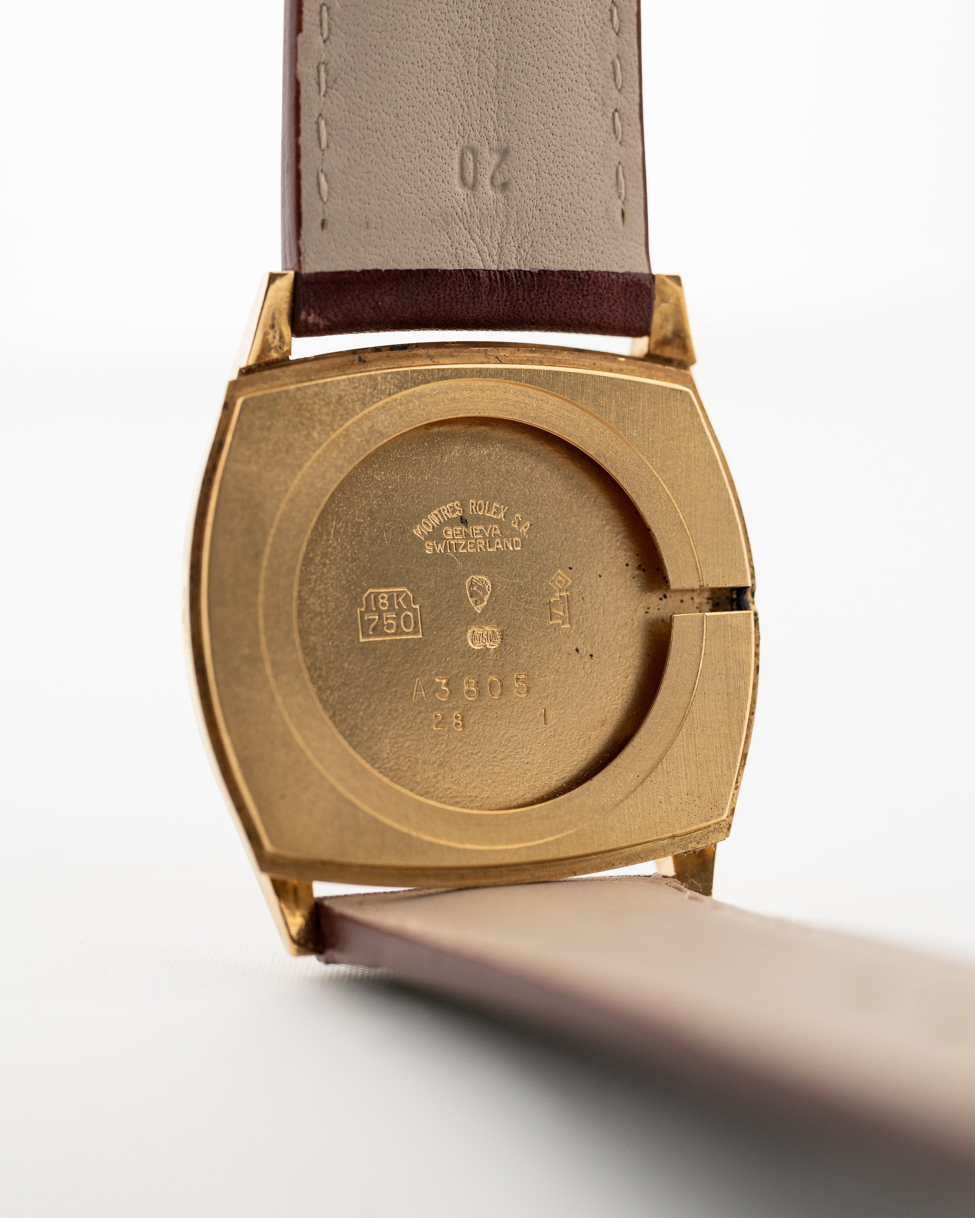 La ligne Rolex Cellini illustre le côté plus élégant de Rolex par rapport à ses modèles sportifs plus connus. Cette version est équipée d'un boîtier en or jaune 18 carats de forme tonneau, une forme de boîtier inhabituelle pour Rolex.