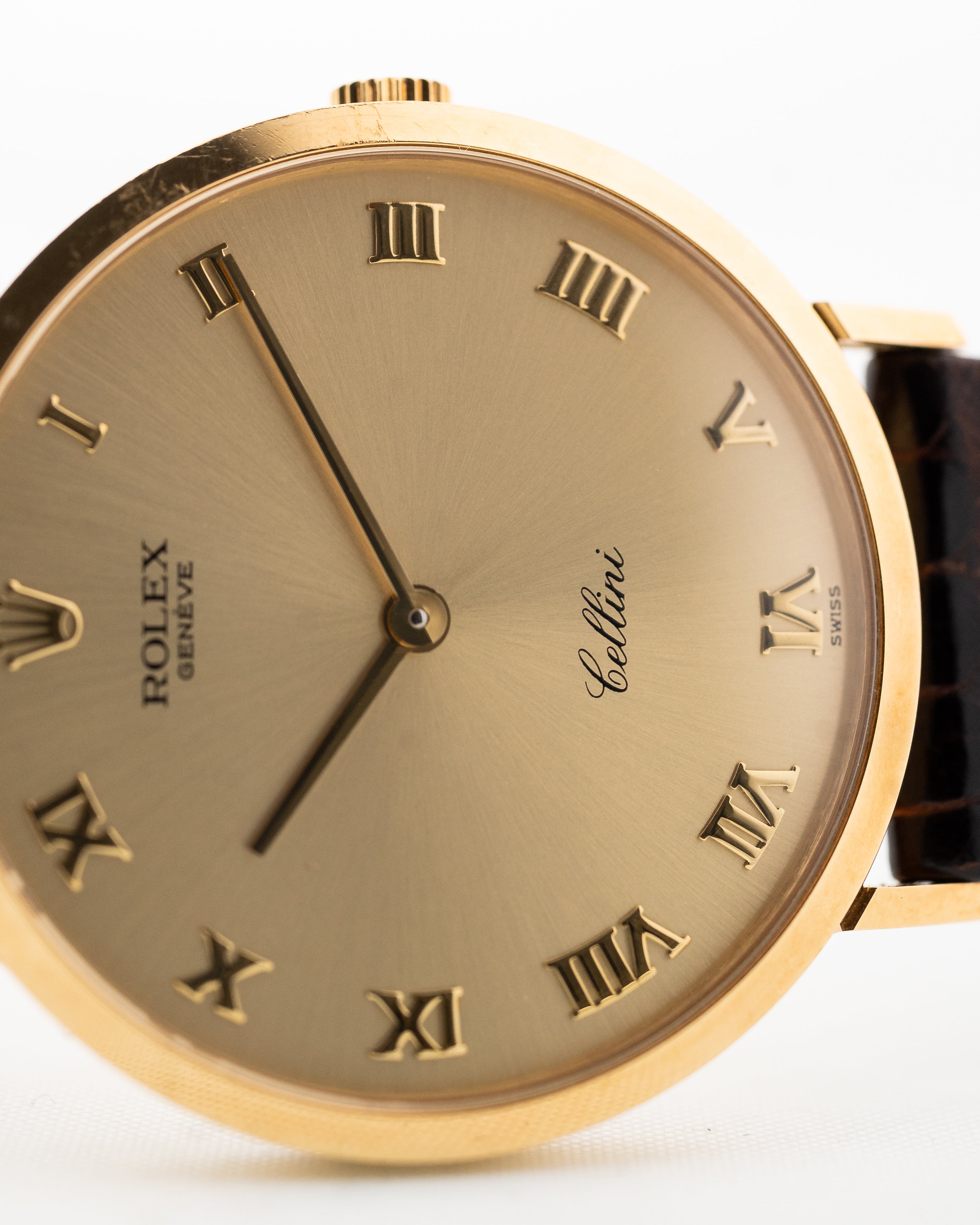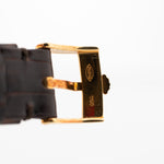 La ligne Rolex Cellini met en valeur le côté plus élégant de Rolex par rapport à ses modèles sportifs plus connus. Notre Ref. 4122 est montée dans un boîtier en or jaune de 18k, le cadran est en or jaune, couleur populaire pour les montres habillées produites à cette époque.La couleur du cadran est l'or jaune, qui était une couleur populaire pour les montres habillées produites à cette époque. Elle est livrée avec le bracelet Rolex en crocodile et la boucle Rolex en or jaune 18 carats d'origine, en parfait état.