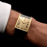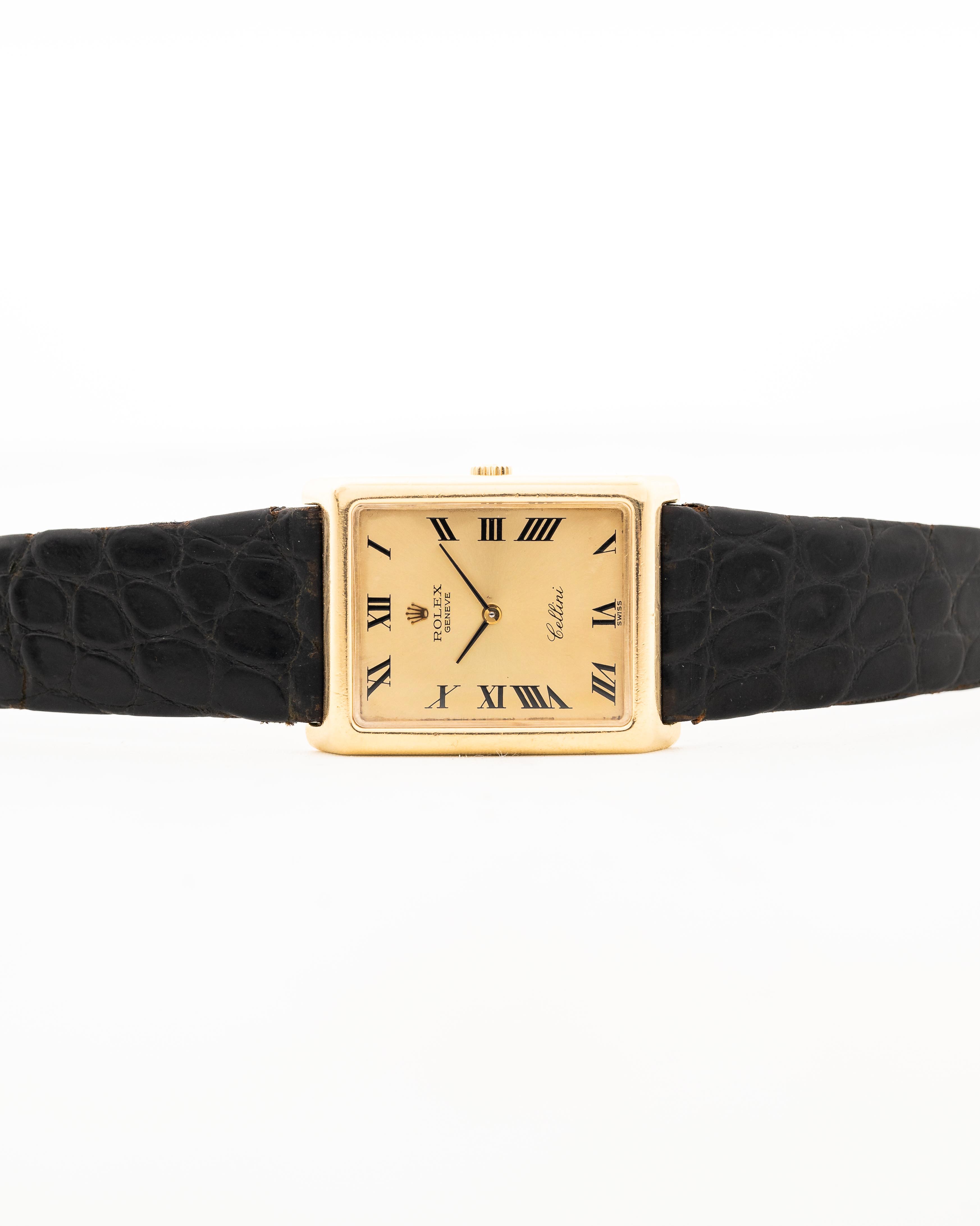 La ligne Rolex Cellini illustre le côté plus habillé de Rolex par rapport à ses modèles sportifs plus connus. Cette version est équipée d'un boîtier carré en or jaune 18 carats, une forme de boîtier inhabituelle pour Rolex.