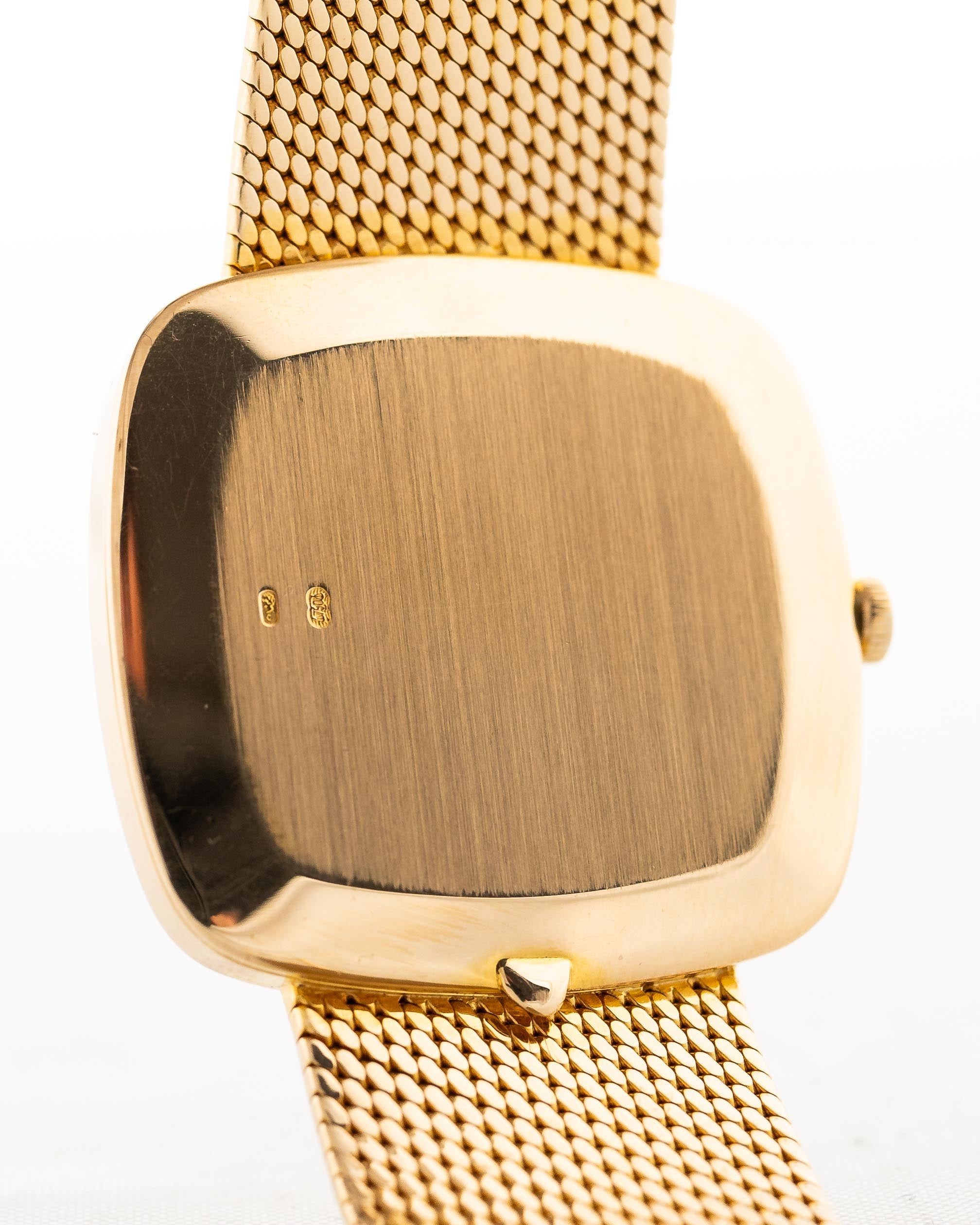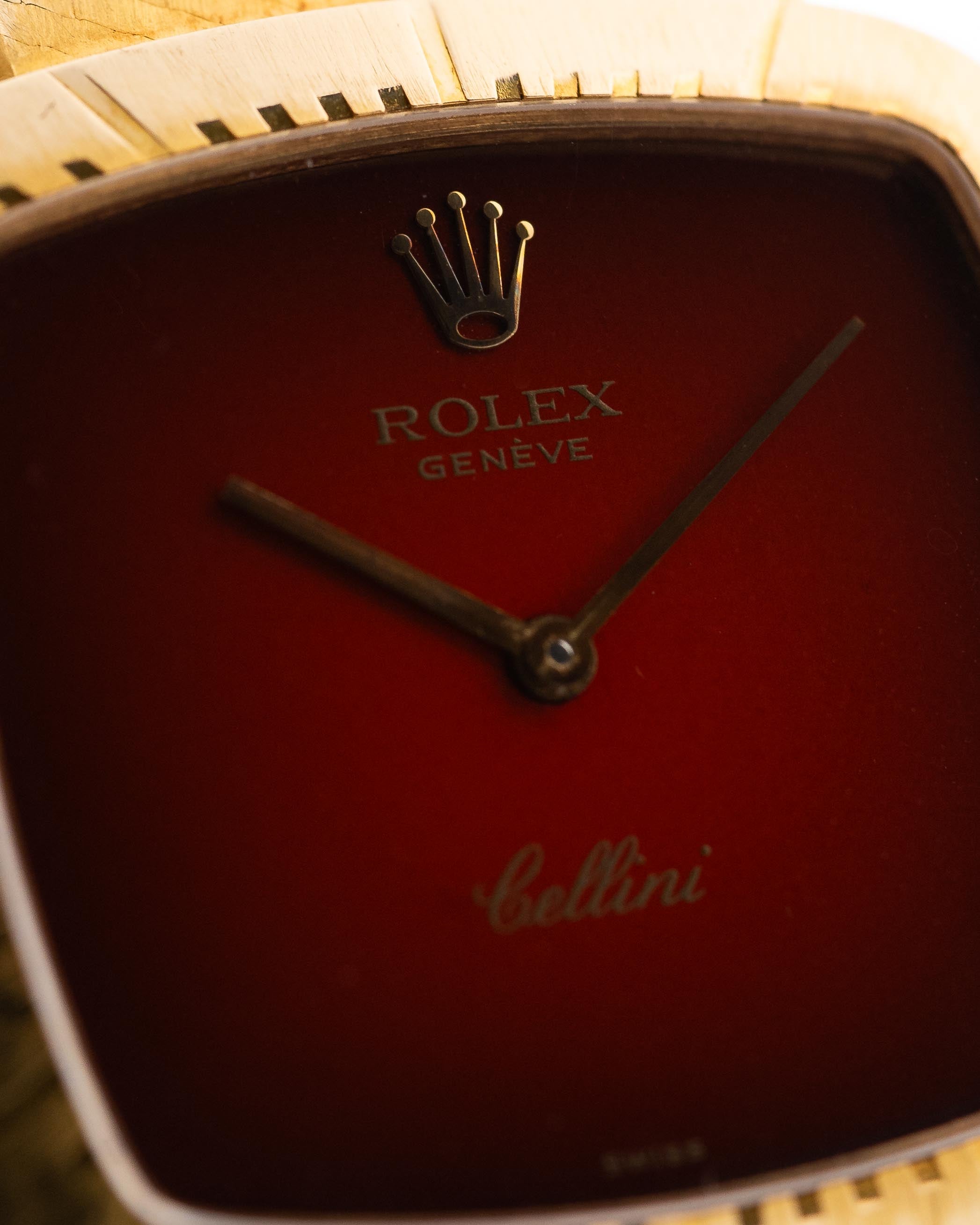 La ligne Rolex Cellini illustre le côté plus habillé de Rolex par rapport à ses modèles sportifs plus connus. Cette version est équipée d'un boîtier carré en or jaune 18 carats, une forme de boîtier inhabituelle pour Rolex.