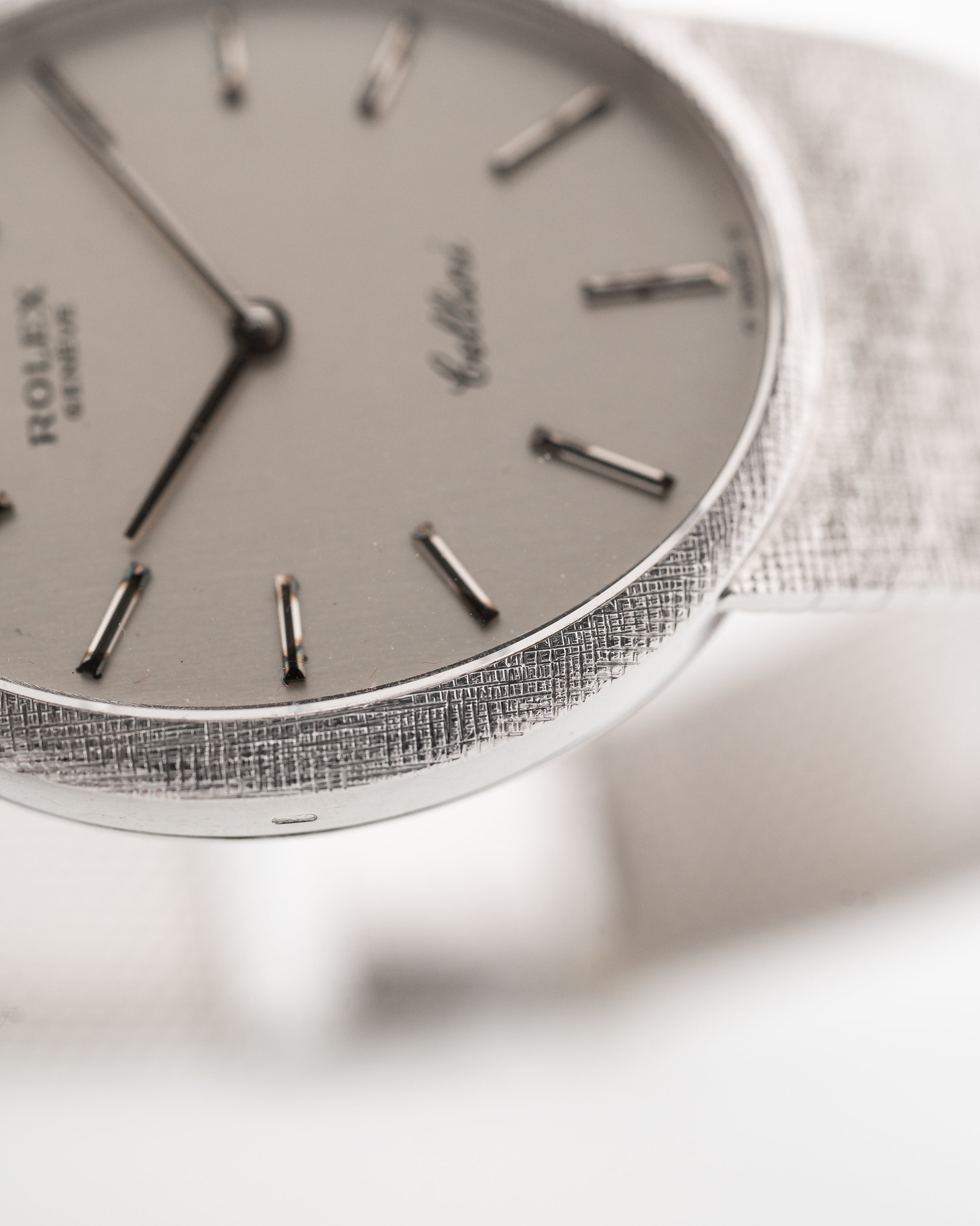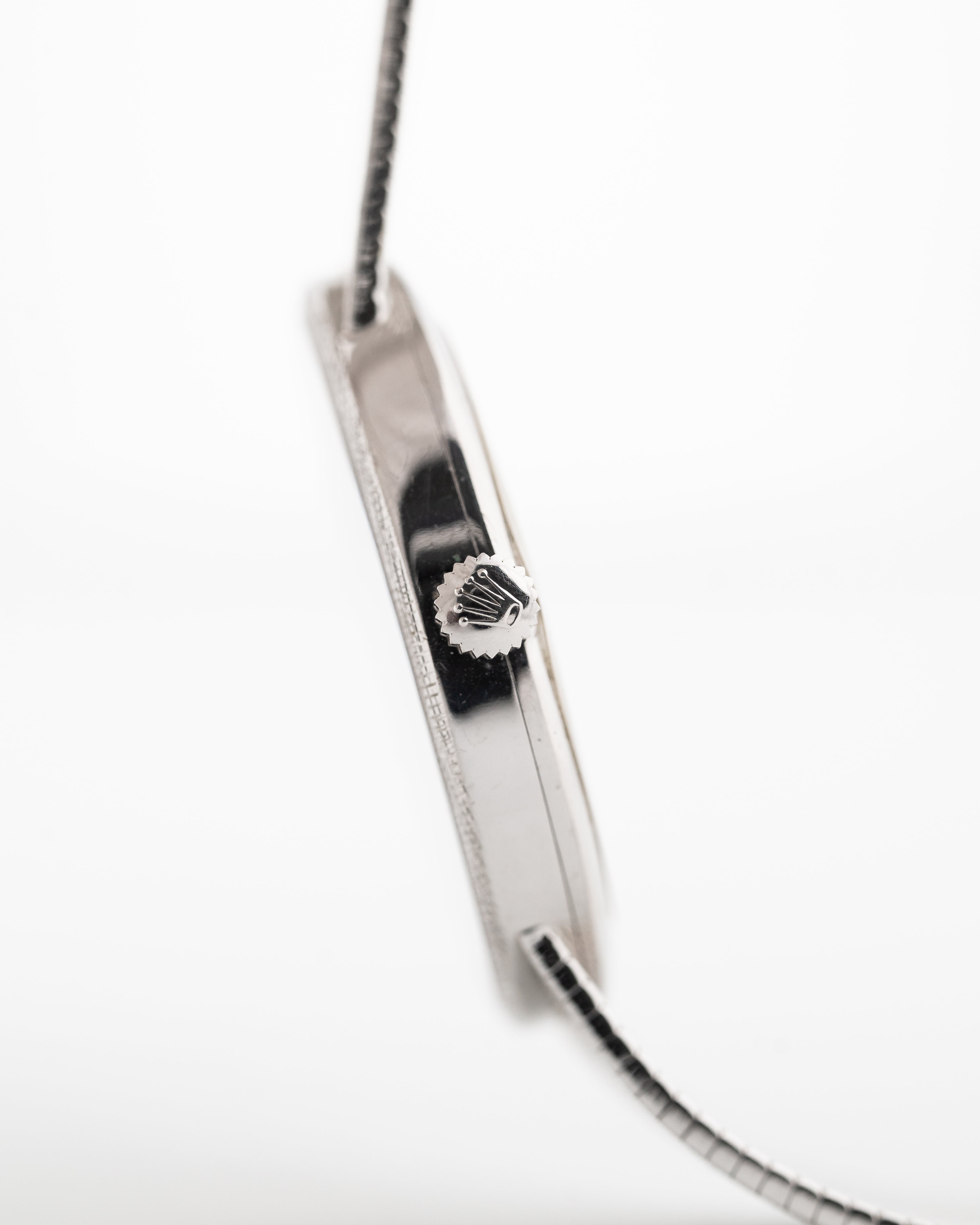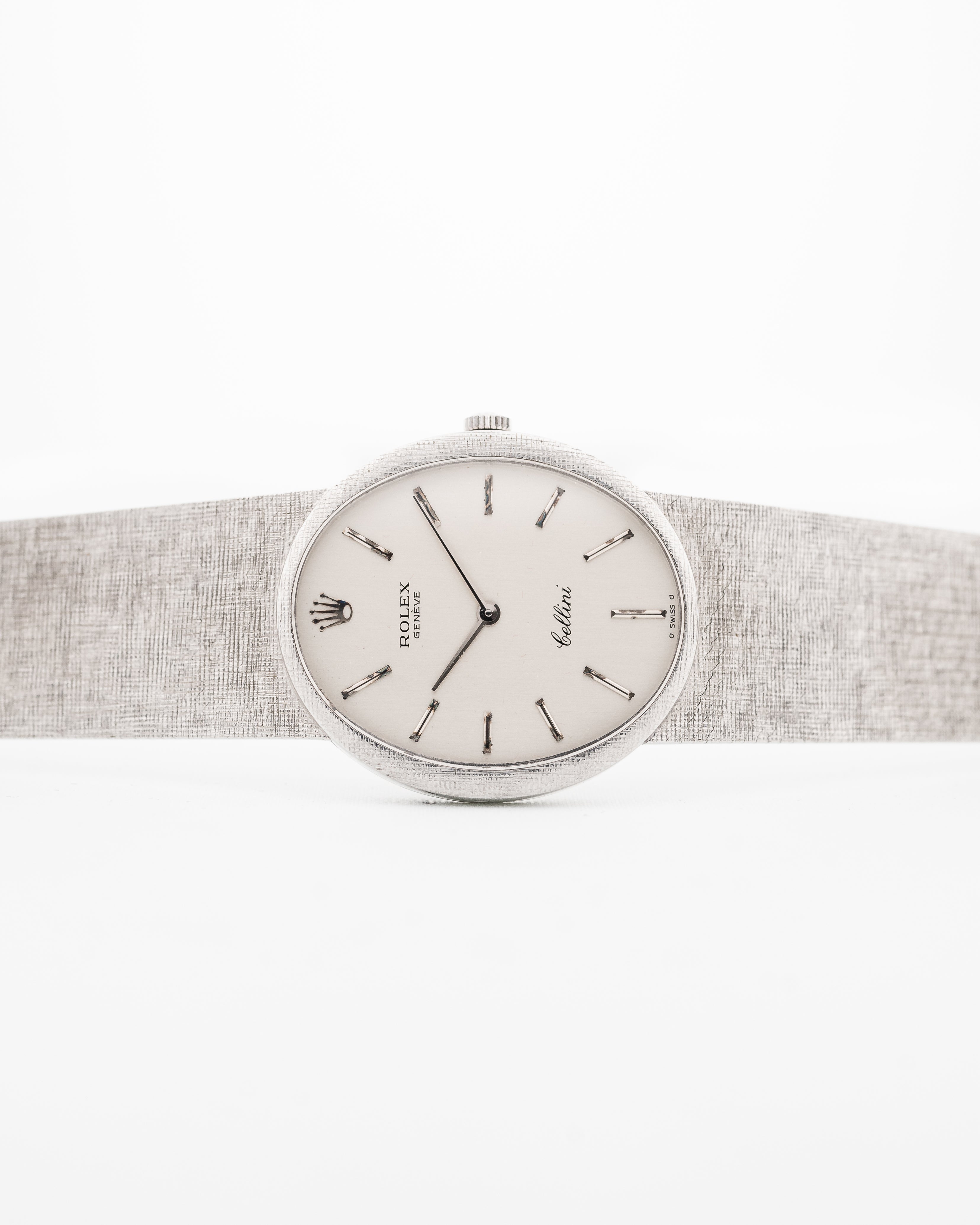 La ligne Rolex Cellini met en valeur le côté plus habillé de Rolex par rapport à ses modèles sportifs plus connus. Notre version Ref. 4094 est équipée d'un boîtier ovale en or blanc 18 carats, une forme de boîtier inhabituelle pour Rolex.