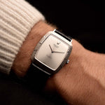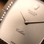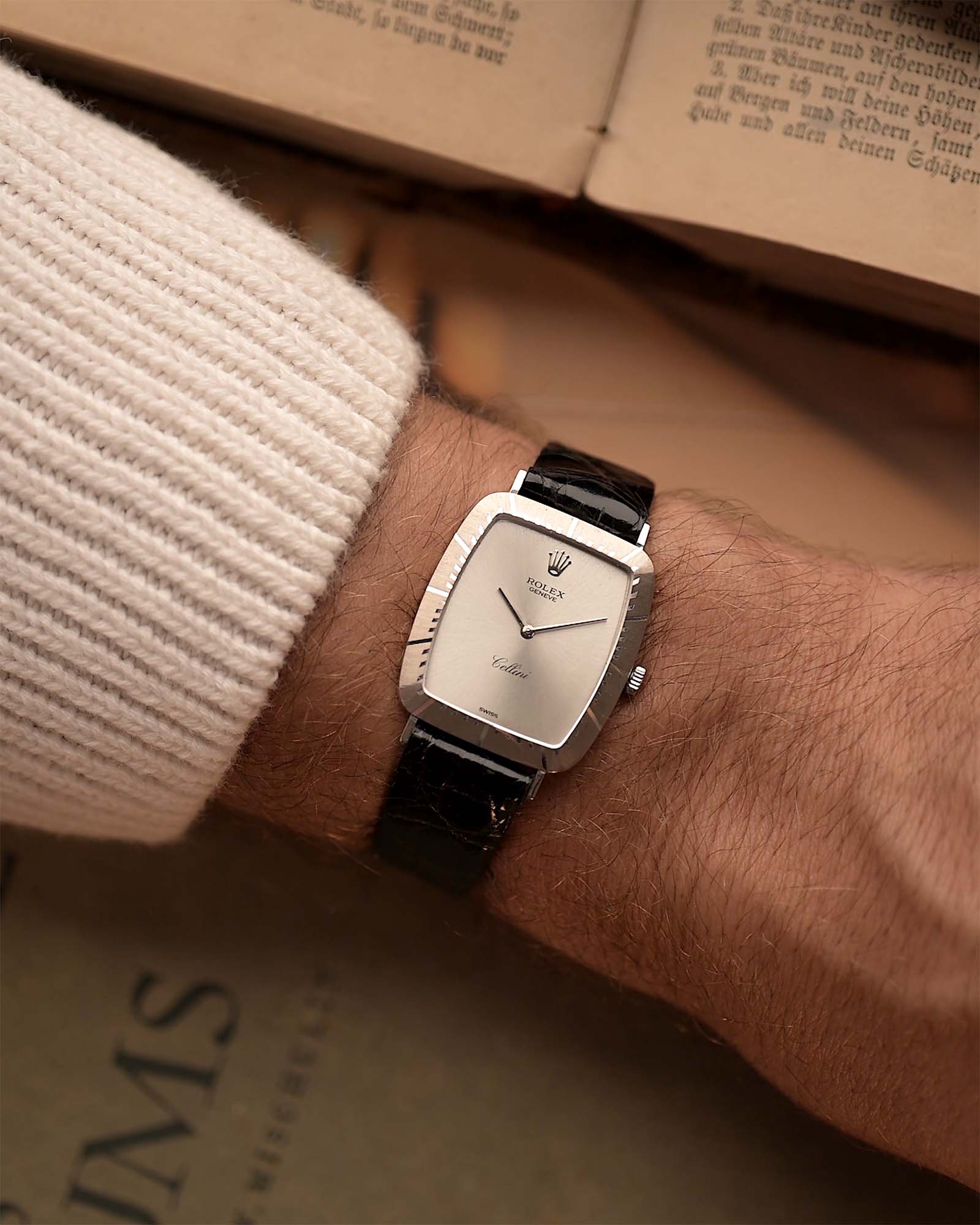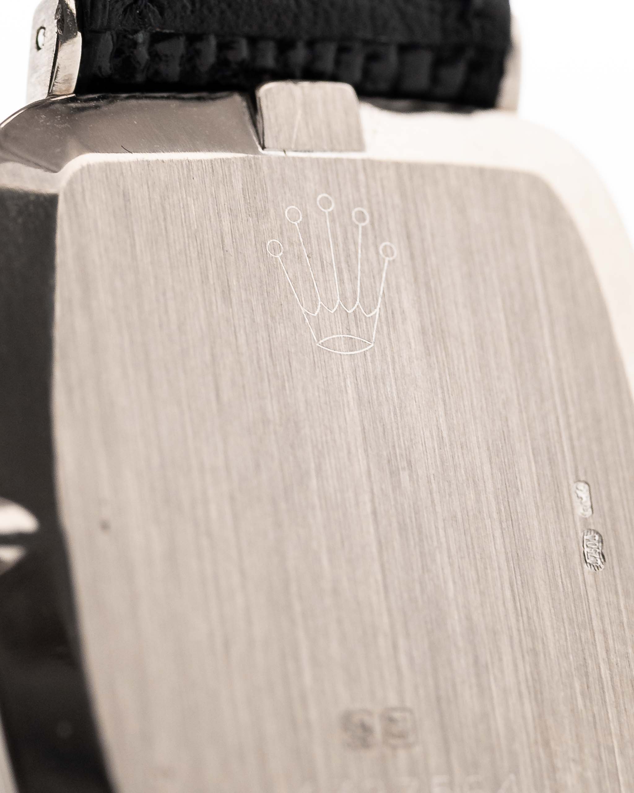 La ligne Rolex Cellini reflète l'élégance discrète de la marque, à mille lieues de ses modèles sportifs emblématiques. Cette Réf. 4087, réalisée en or blanc massif 18 carats, présente un rare boîtier rectangulaire qui la distingue de la plupart des modèles Rolex de l'époque.