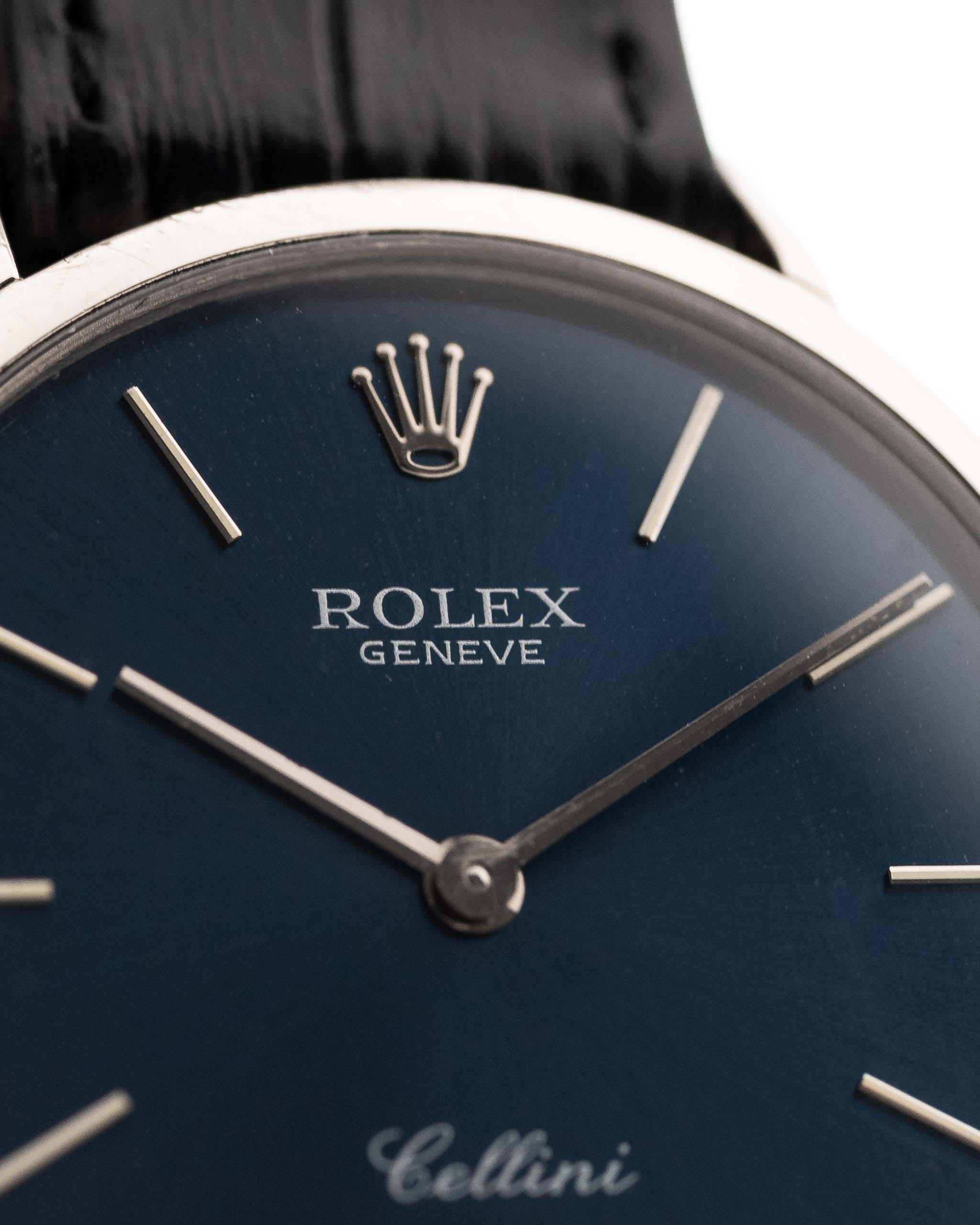 Discrète, élégante et rarement vue dans cette configuration, la Rolex Cellini Ref. 4112 en or blanc 18 carats associe un design classique de style Calatrava à un cadran bleu océan à l'éclat solaire hypnotique qui est une pure poésie visuelle.