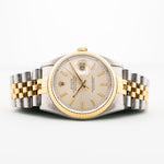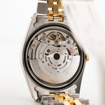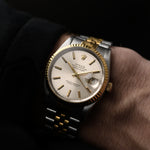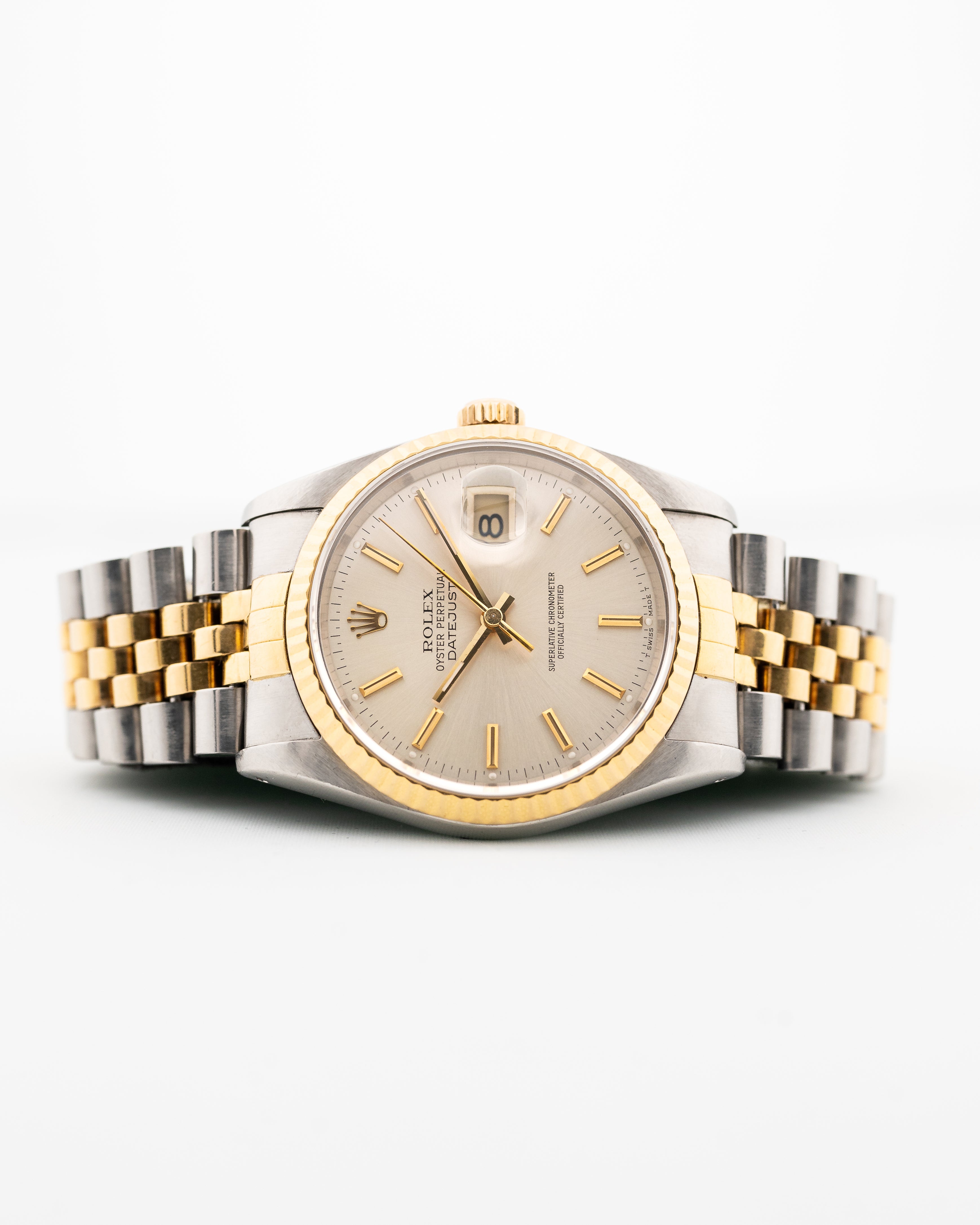Cette pièce de 1991 se distingue par sa lunette et sa couronne cannelées en or jaune, un boîtier solide aux arêtes vives et un cadran argenté propre en parfait état.