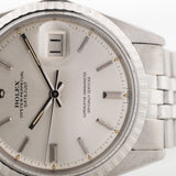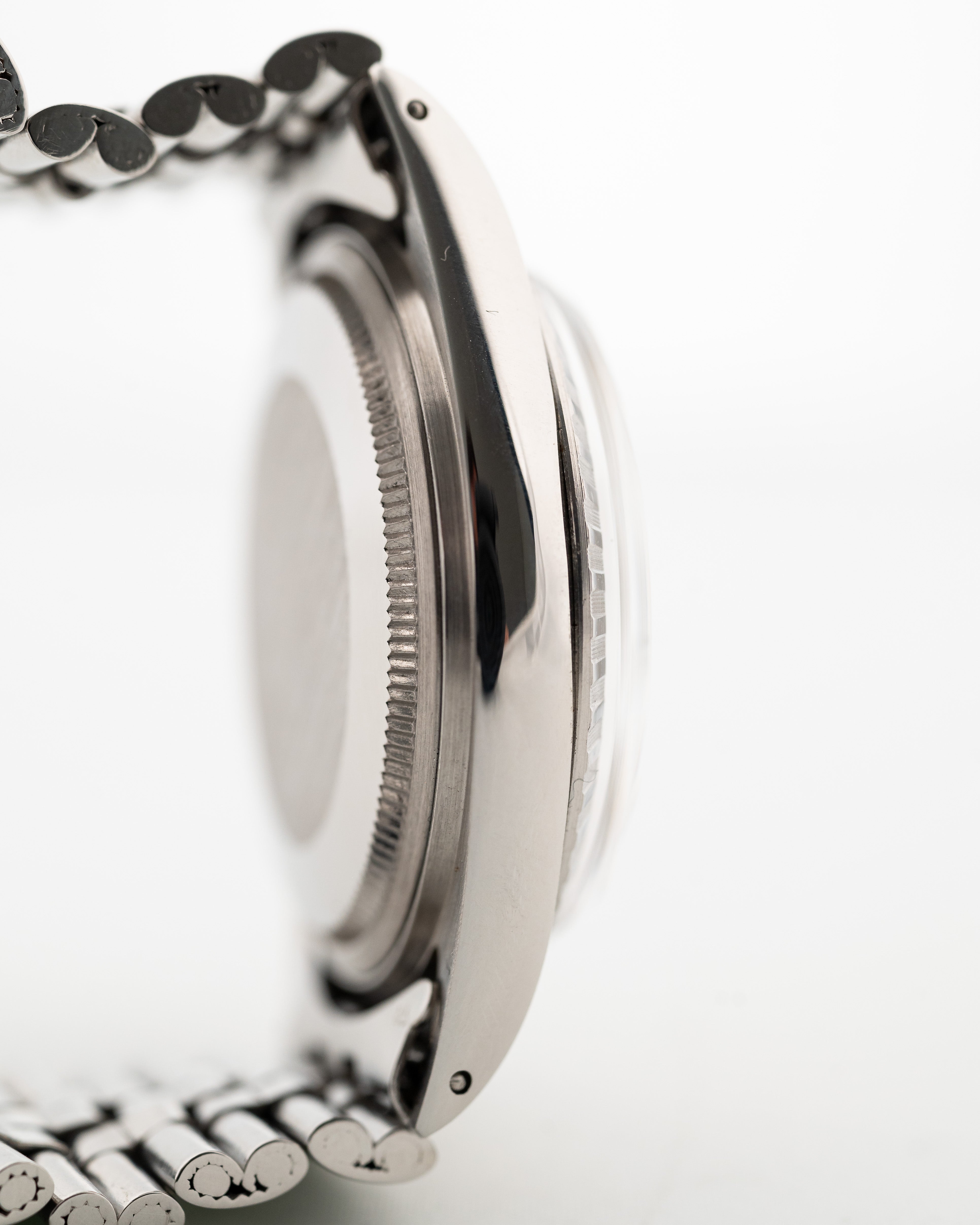 Cette pièce particulière de 1973 se distingue par sa lunette tournée, un magnifique cadran argenté en état impeccable avec des luminescences parfaites et un boîtier très solide aux arêtes vives.