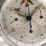 Cette pièce est dotée d'un boîtier en acier inoxydable magnifiquement préservé , avec des cornes araignées rares, qui lui confèrent une présence sculpturale au poignet. La disposition du cadran, qui combine chronographe, triple calendrier et phase de lune, est l'une des plus harmonieuses et des plus emblématiques de l'époque.
