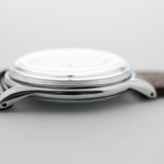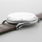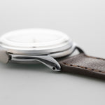 Dotée d'un boîtier en acier de 35 mm, de cornes tournées vers le bas et d'un magnifique cadran argenté, cette montre est incontournable. Le cadran a magnifiquement vieilli et comporte des chiffres arabes ainsi qu'une aiguille des secondes bleue, ce qui confère à cette montre une allure plus habillée.