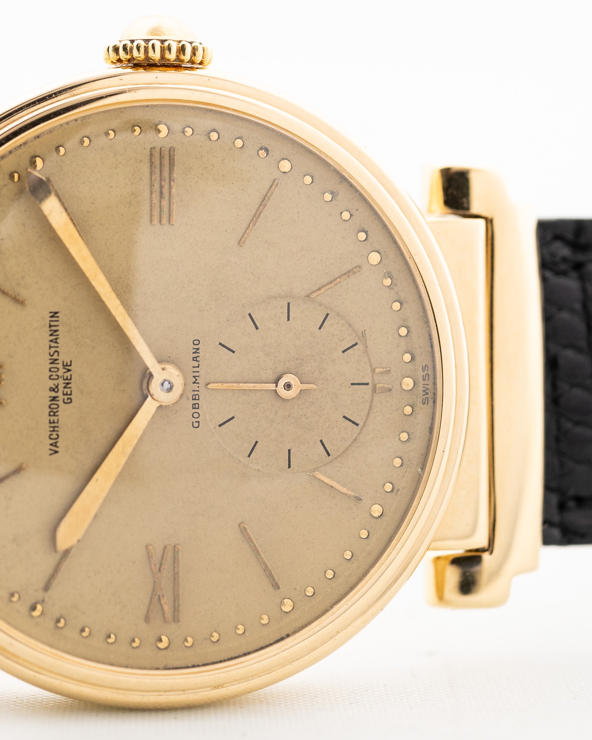 Nous avons ici une montre habillée Vacheron Constantin en or jaune 18 carats des années 1930, d'une grande beauté. Il pourrait s'agir d'une pièce 1/1 en raison des très rares cornes à capuchon et du cadran à double signature du négociant italien Gobbi Milano.