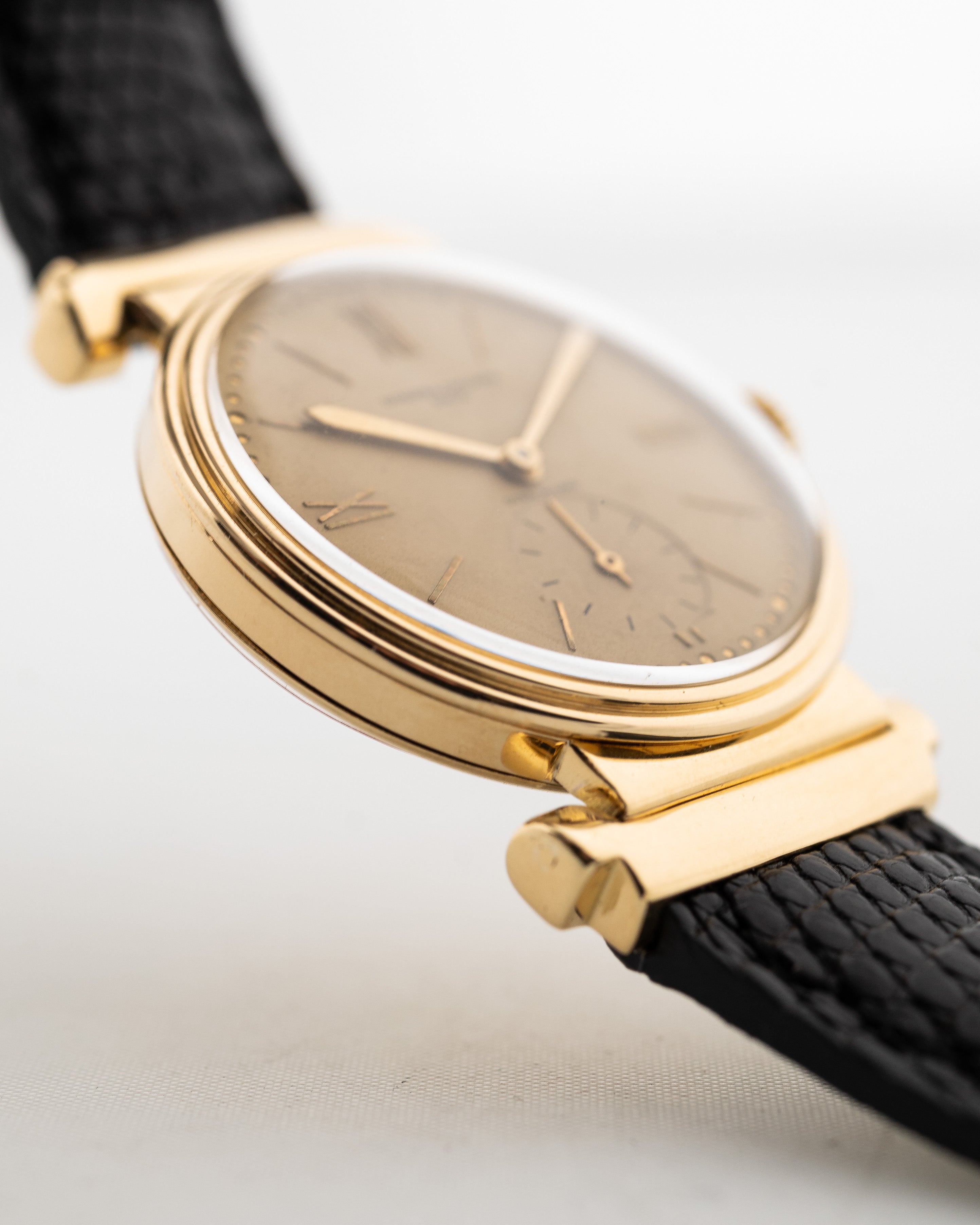 Cette pièce particulière se distingue par son magnifique cadran crème avec chiffres romains, son solide boîtier en or jaune 18 carats, une seconde sophistiquée et de superbes aiguilles Sword.