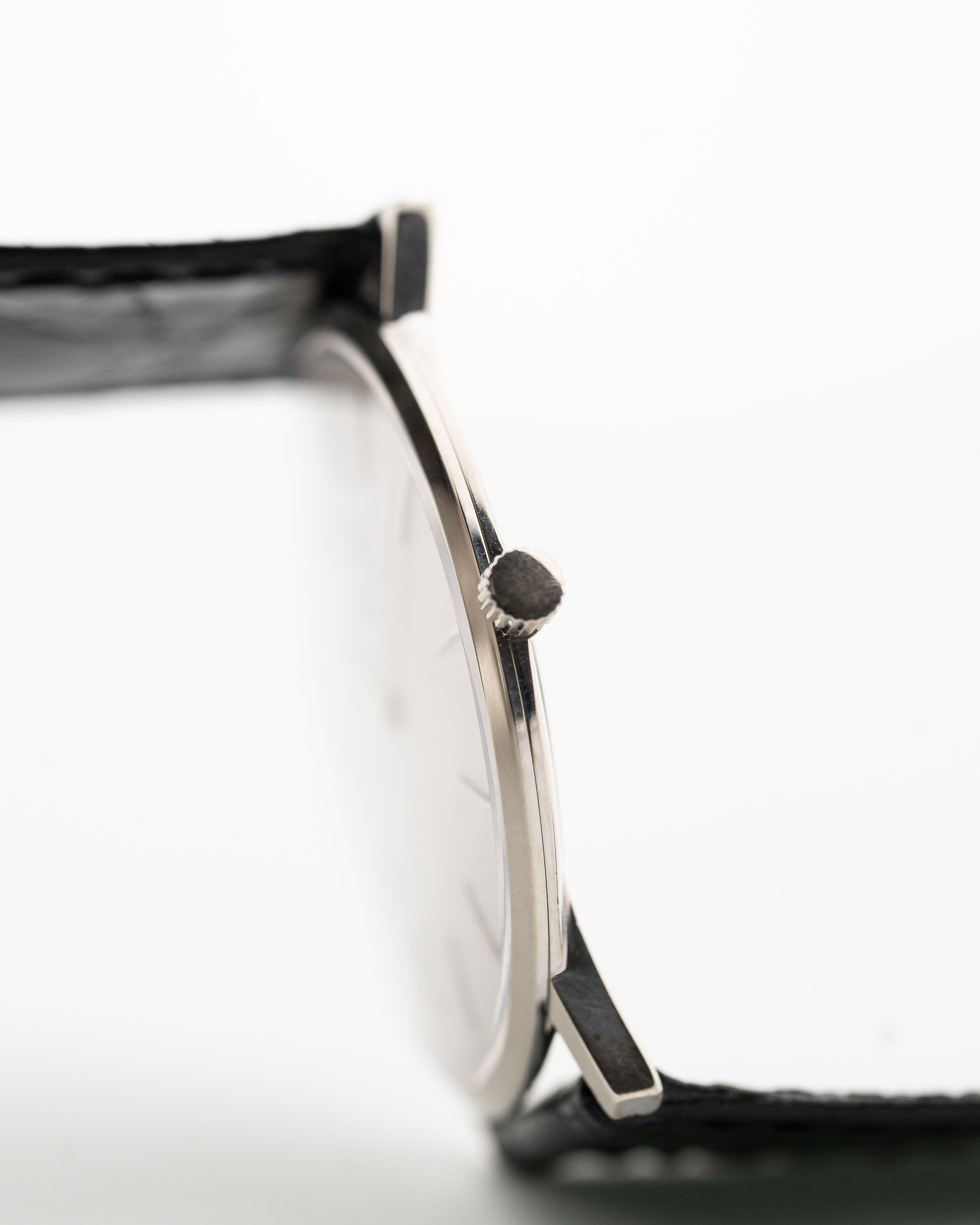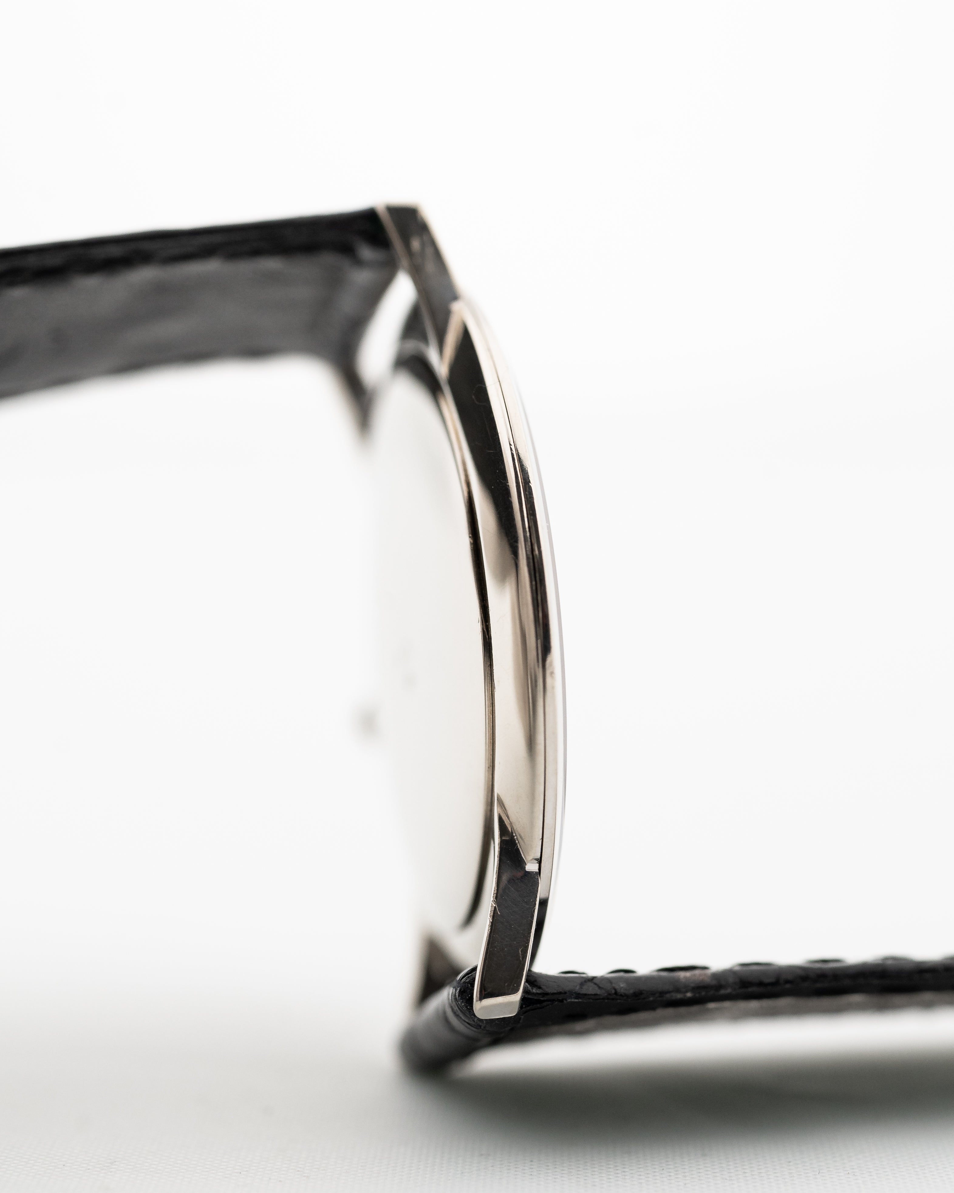 Cette pièce particulière se distingue par son magnifique cadran sobre et son solide boîtier en or blanc 18 carats non poli.