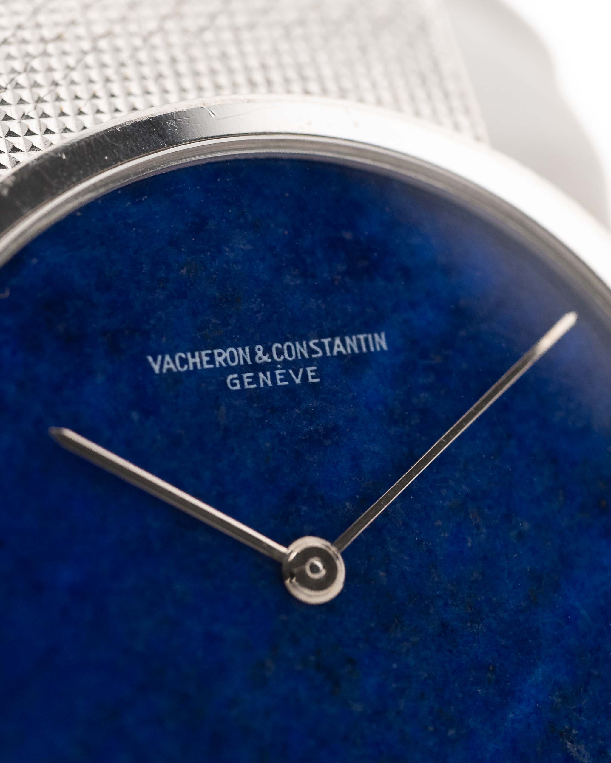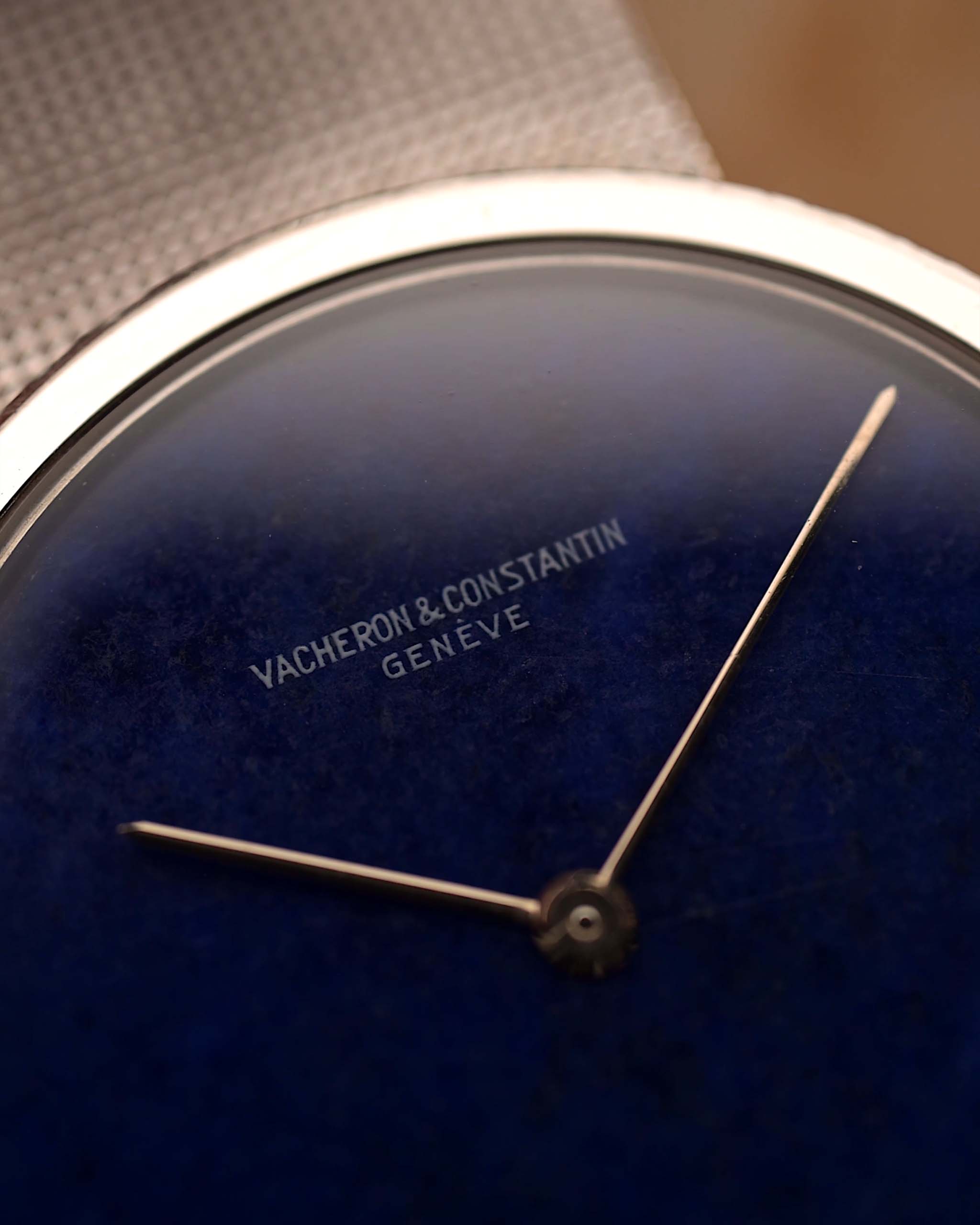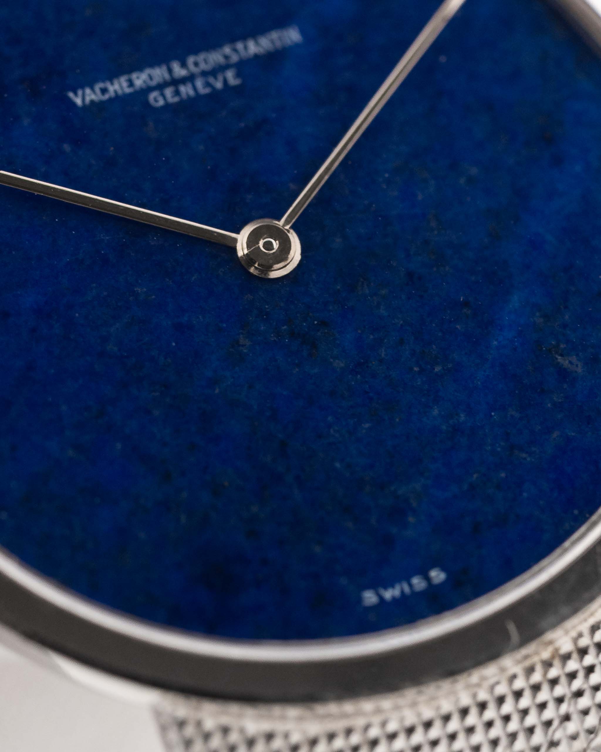 Le véritable point fort est le cadran en pierre lapis-lazuli d'un bleu profond, parfaitement conservé et intact, qui offre un contraste saisissant avec l'or blanc froid. La montre est animée par le légendaire Calibre 1003 de Vacheron Constantin, un mouvement manuel ultra-fin réputé pour son raffinement.