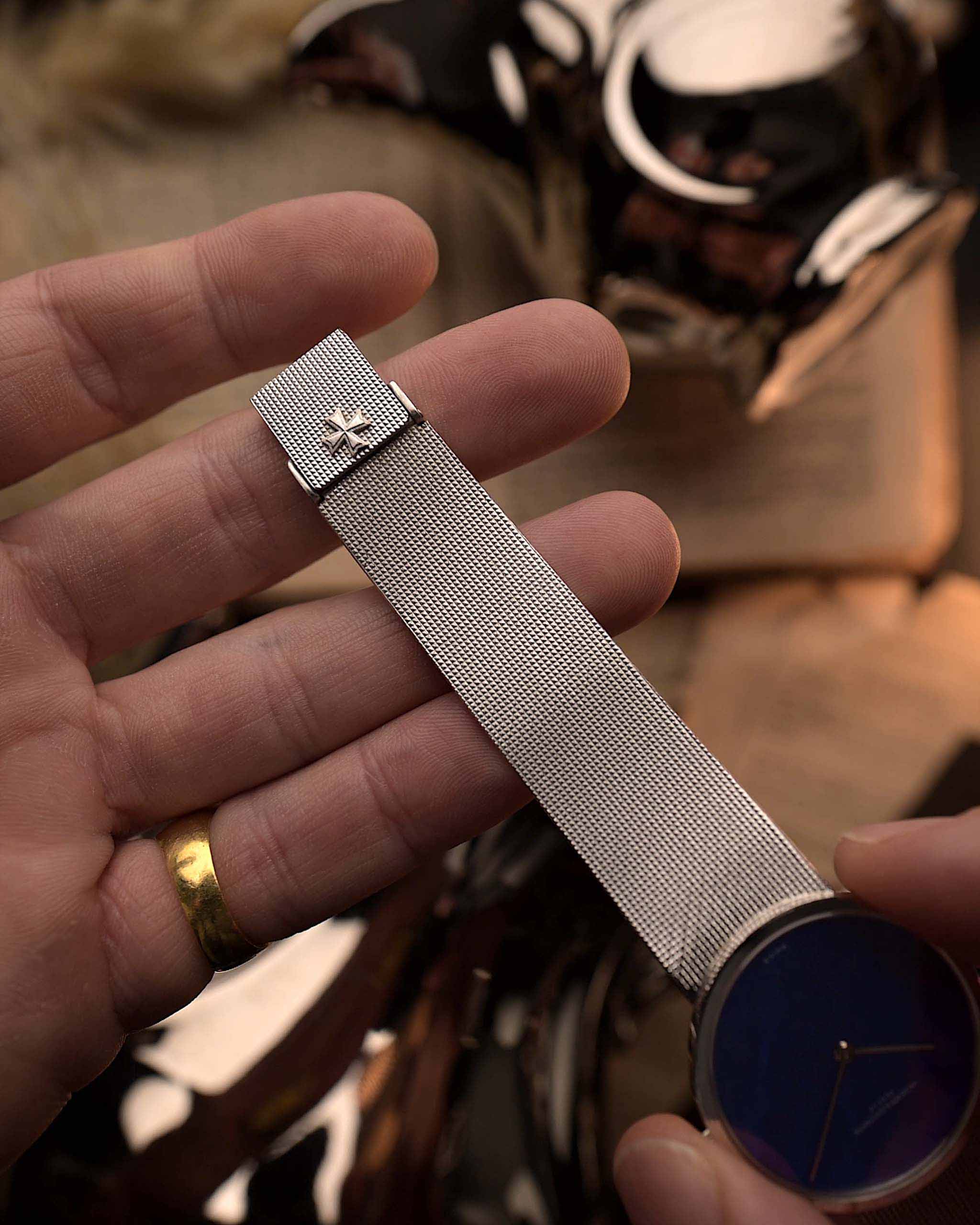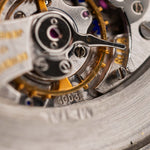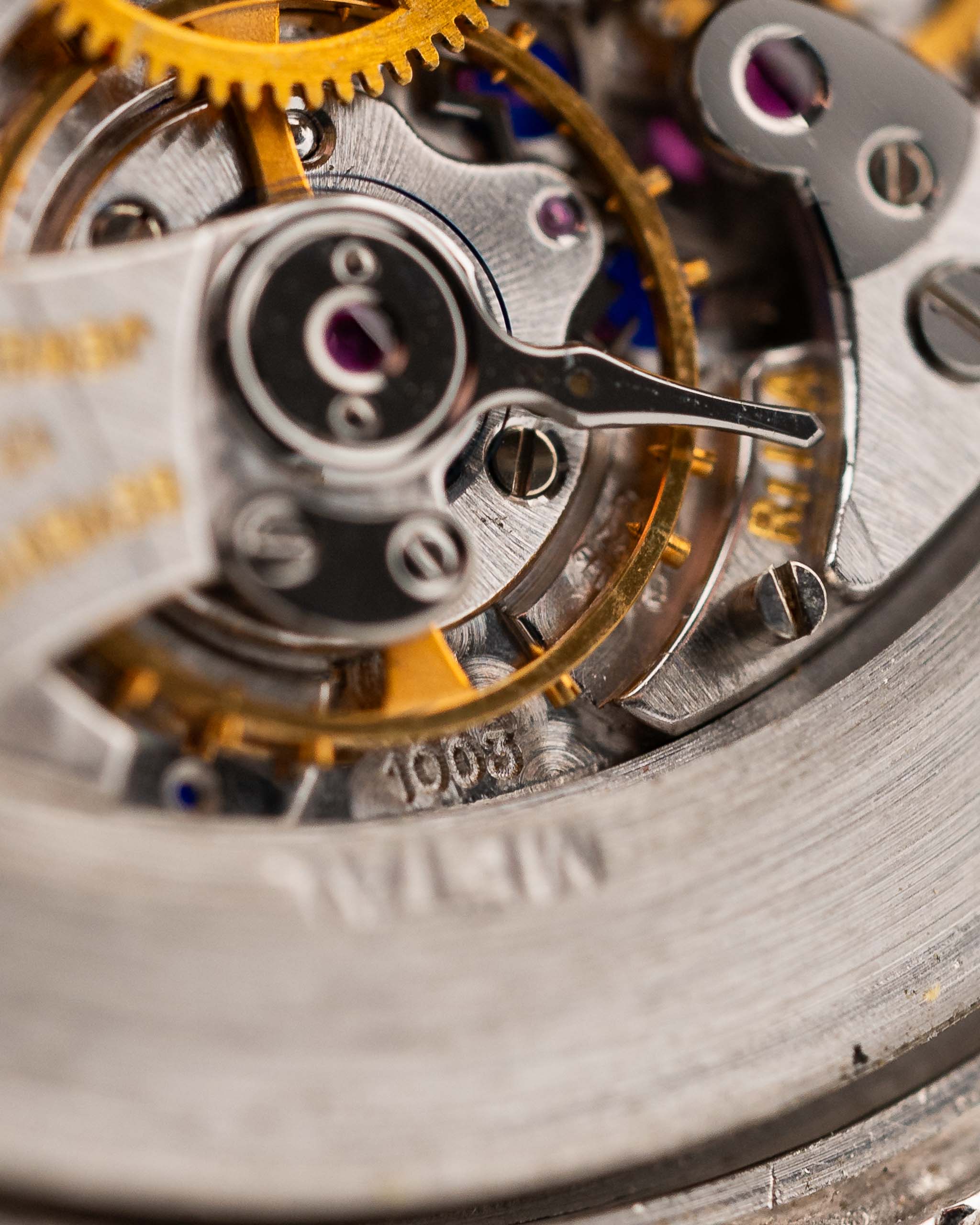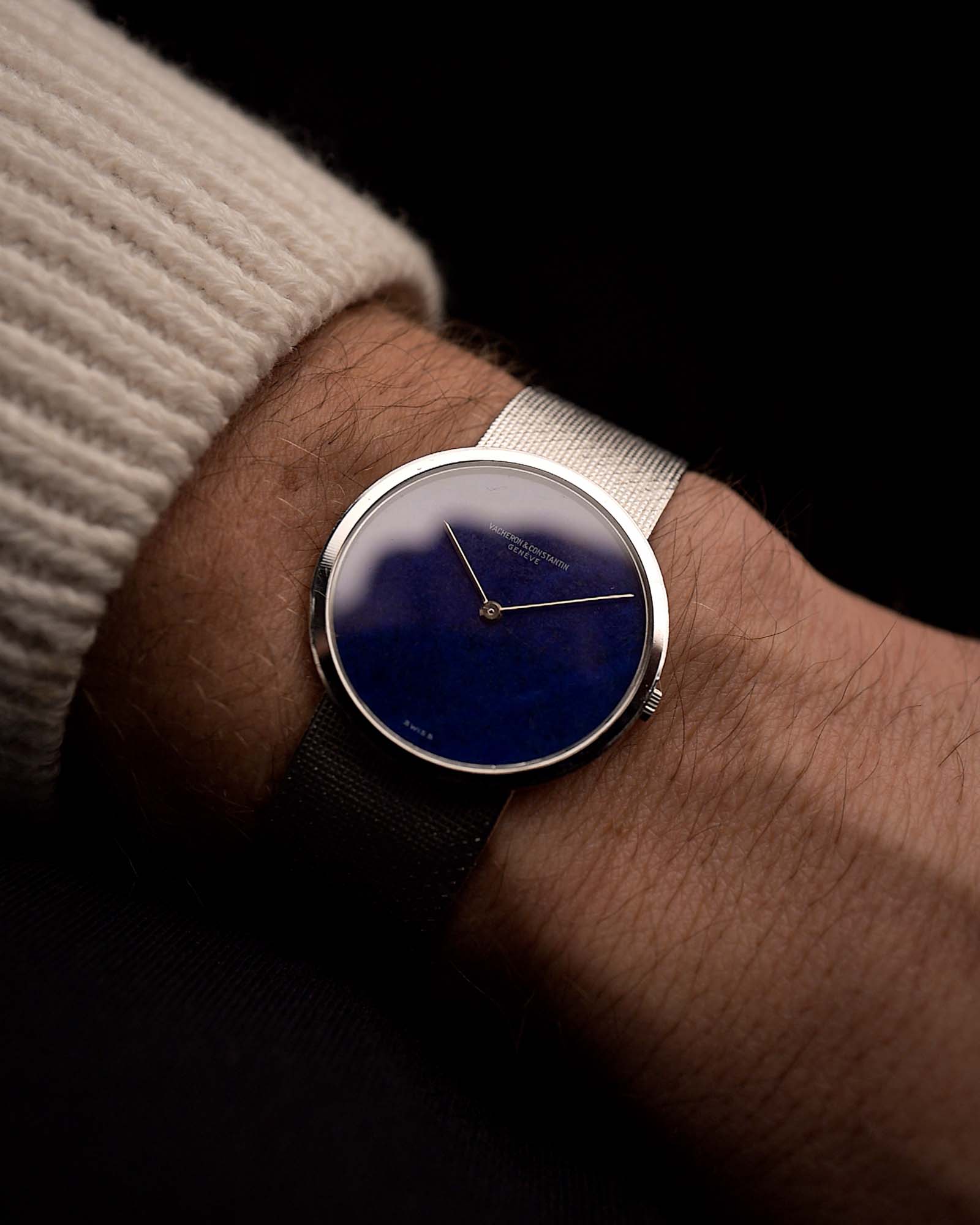 Le véritable point fort est le cadran en pierre lapis-lazuli d'un bleu profond, parfaitement conservé et intact, qui offre un contraste saisissant avec l'or blanc froid. La montre est animée par le légendaire Calibre 1003 de Vacheron Constantin, un mouvement manuel ultra-fin réputé pour son raffinement.