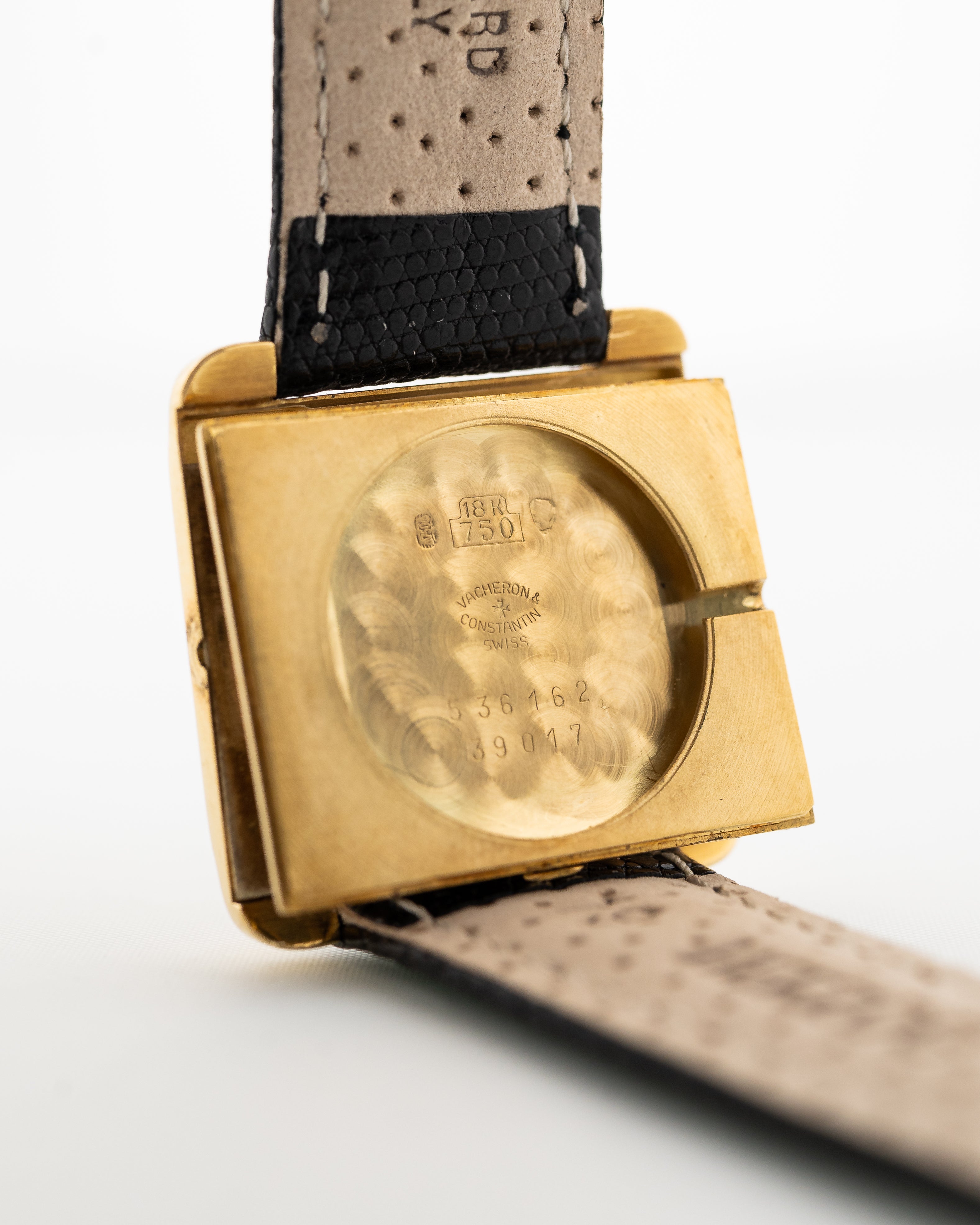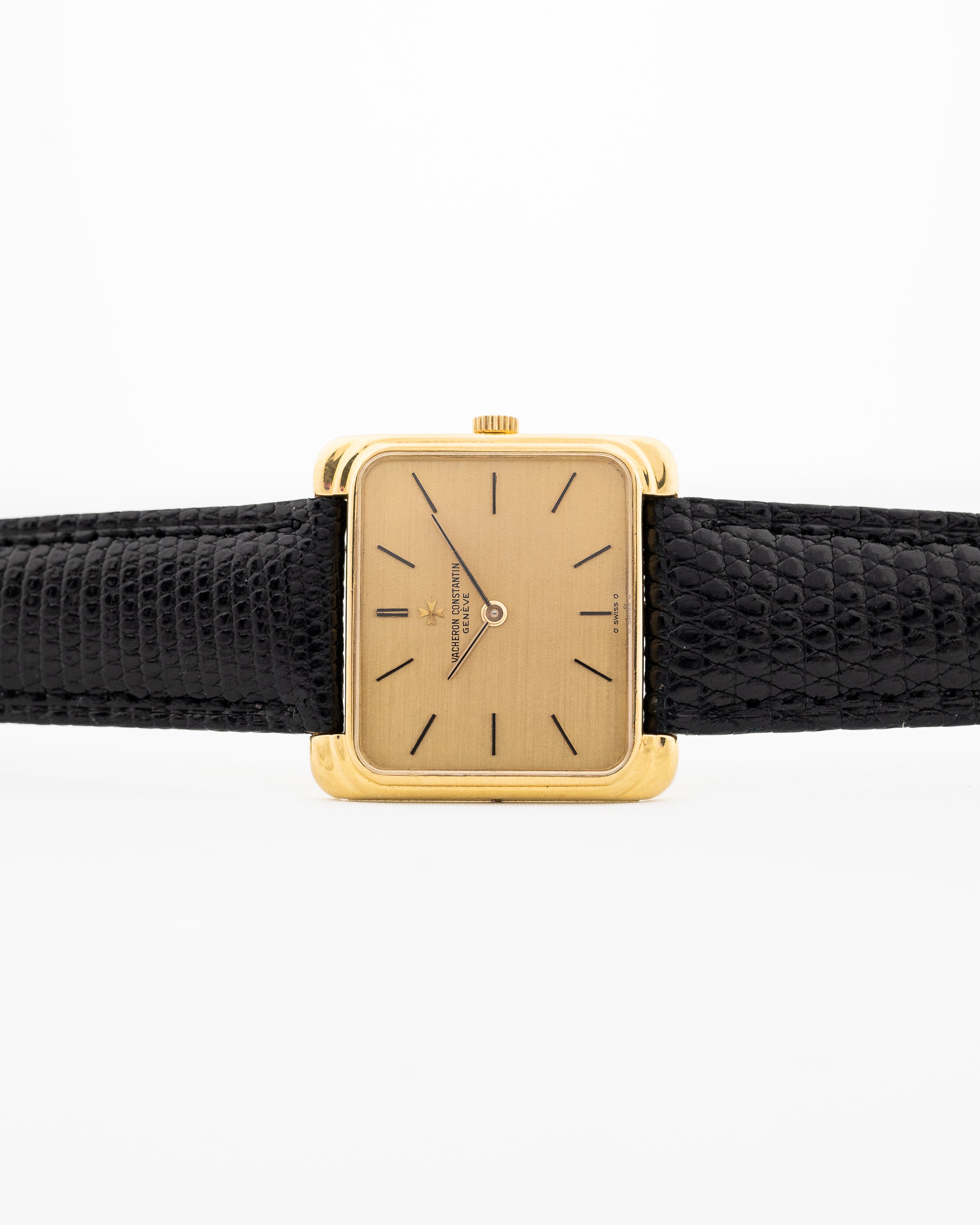Nous avons ici une montre habillée Vacheron Constantin en or jaune 18 carats magnifiquement finie, dans un design de char d'assaut des années 1970. Cette pièce particulière se distingue par son magnifique cadran sigma en or jaune 18 carats, son logo Vacheron appliqué et son solide boîtier en or jaune 18 carats non poli.