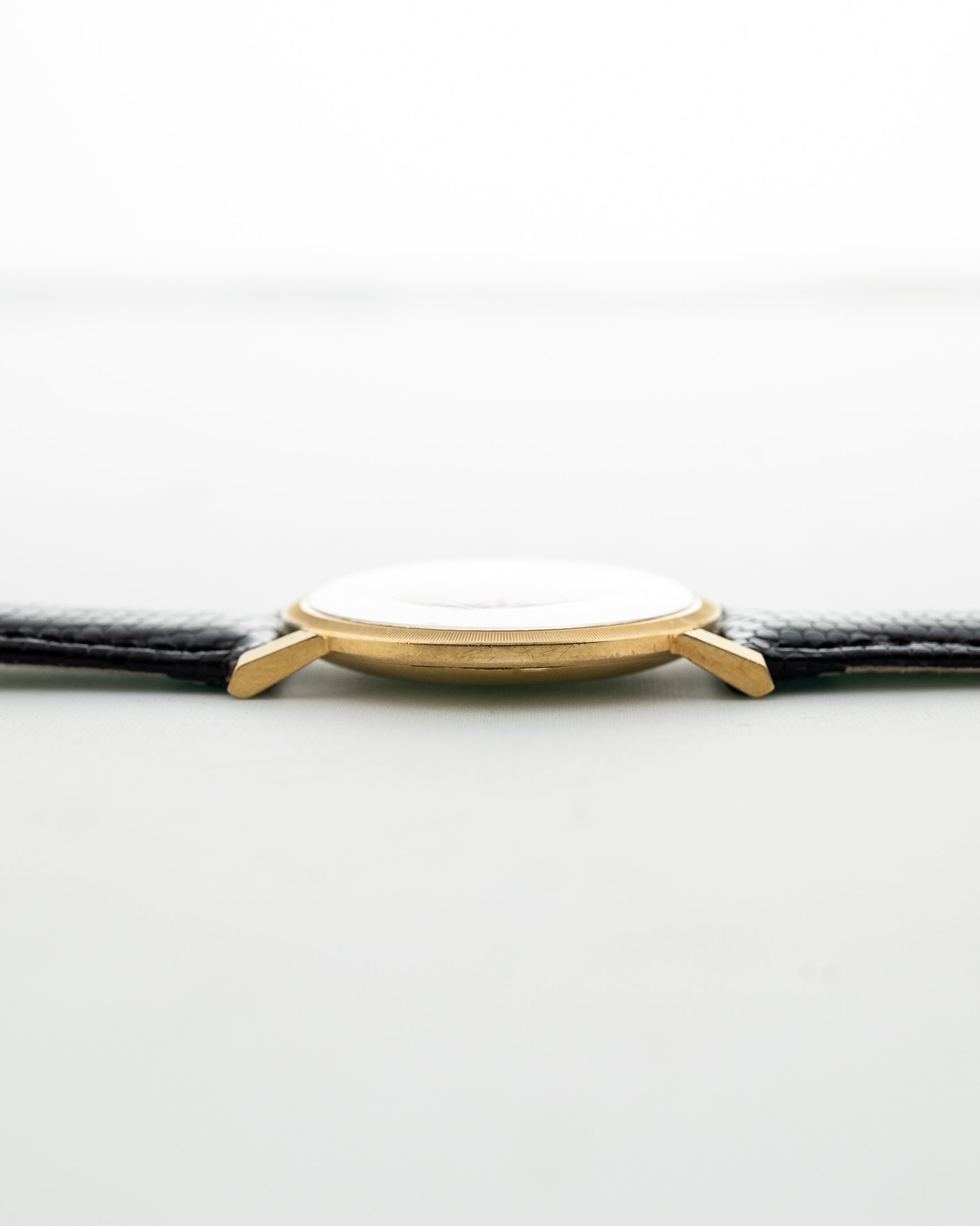 Cette pièce particulière se distingue par son magnifique cadran blanc et son solide boîtier en or jaune 18 carats non poli.