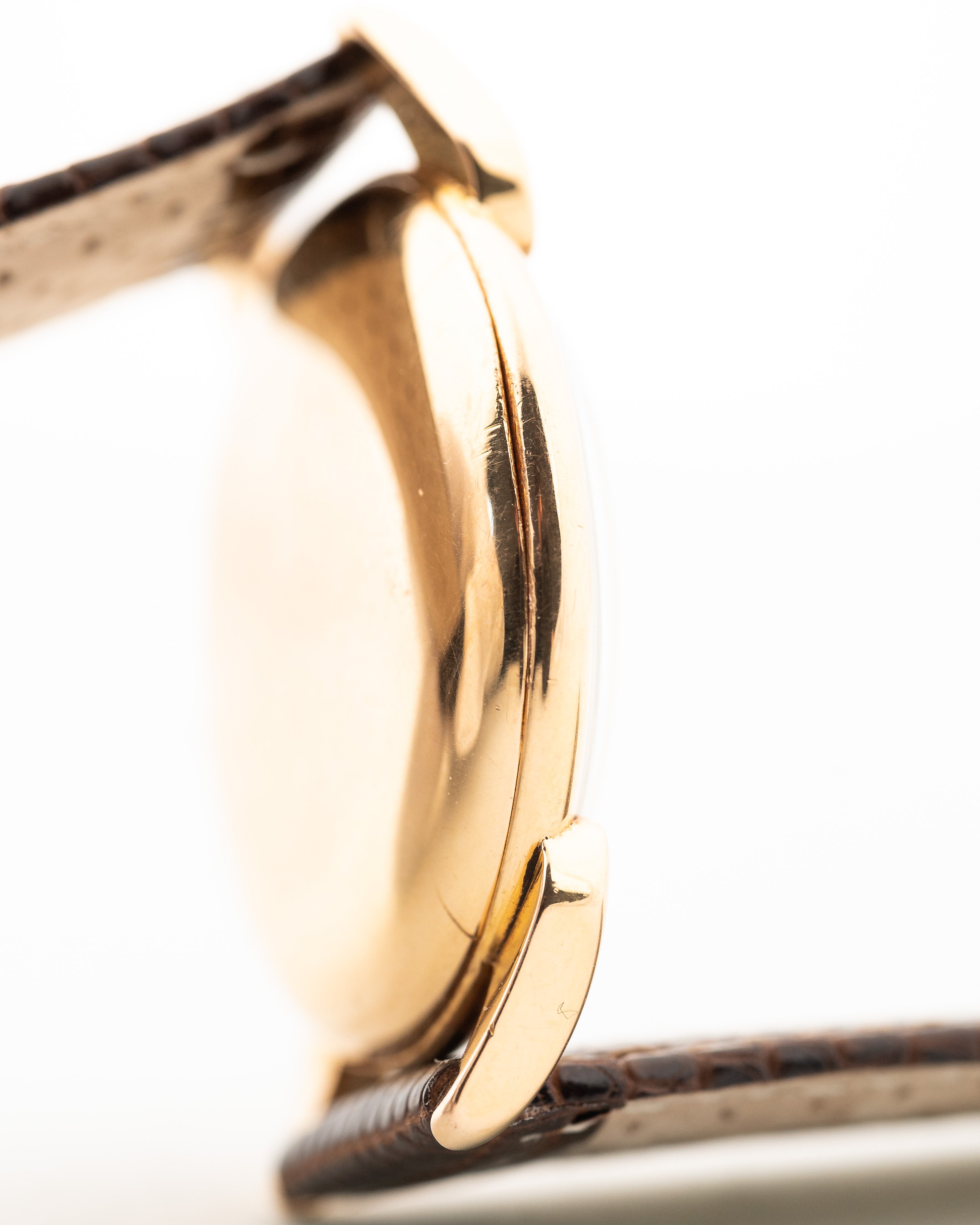 Cette pièce particulière se distingue par son état exceptionnel et son solide boîtier en or rose 18 carats. Elle est proposée dans une taille imposante de 38 mm.