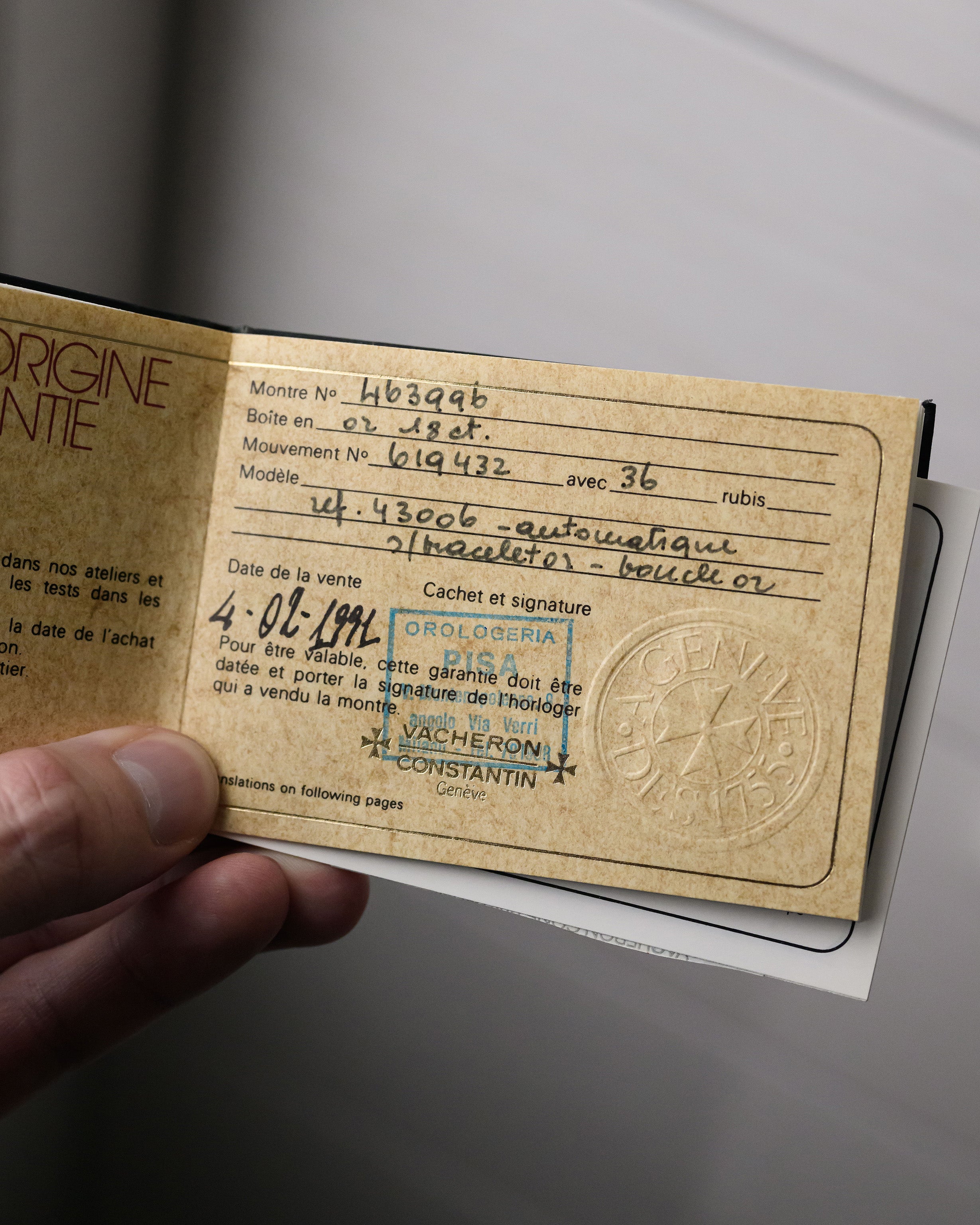 Elle est accompagnée de son certificat d'origine, d'un bracelet en cuir Vacheron et d'une boucle en or jaune 18 carats.