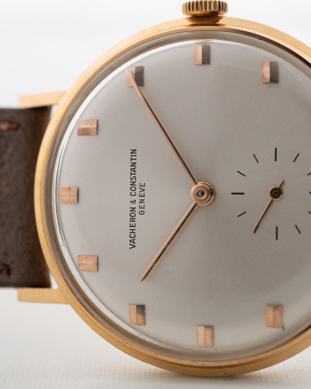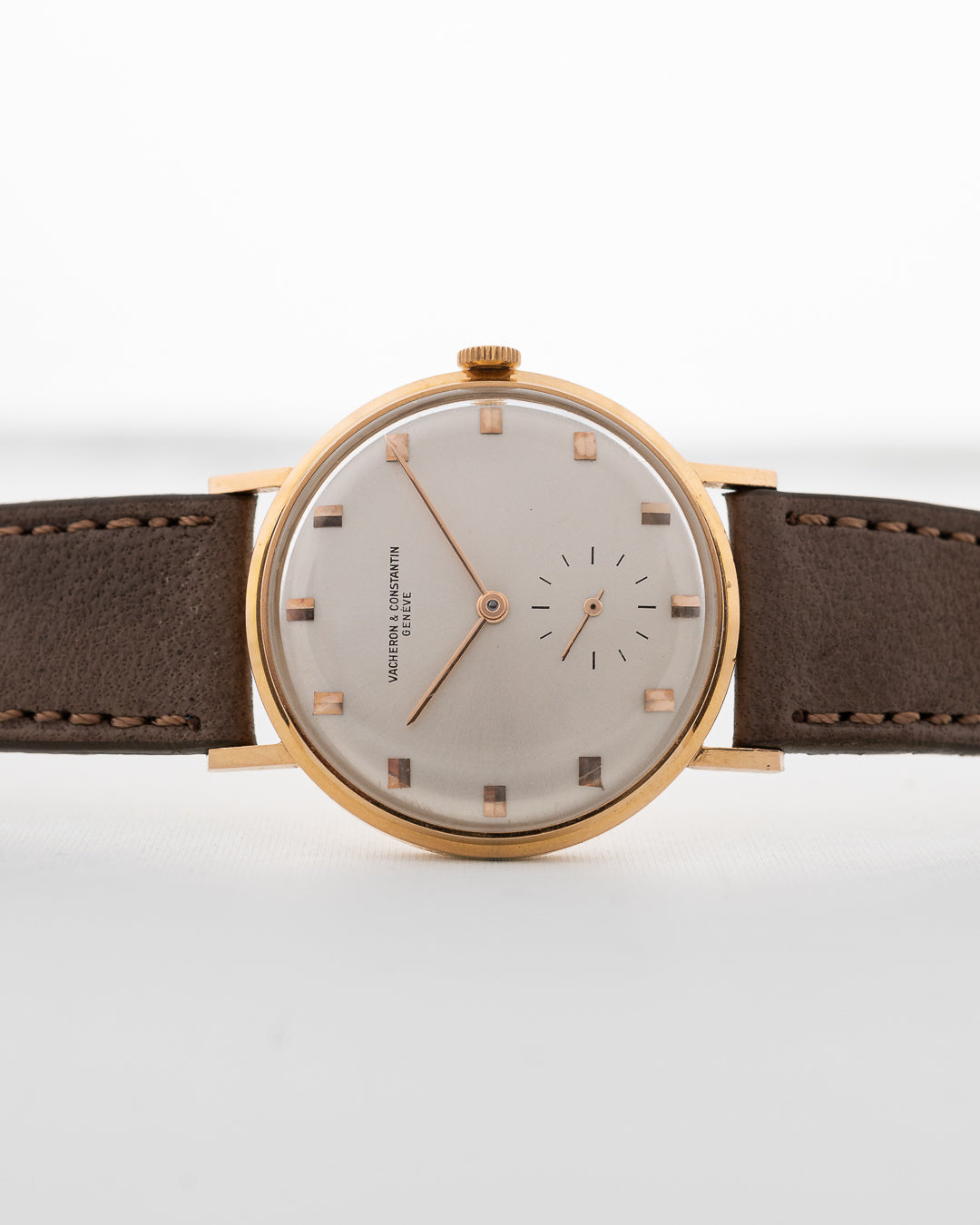 Nous avons ici une montre habillée Vacheron Constantin en or rose de 1960 d'une grande beauté, avec des index rectangulaires uniques et un cadran blanc étonnamment net avec une sous seconde.