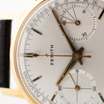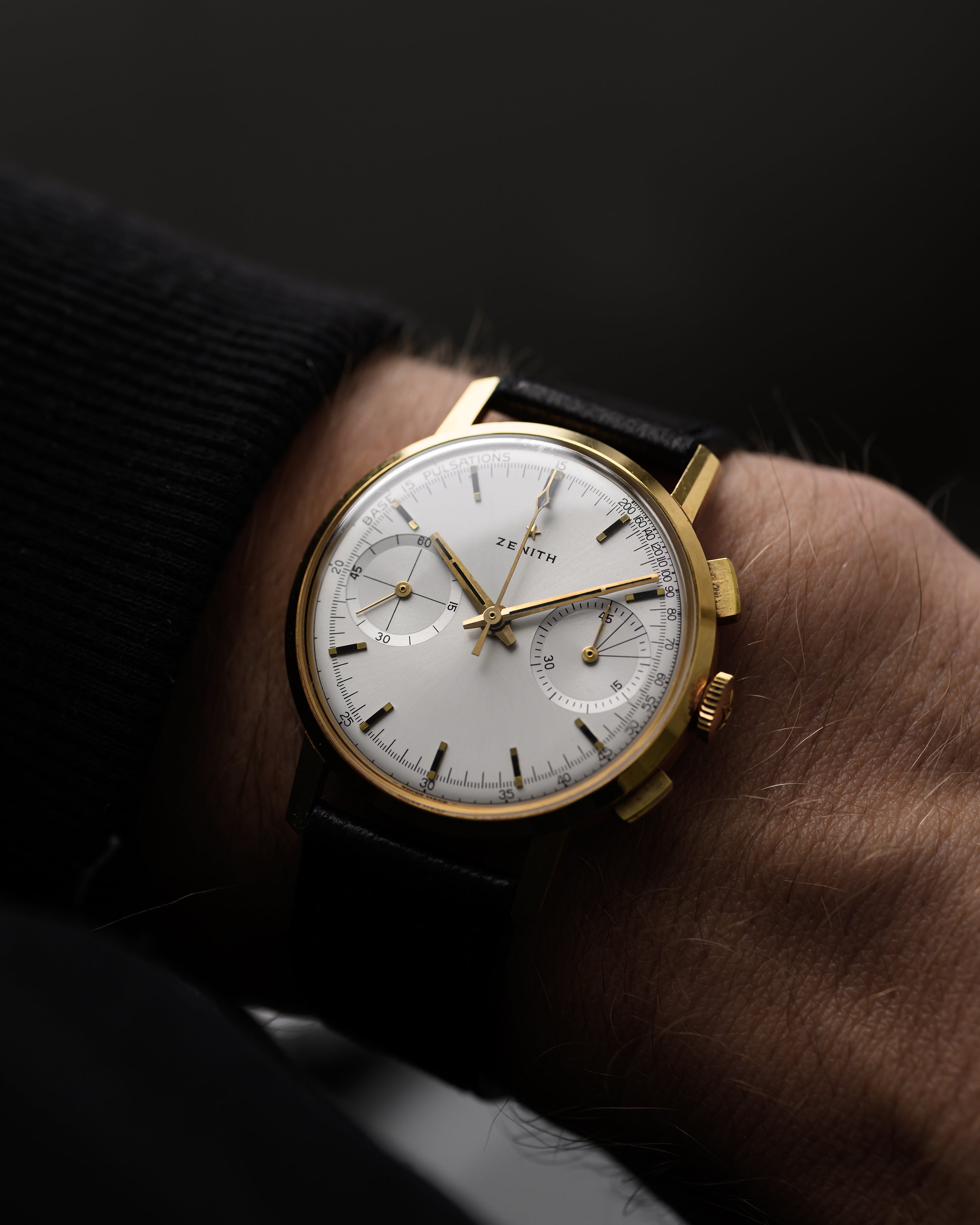 Voici un excellent exemple qui montre que Zenith est et a toujours été un fabricant suisse de premier plan qui ne se limite pas aux chronographes El Primero. Notre exemplaire est équipé du très réputé calibre Zenith 146, un mouvement de chronographe avec roue à colonnes conçu par Martel, une société qui a été absorbée par Zenith en 1960 et qui, avant cette date, fournissait des mouvements à d'autres fabricants tels qu'Universal Genève.