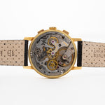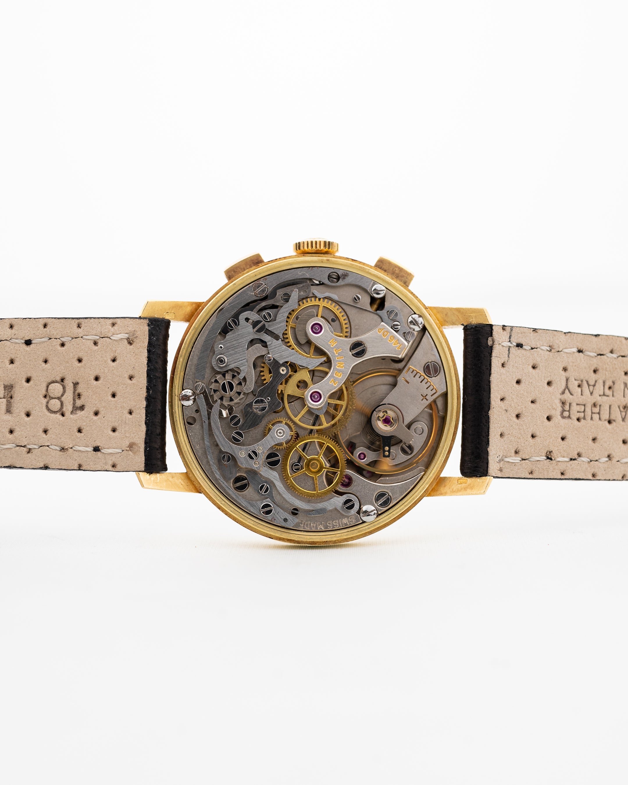 La montre que nous avons ici est exemplaire de la qualité de ce fabricant. Du boîtier en or jaune 18 carats au cadran soleillé blanc, en passant par le mouvement chronographe à remontage manuel Cal 146, cette montre est vraiment magnifique.