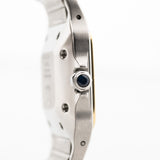 Questo Cartier Santos Carrée in acciaio inossidabile bicolore colpisce per il quadrante bianco, le lancette in acciaio azzurrato e, naturalmente, per gli accenti in oro 18 carati.