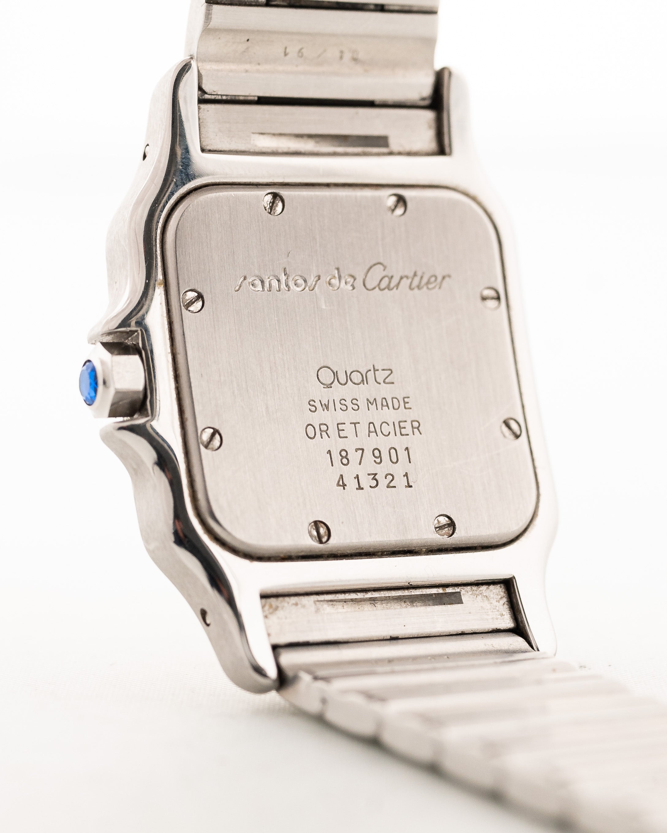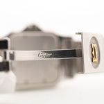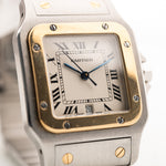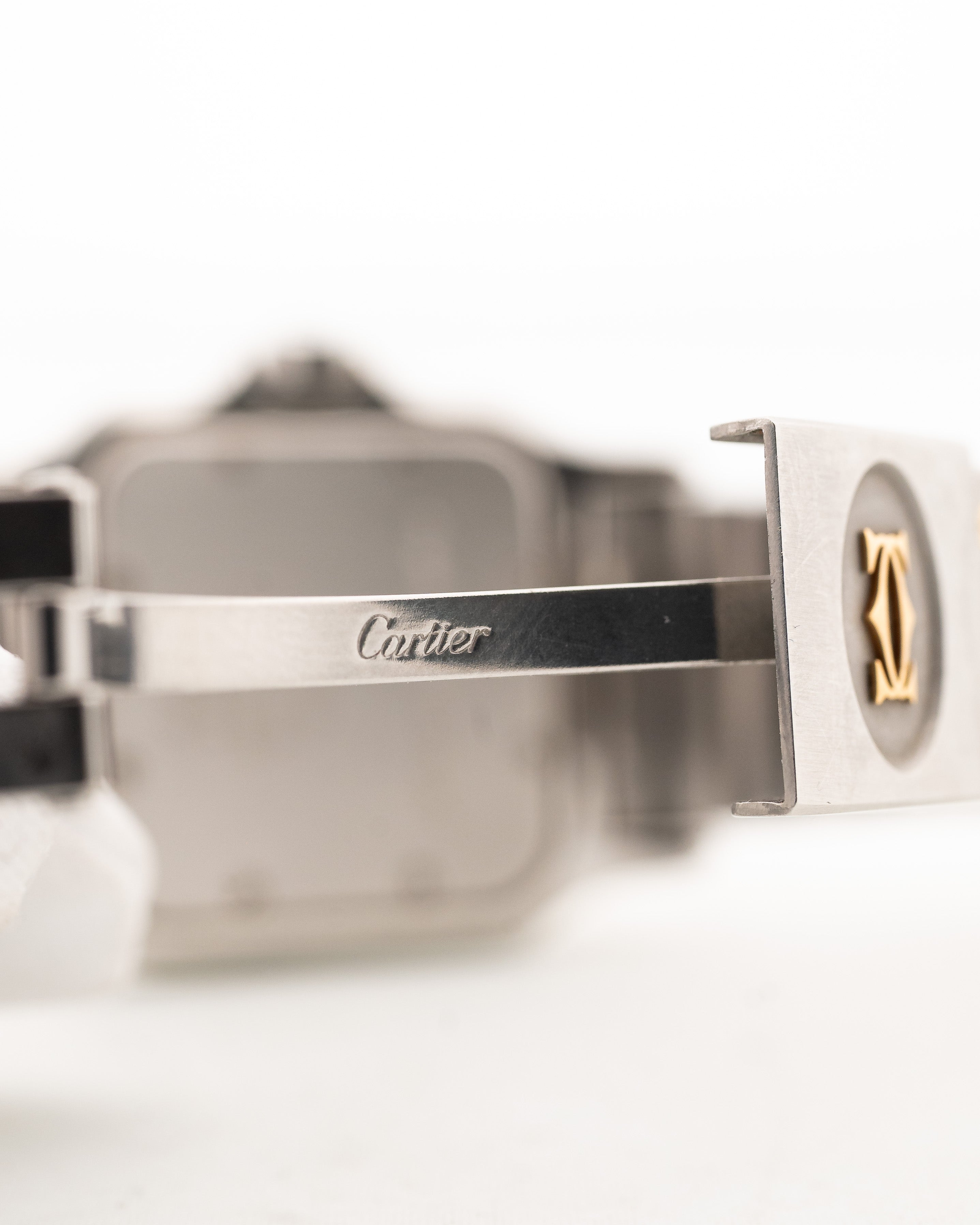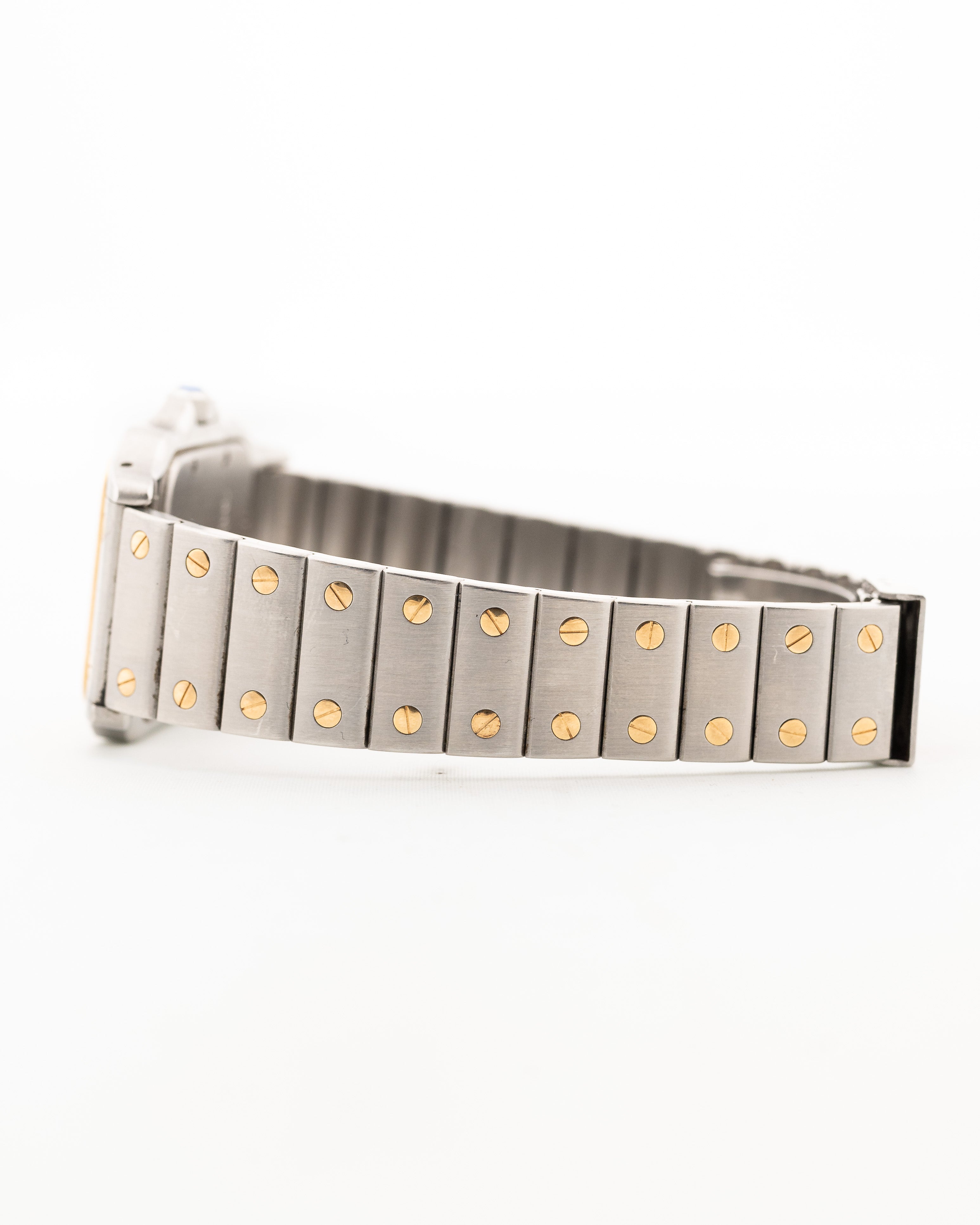 Questo Cartier Santos Galbée in acciaio inossidabile bicolore colpisce per il suo bellissimo e rarissimo quadrante marrone, le lancette in acciaio azzurrato e, naturalmente, i numeri romani neri.
