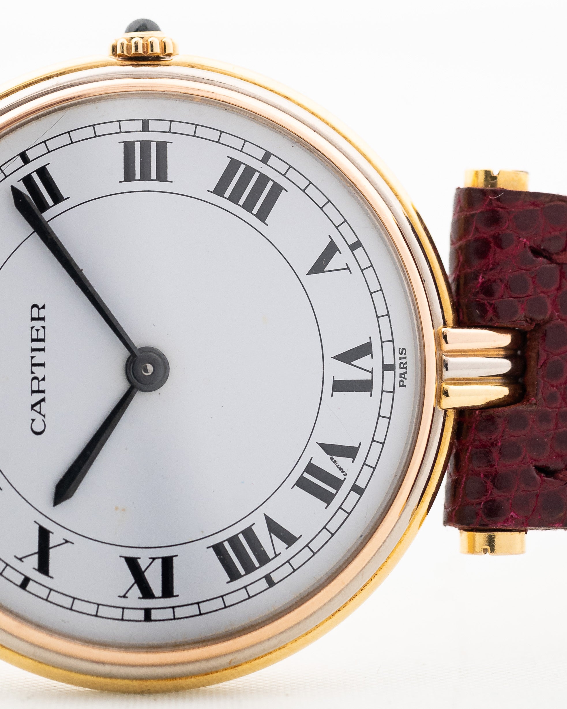 Il nostro Cartier Vendome Trinity in oro giallo 18 carati, a tre toni, colpisce per il quadrante bianco, le lancette in acciaio nero, i numeri romani e, naturalmente, per le tre tonalità d'oro (oro giallo, oro rosa, oro bianco) presenti nella parte anteriore della cassa.