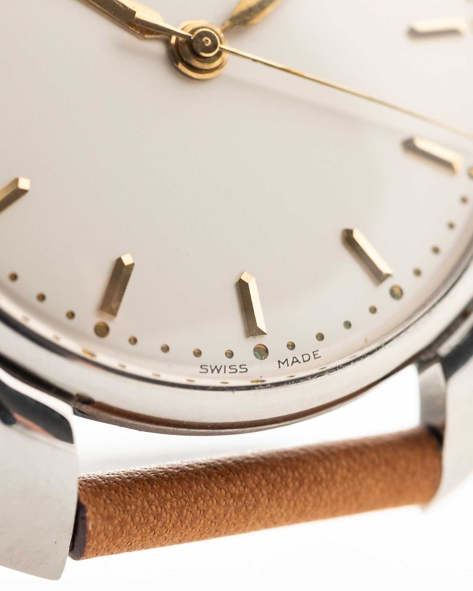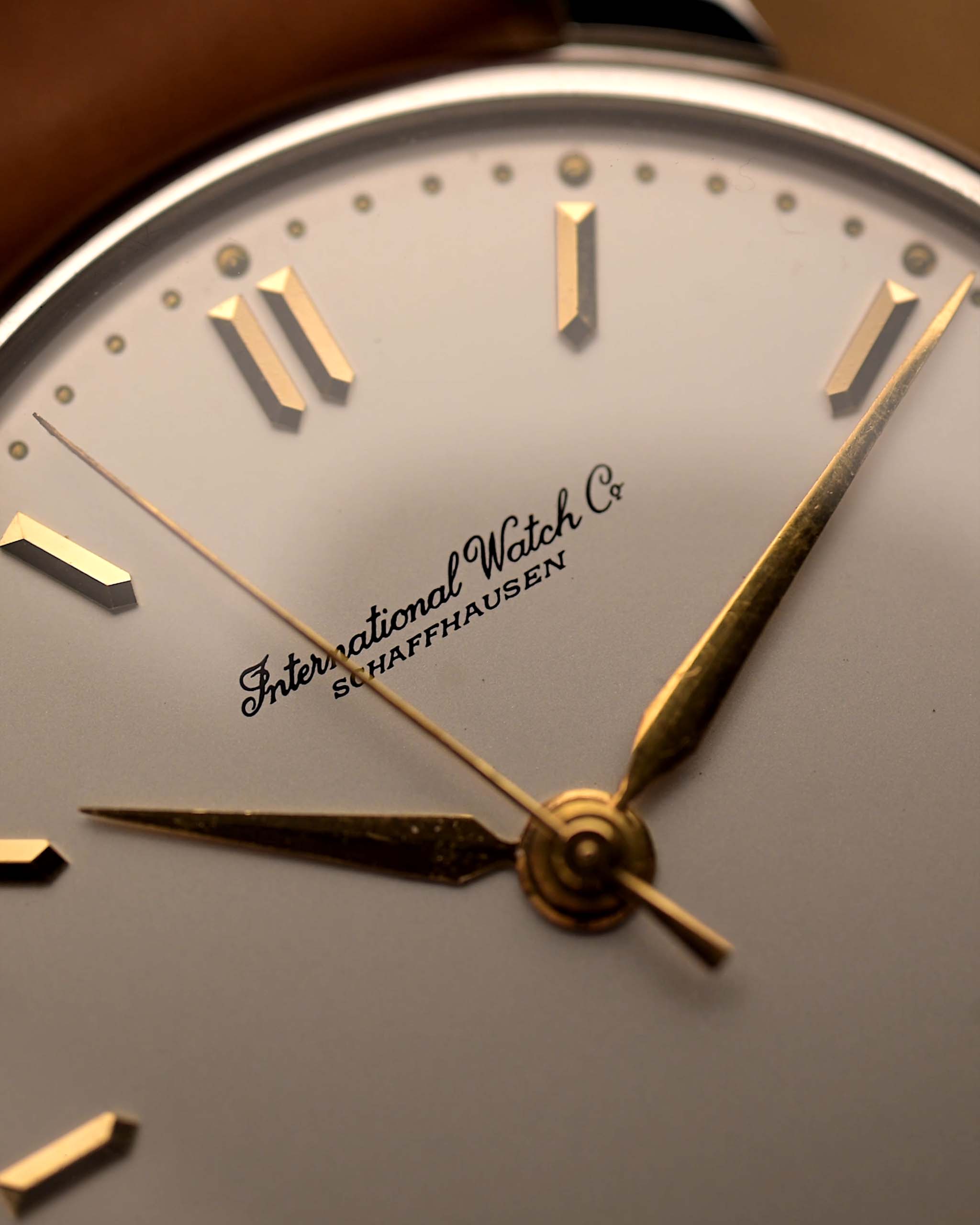 Il quadrante argentato rimane intatto e splendidamente conservato, completato da lancette e indici dorati che aggiungono calore ed eleganza senza tempo. All'interno batte il leggendario IWC Cal. 89, un movimento a carica manuale rinomato per la sua durata e precisione.