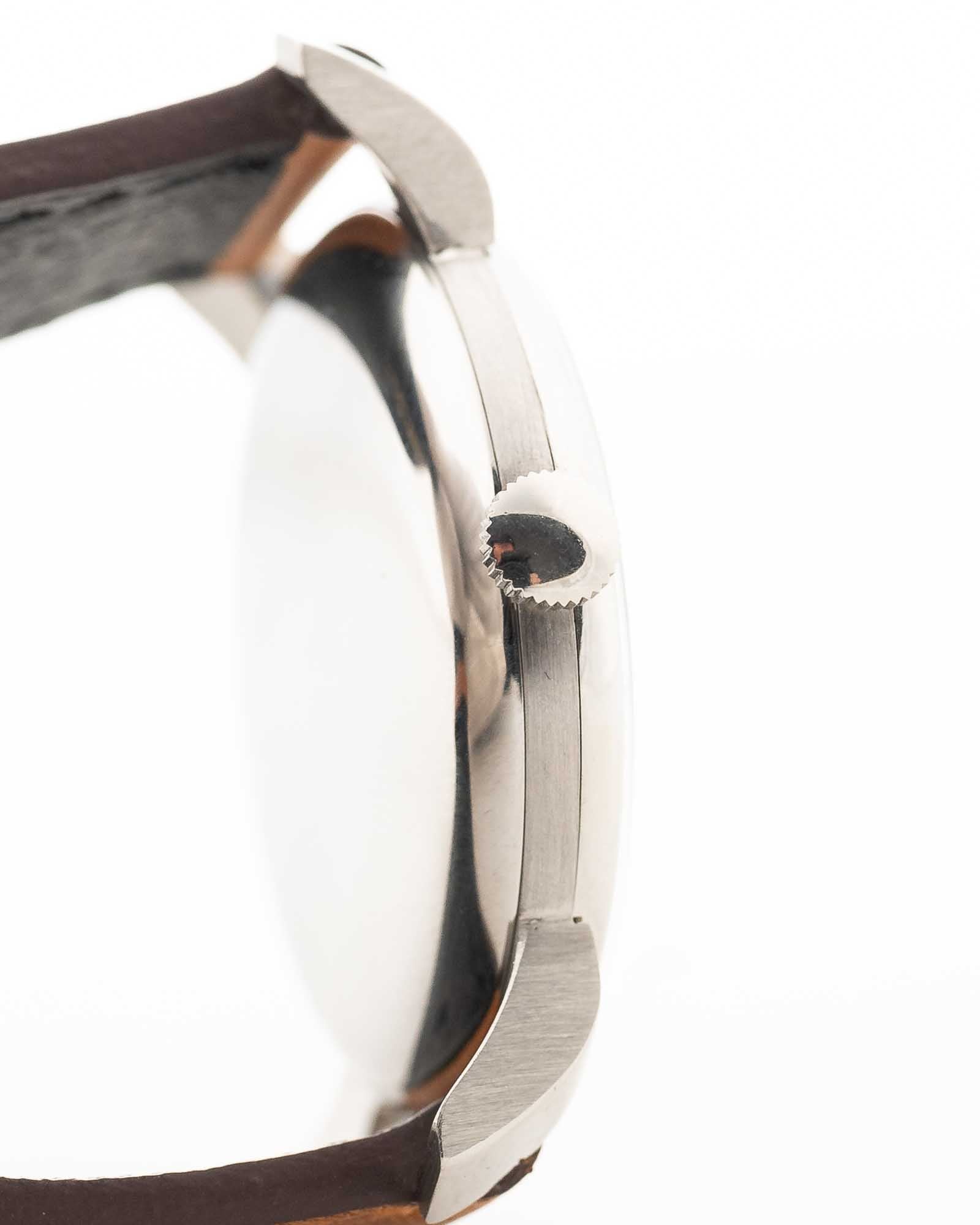 Un classico orologio da cerimonia IWC del 1948, che mette in risalto la maestria del marchio nel design sobrio e nell'affidabilità meccanica. Realizzato in acciaio inossidabile, l'orologio si distingue per le anse spesse e rivolte verso il basso, che gli conferiscono una forte presenza al polso, apparendo più grande del suo diametro di 35 mm.