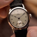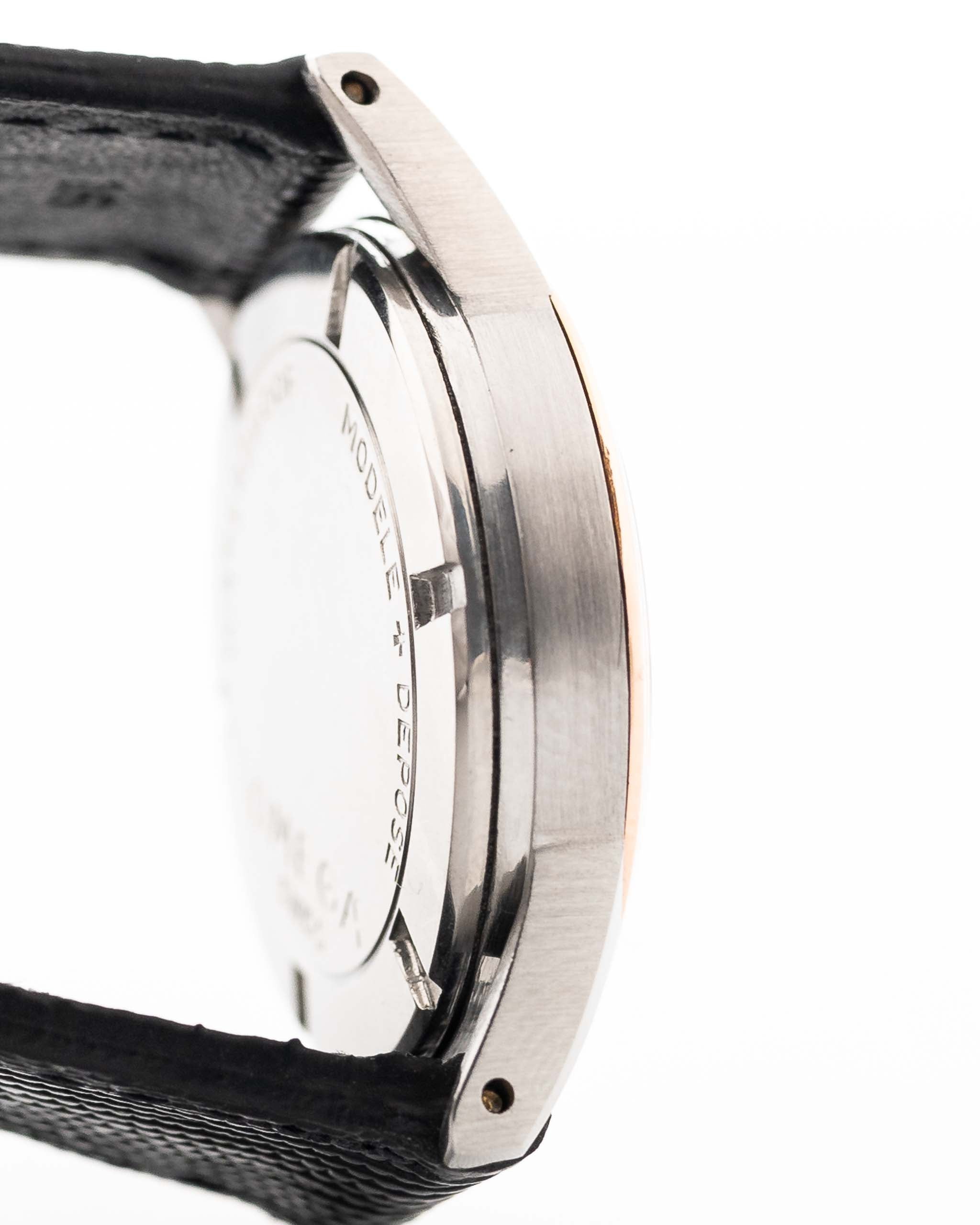 La sua affilata cassa in acciaio inossidabile da 28,5 mm presenta un'elegante lunetta in oro rosa, che offre un sottile contrasto e un fascino vintage. Le proporzioni pulite e le dimensioni rare lo rendono un pezzo ideale per i collezionisti che apprezzano la raffinatezza senza ostentazione.