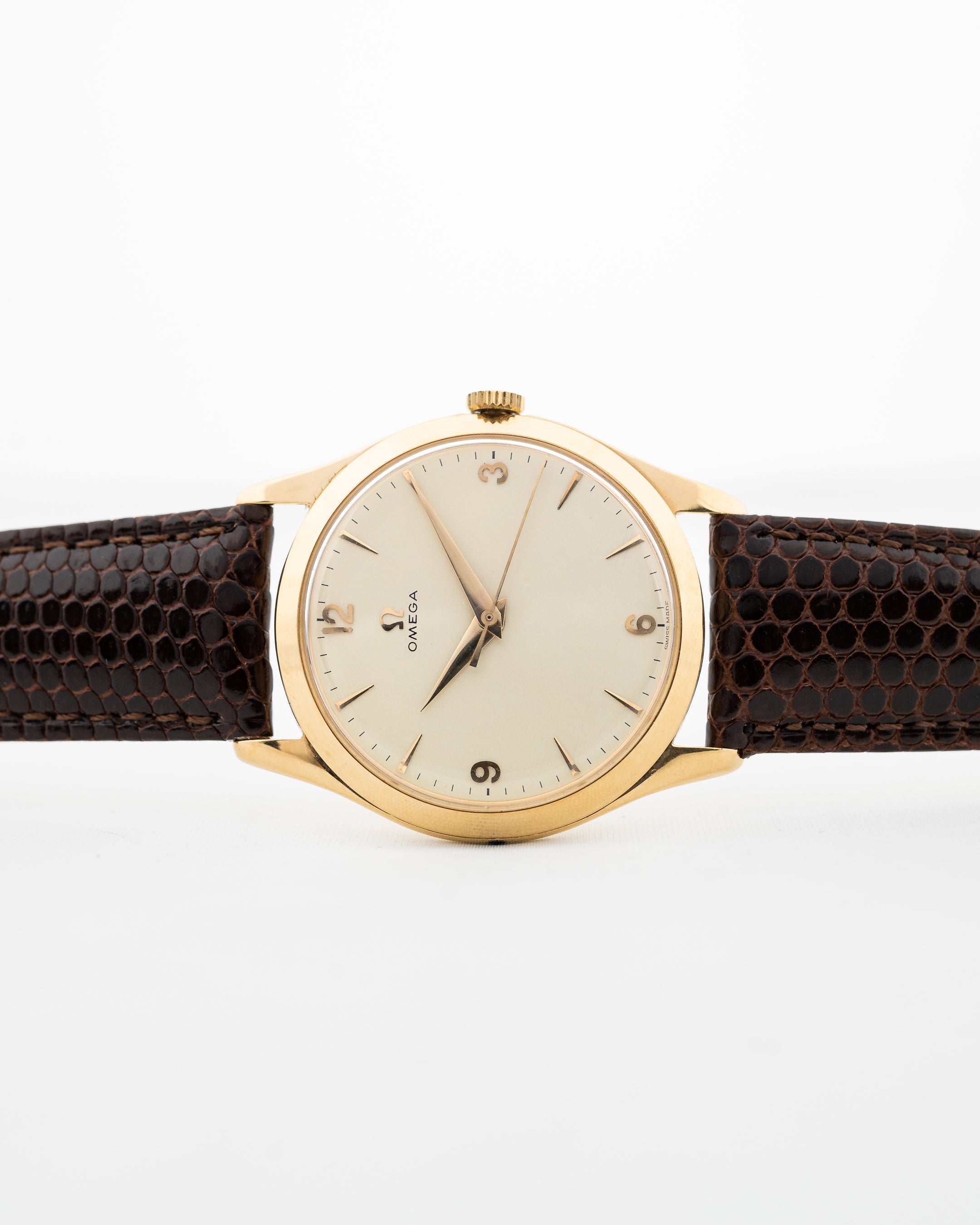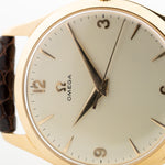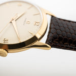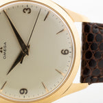 Qui può vedere un affascinante orologio da abito realizzato da Omega nel 1950. Presenta una cassa oversize da 36 mm in oro giallo 18 carati con grandi anse angolate e uno splendido quadrante pulito color crema con indici in oro giallo, un pezzo straordinario che lascia senza fiato.