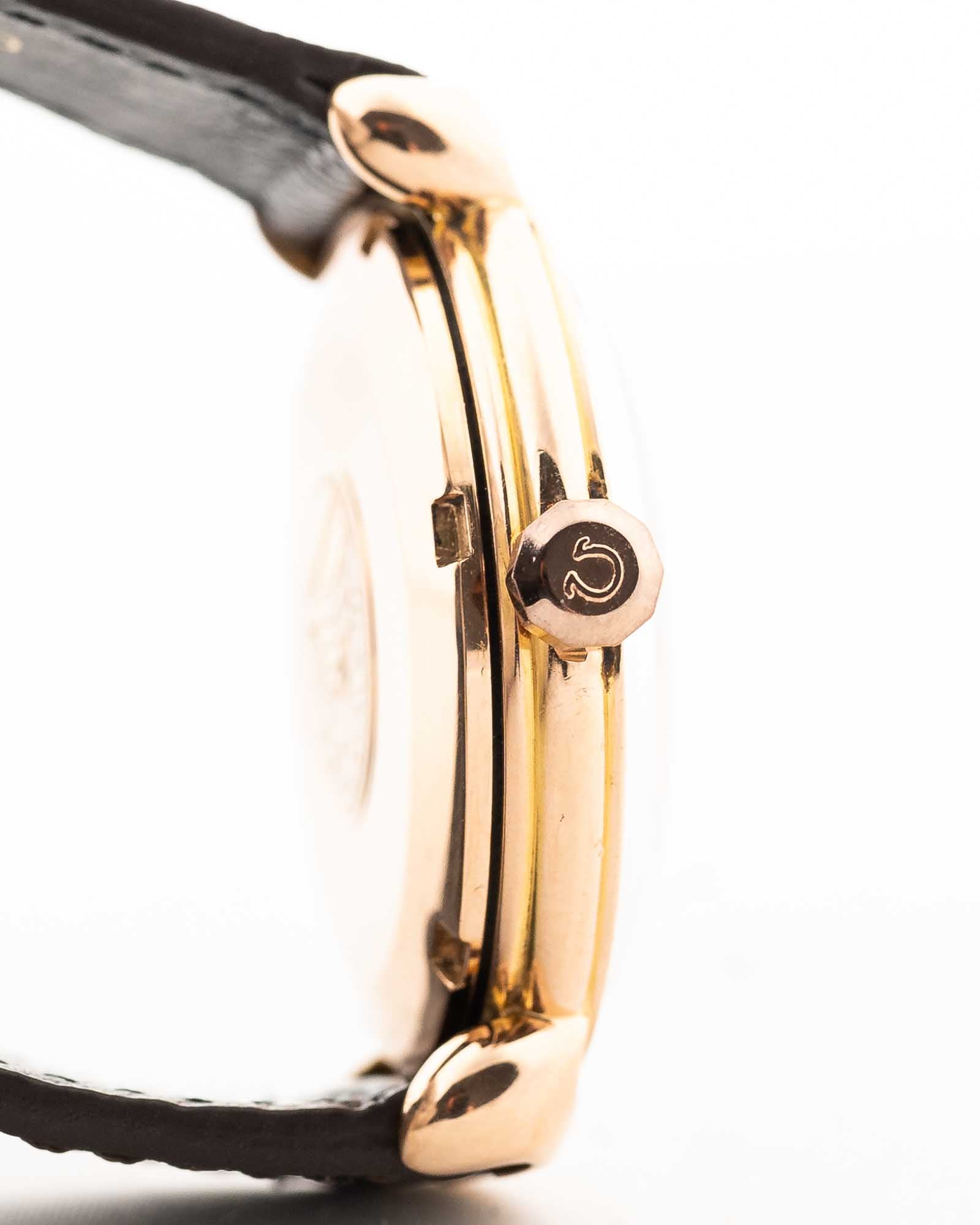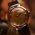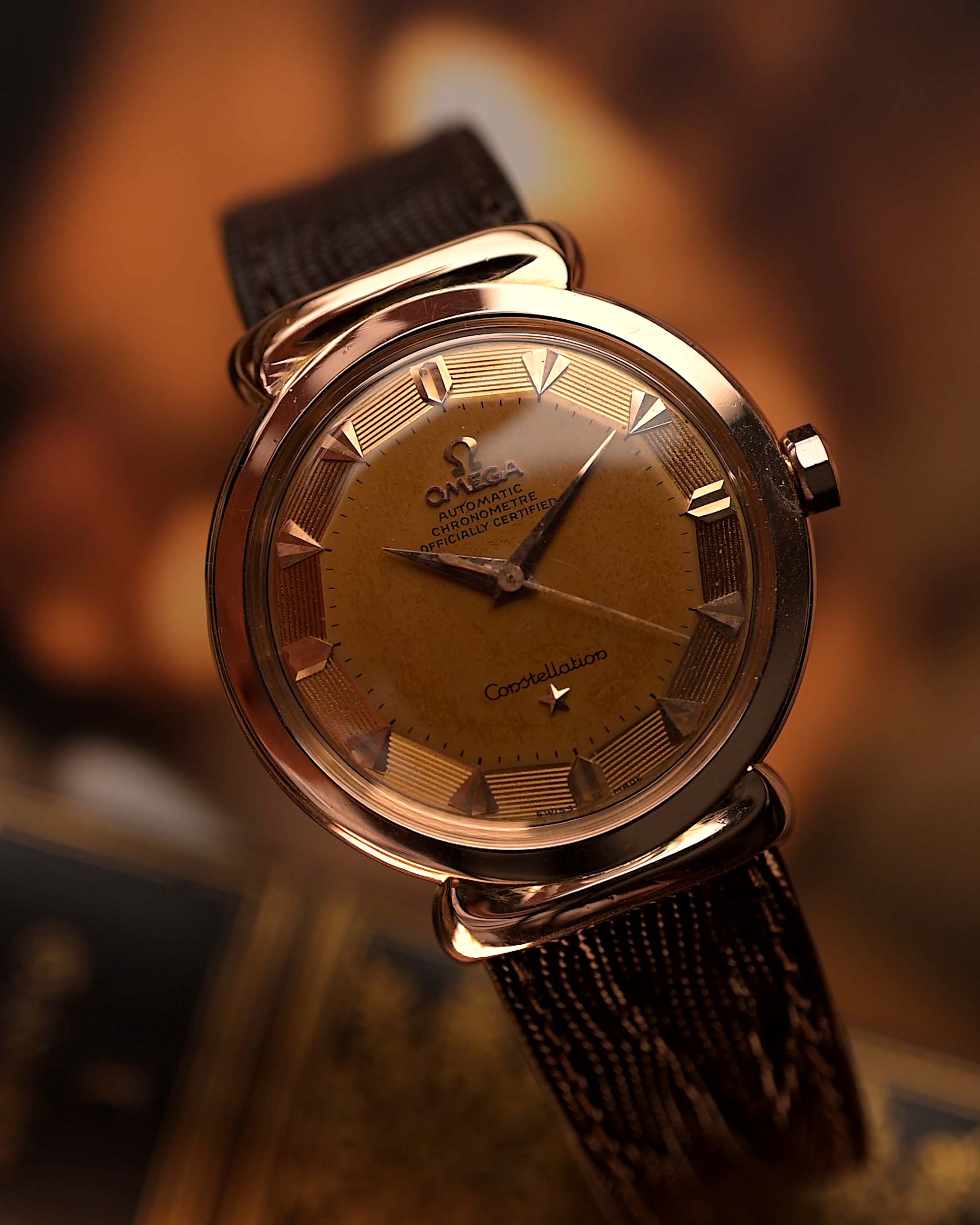 Questo Omega Constellation del 1954 rappresenta l'apice dell'orologeria svizzera della metà del secolo. Realizzato in oro rosa 18 carati, presenta l'iconico quadrante pie pan, un linguaggio di design che conferisce profondità, simmetria e presenza, il tutto racchiuso in una cassa dalle dimensioni perfette di 35 mm e con anse a cappuccio davvero uniche.