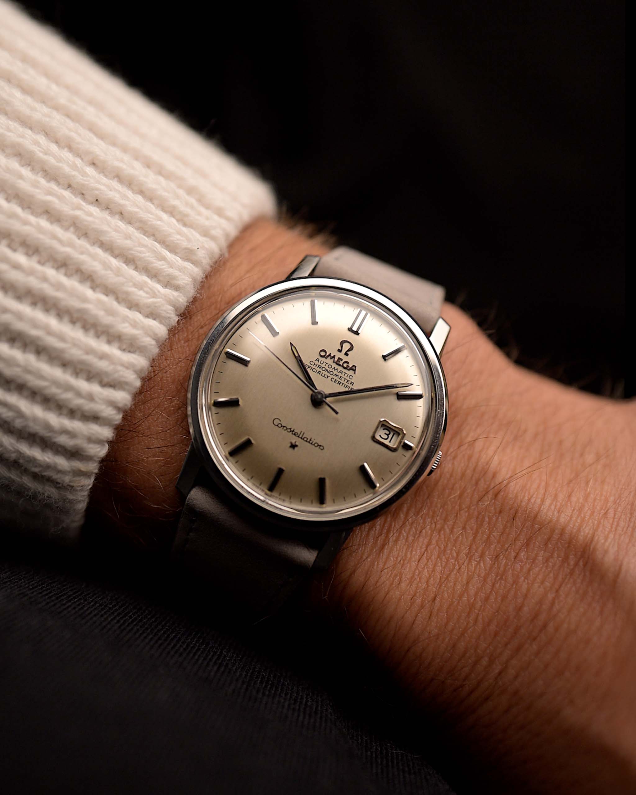 Questo compatto e bellissimo cronometro automatico Omega Constellation ha tutto ciò che si desidera in un orologio da sera: Cassa in acciaio inossidabile da 35 mm, secondi al centro, un bellissimo quadrante color argento a raggiera e rari indici sottili a bastone. Uscito per la prima volta nel 1952, il Constellation era la risposta di Omega al Rolex Datejust.