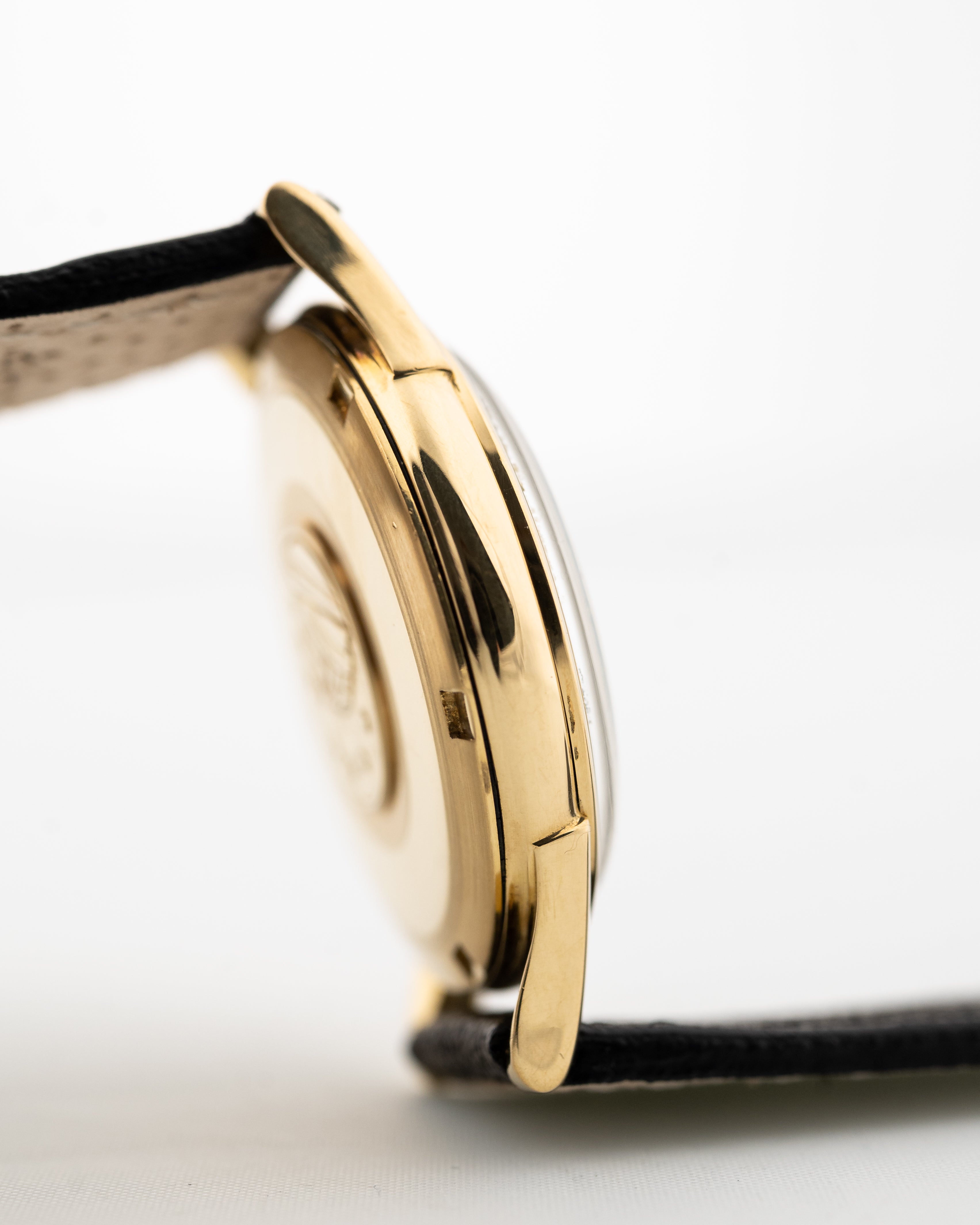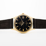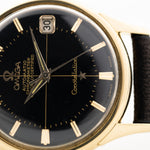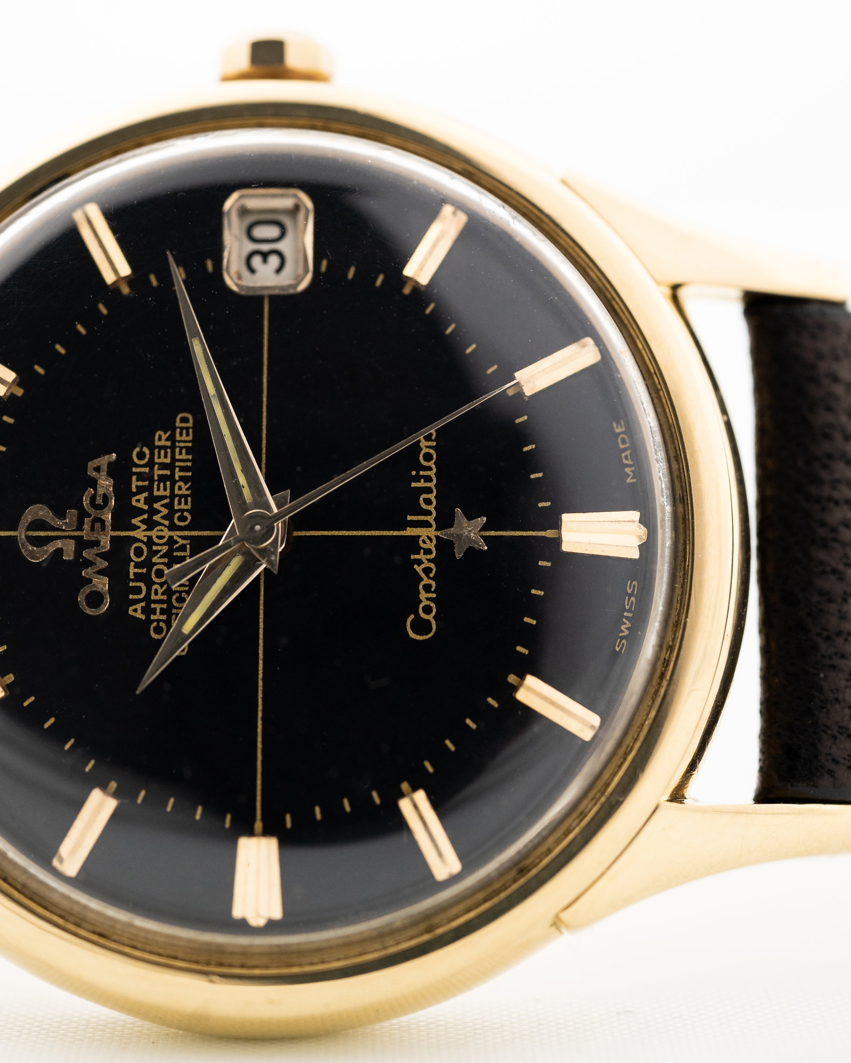 Questo compatto e bellissimo cronometro automatico Omega Constellation ha tutto ciò che si desidera in un orologio da sera: Cassa da 35 mm in oro giallo 18 carati, secondi al centro, un bellissimo e raro quadrante nero dorato in condizioni impeccabili e rari indici sottili a bastone. Uscito per la prima volta nel 1952, il Constellation era la risposta di Omega al Rolex Datejust.