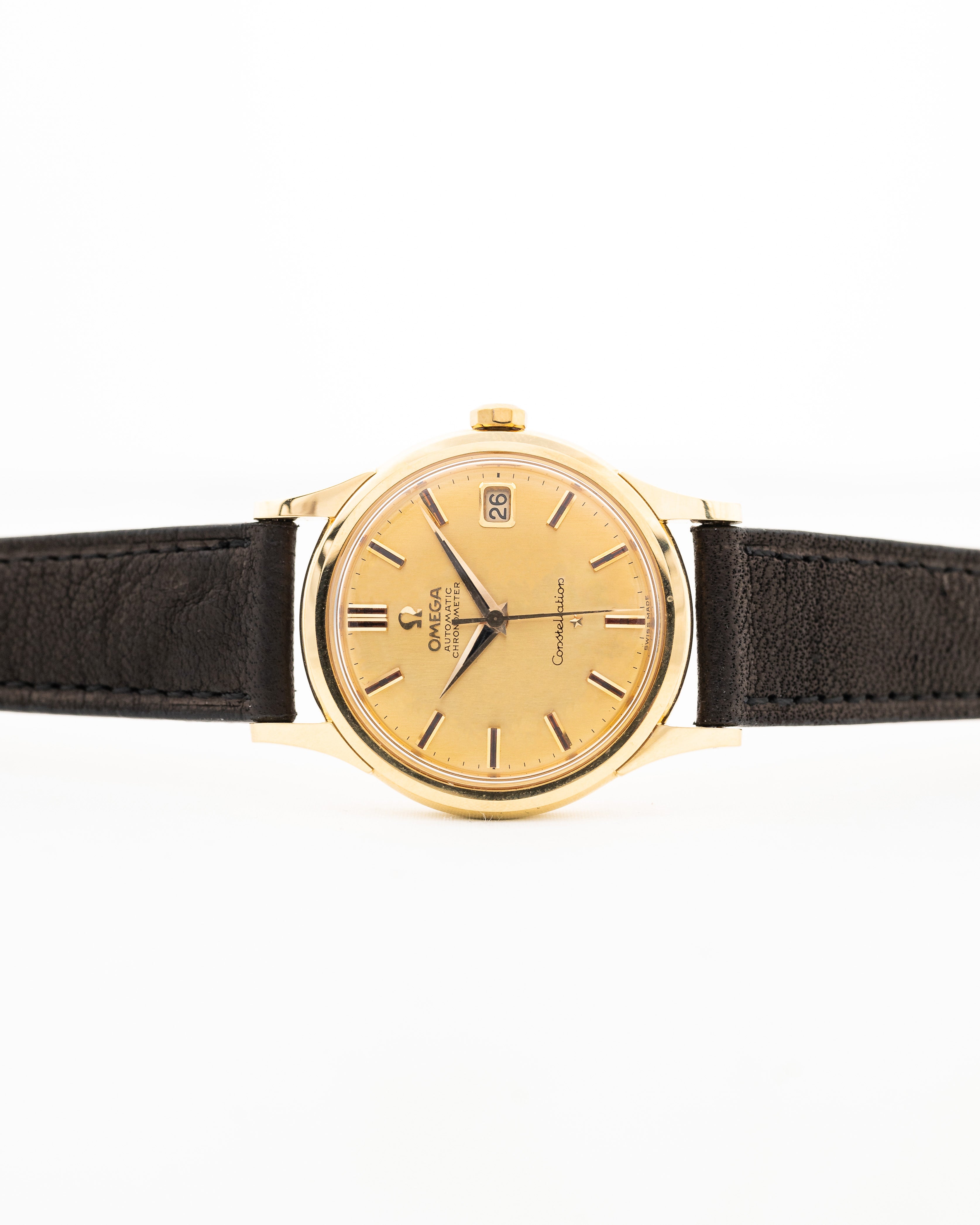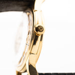 Questo compatto e bellissimo cronometro automatico Omega Constellation ha tutto ciò che si desidera in un orologio da sera: Cassa da 35 mm in oro giallo 18 carati, secondi al centro, un bellissimo quadrante color oro giallo e rari indici sottili a bastone con intarsi in onice. Uscito per la prima volta nel 1952, il Constellation era la risposta di Omega al Rolex Datejust.