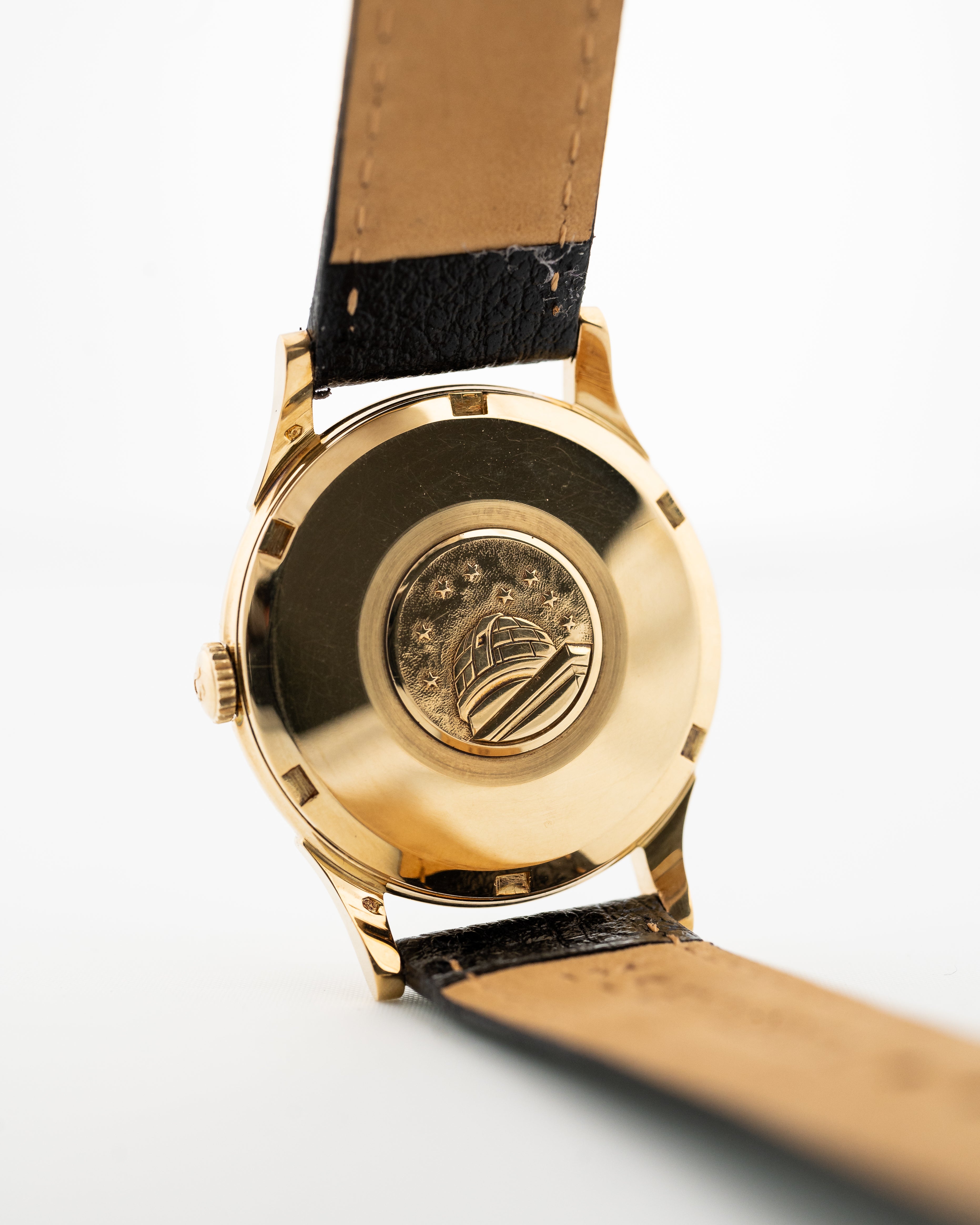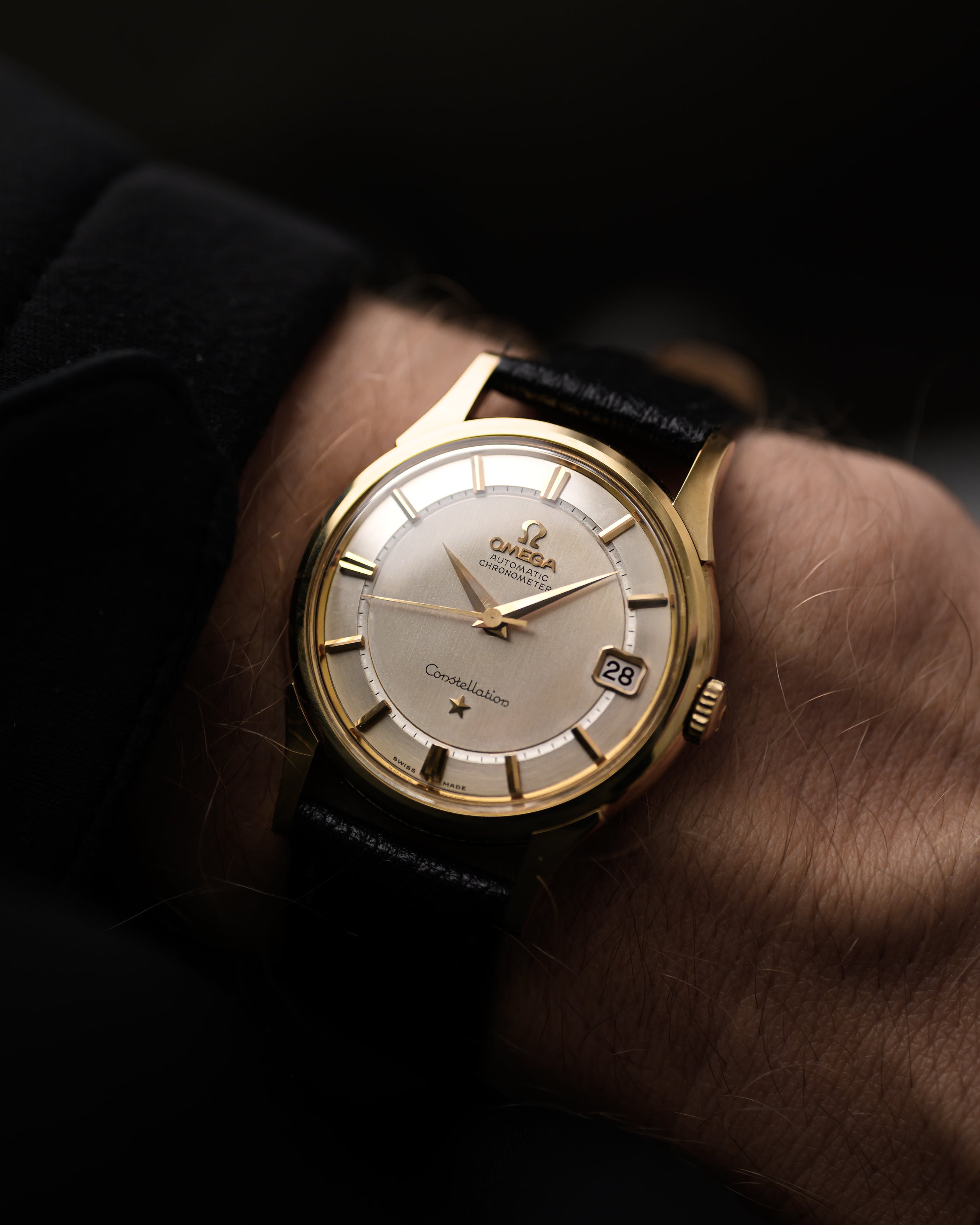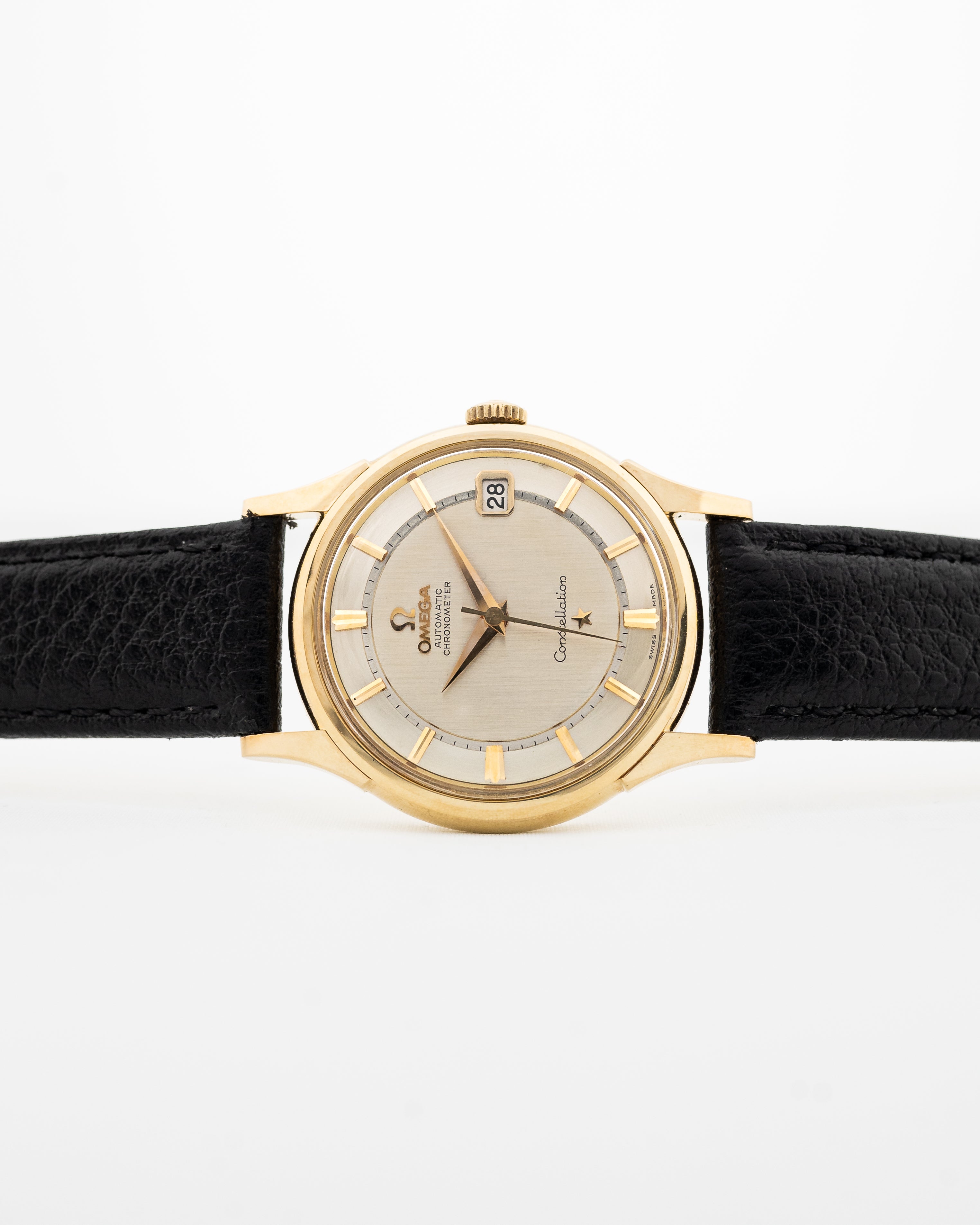 Ben proporzionato, semplice e classico, questo Constellation è dotato di un fondello a vite, del calibro 561 del cronometro automatico Omega e di grandi anse leggermente ruotate verso il basso.