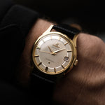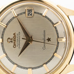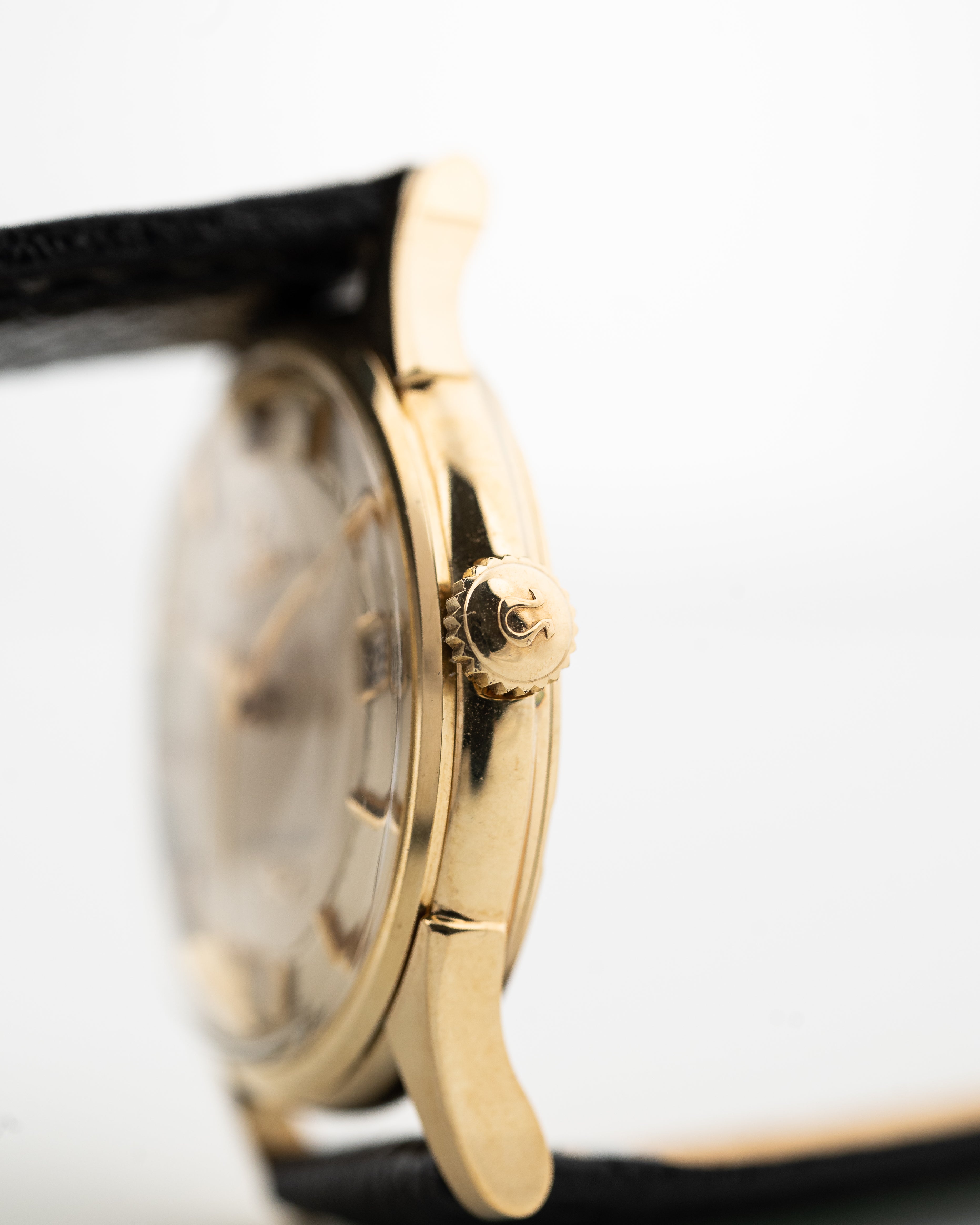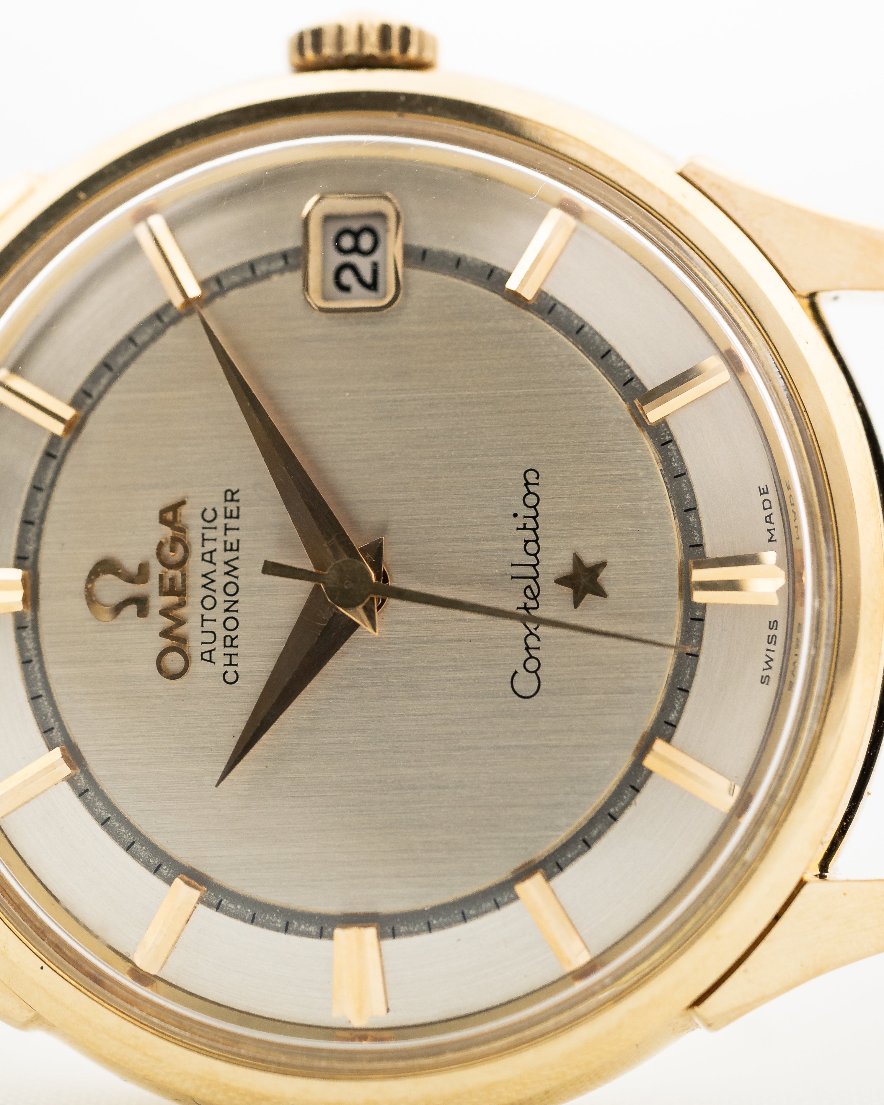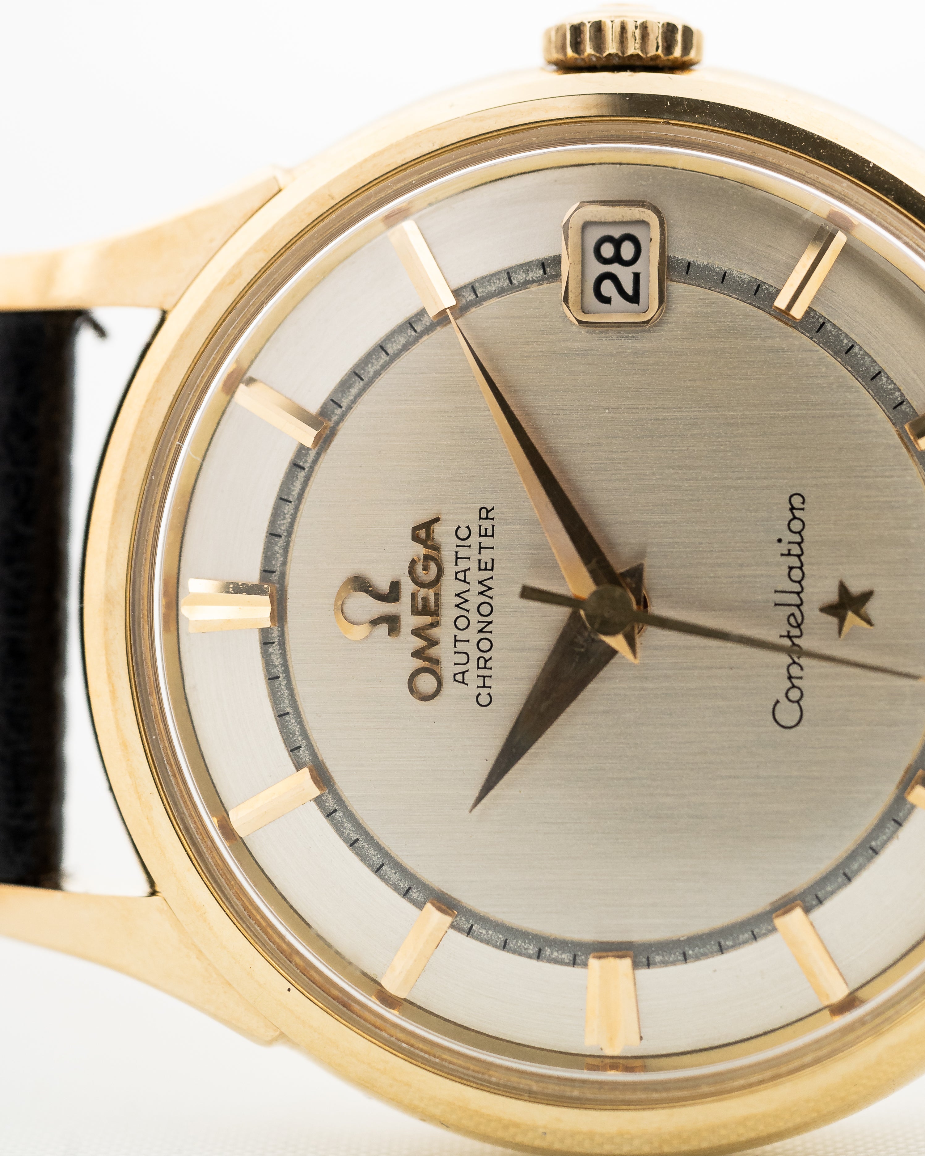 Questo compatto e bellissimo cronometro automatico Omega Constellation ha tutto ciò che si desidera in un orologio da sera: Cassa da 35 mm in oro giallo 14 carati, secondi al centro, un bellissimo quadrante Railroad Pie Pan e sottili indici a bastone in oro giallo. Uscito per la prima volta nel 1952, il Constellation era la risposta di Omega al Rolex Datejust.