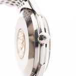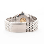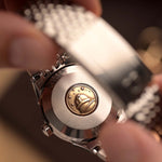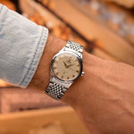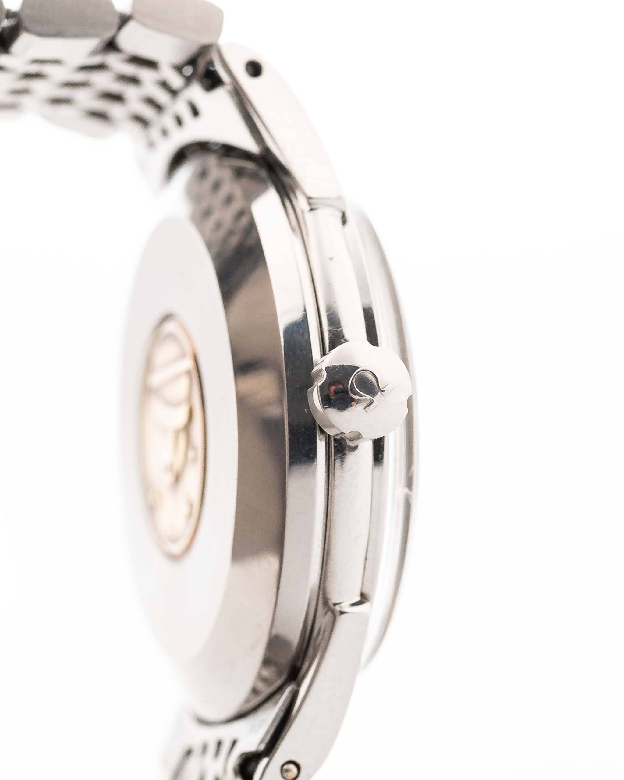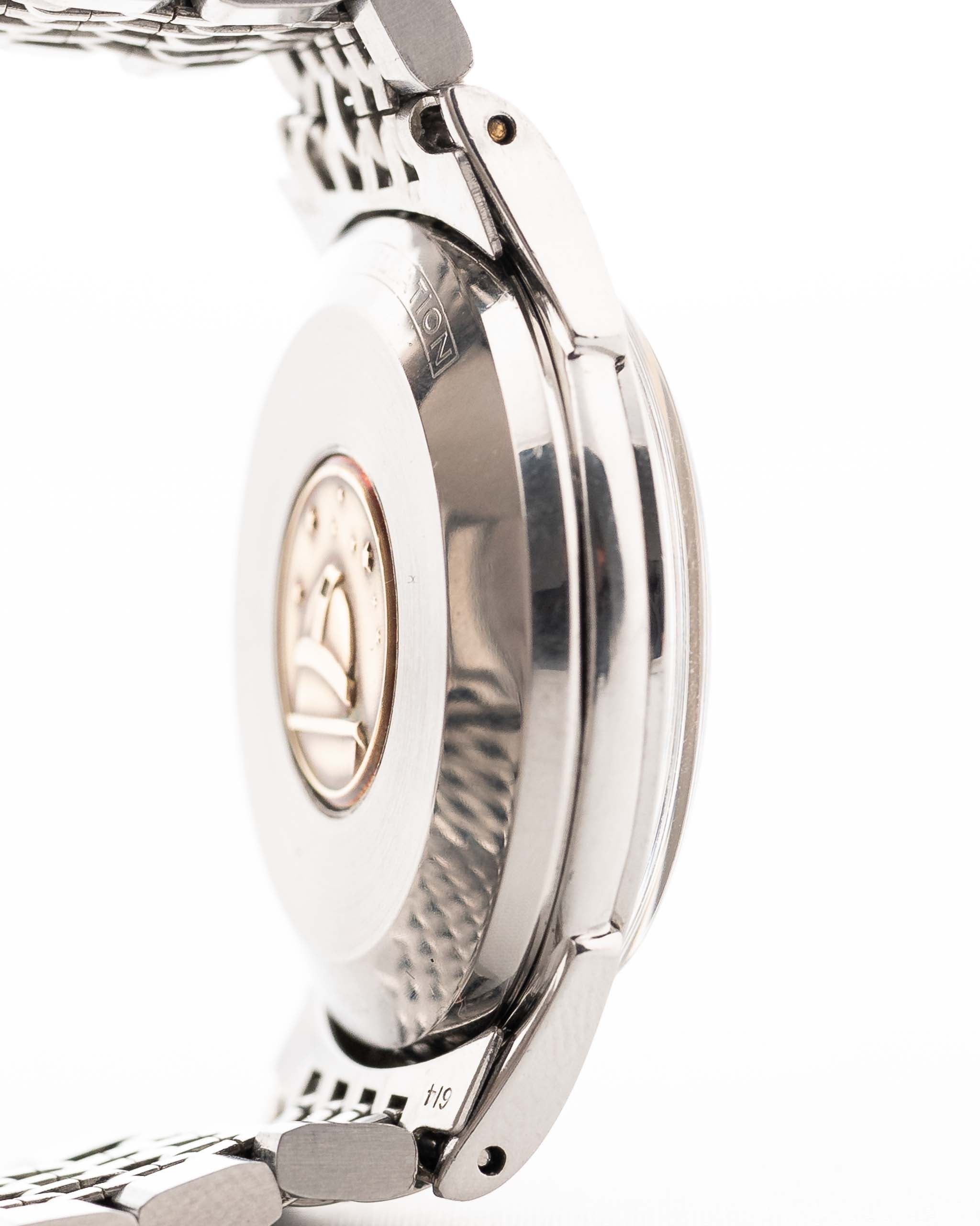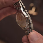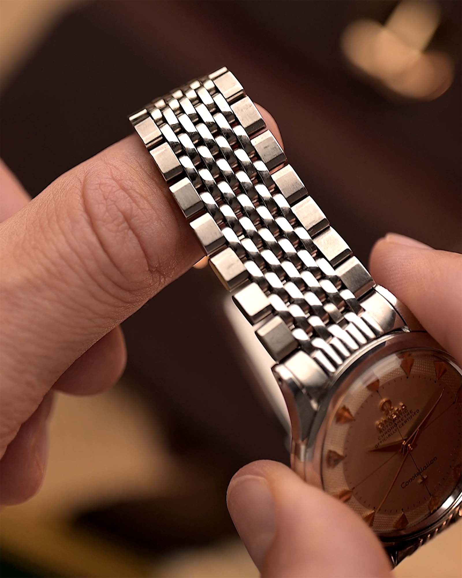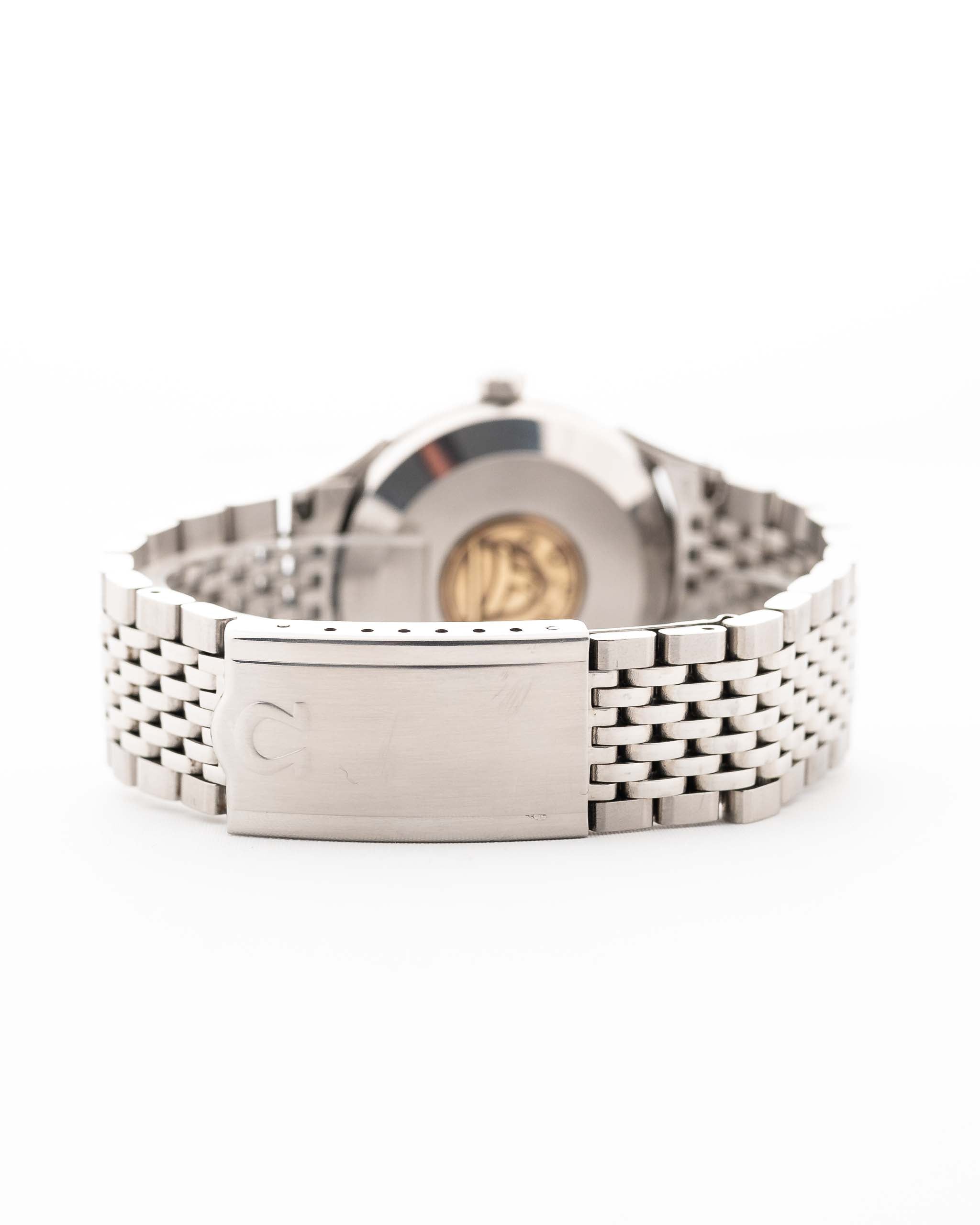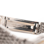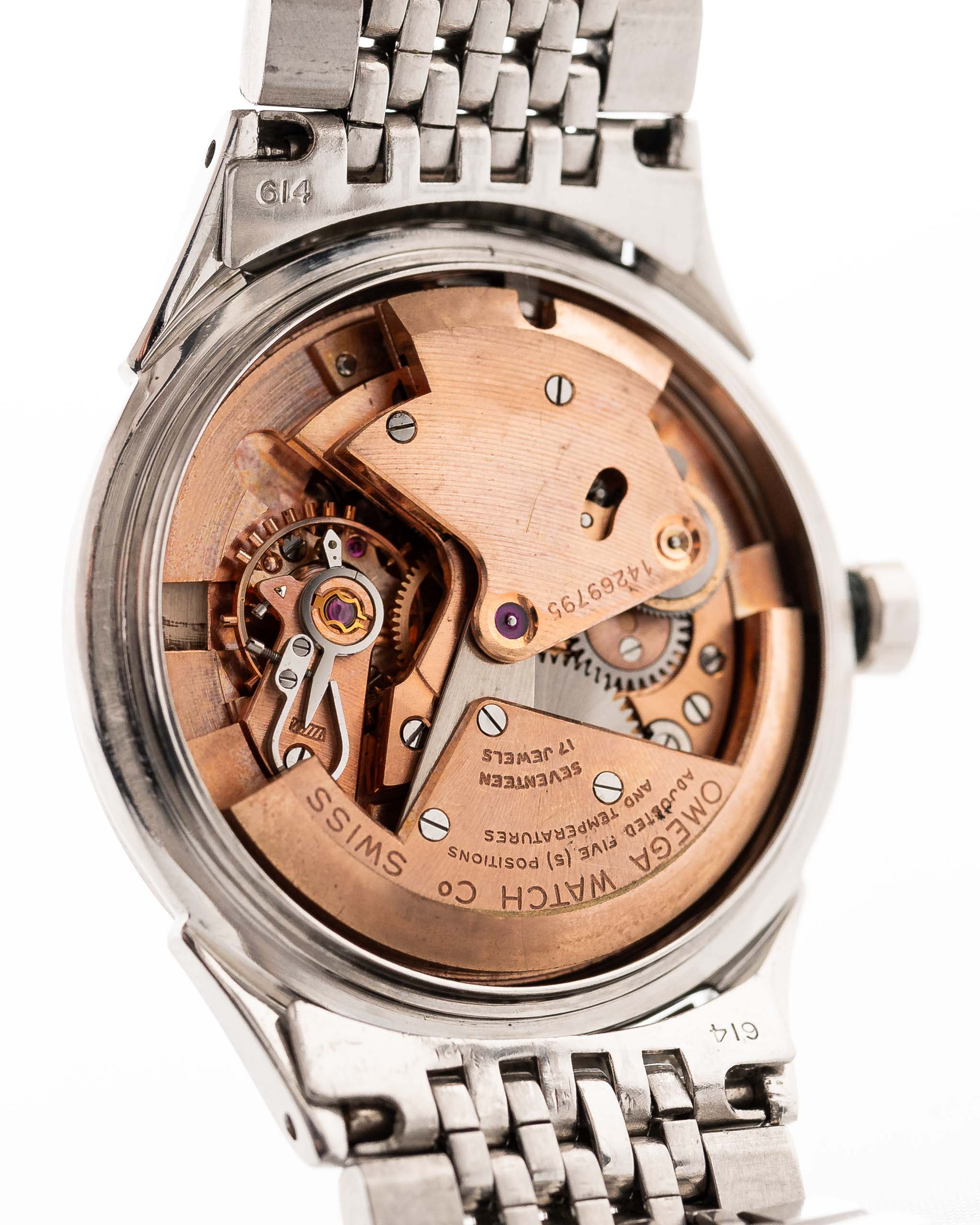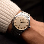 La cassa in acciaio inossidabile da 35 mm è ben proporzionata e senza tempo, con anse delicatamente ribassate e un fondello a scatto pulito. Questo particolare pezzo conserva anche il bracciale originale Omega "beads of rice", un'aggiunta comoda e altamente collezionabile.