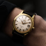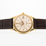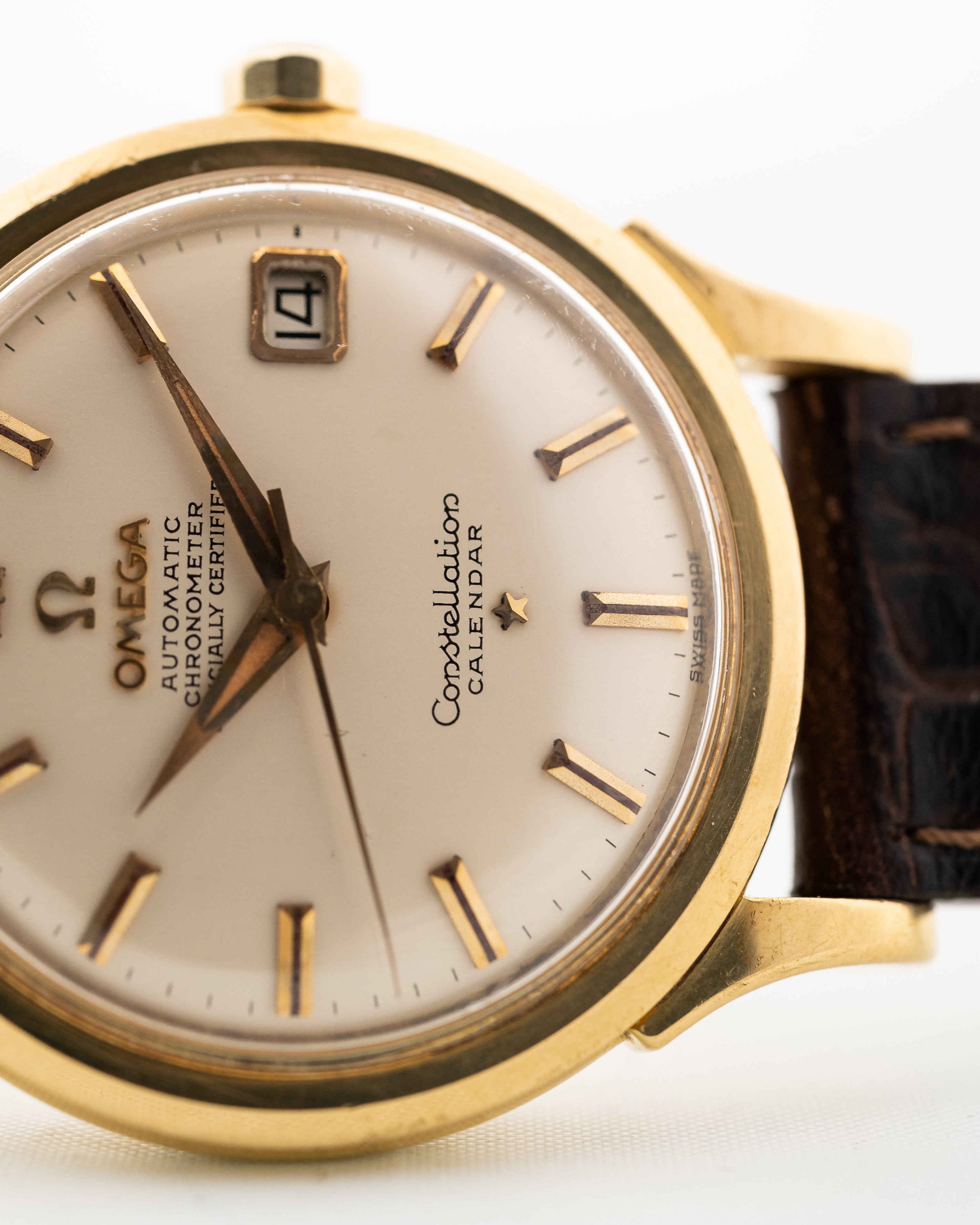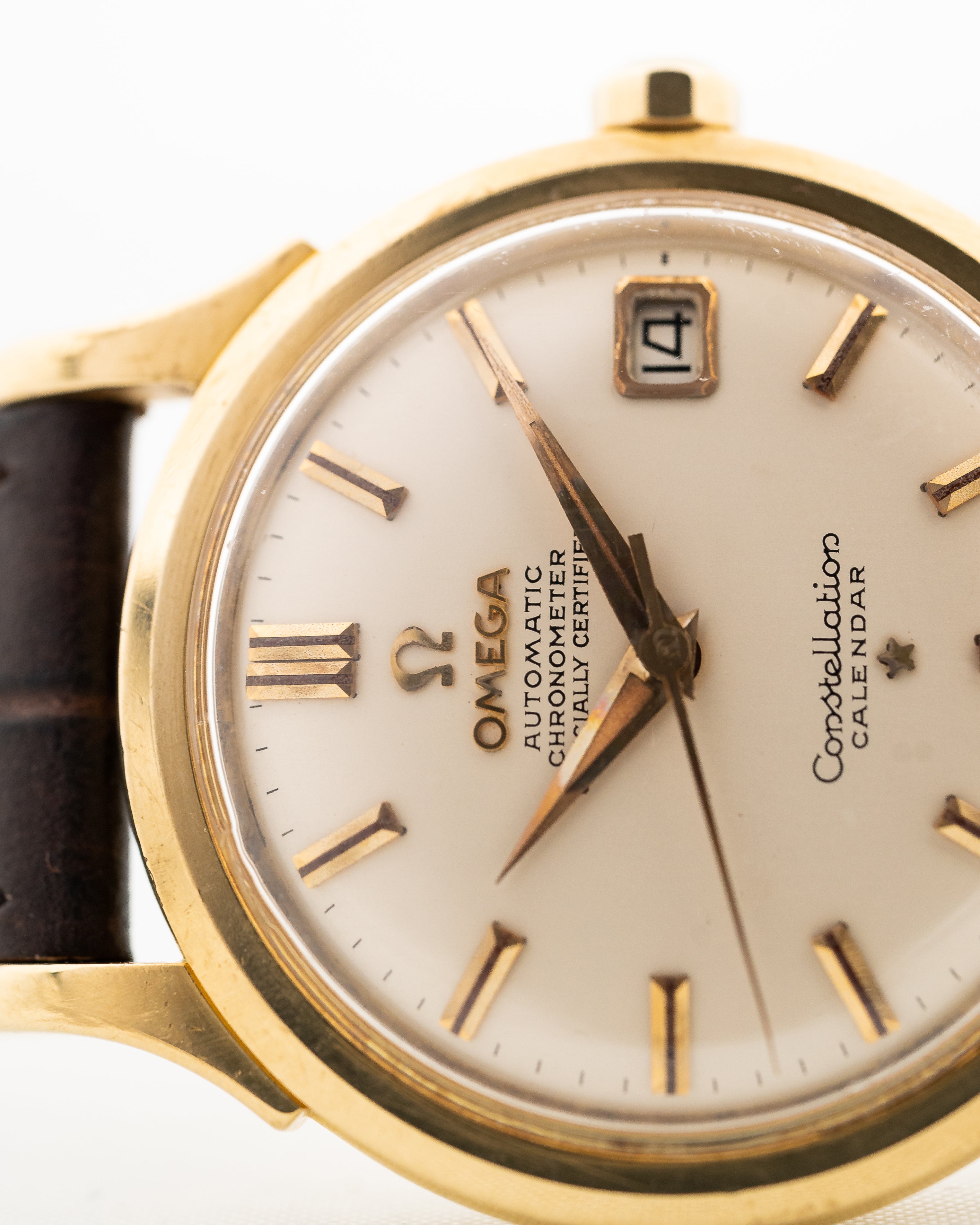 Questo compatto e bellissimo cronometro automatico Omega Constellation Calendar ha tutto ciò che si desidera in un orologio da sera: Cassa da 35 mm in oro giallo 18 carati, secondi al centro, un bellissimo quadrante bianco/crema e sottili indici a bastone con centri in onice. Uscito per la prima volta nel 1952, il Constellation era la risposta di Omega al Rolex Datejust.