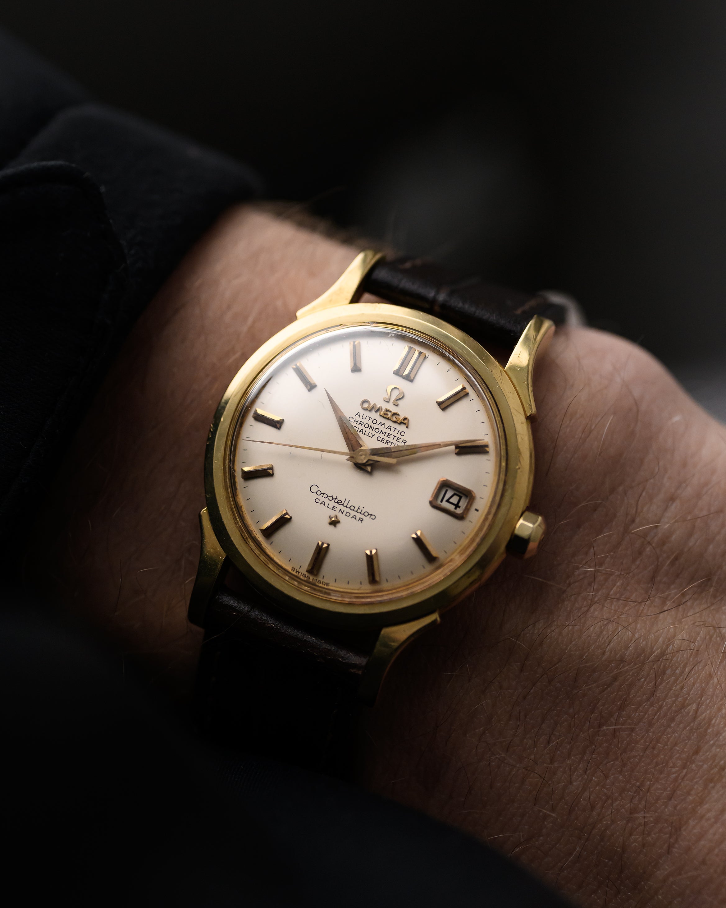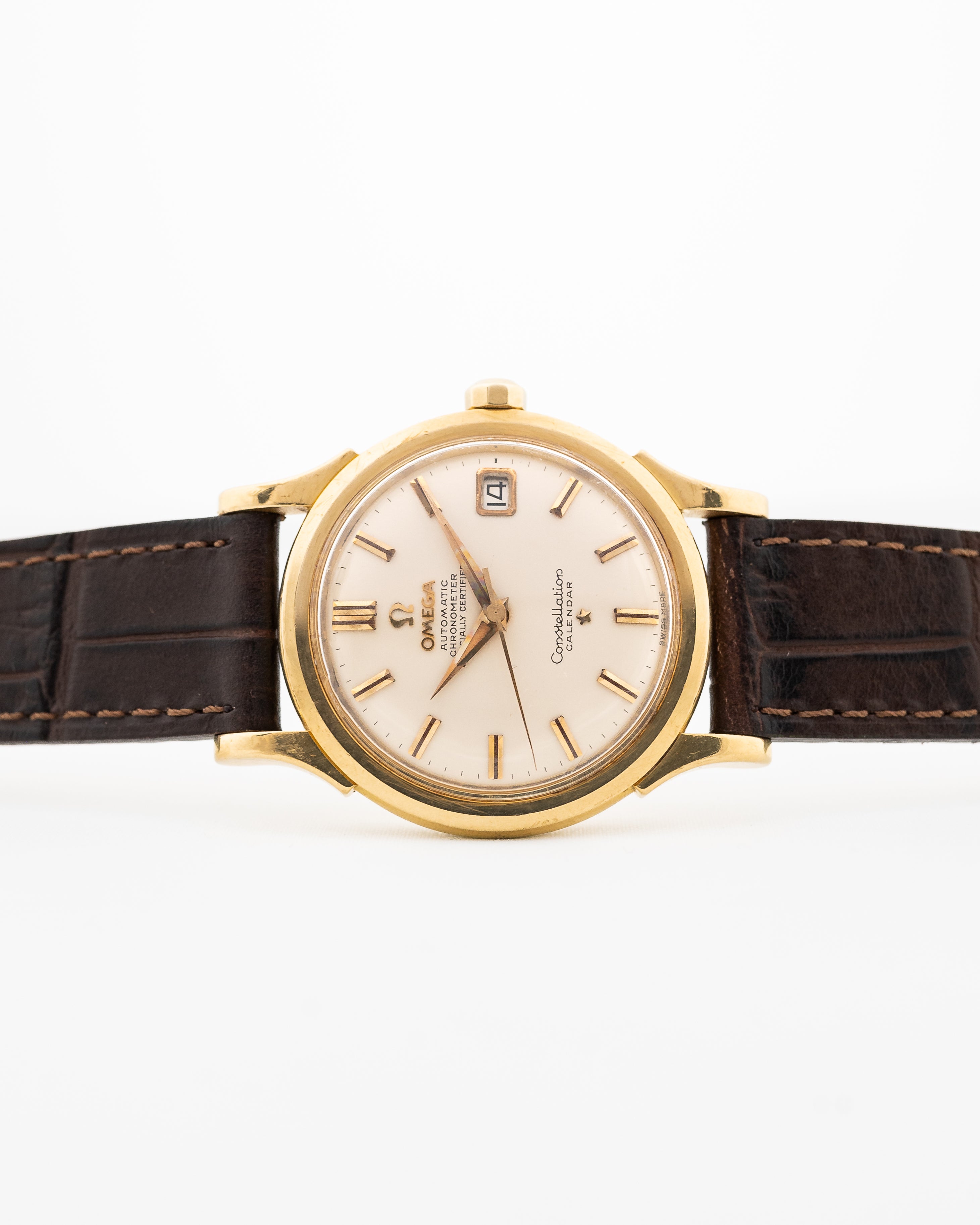 Ben proporzionato, semplice e classico, questo Constellation presenta un fondello a scatto, il calibro 504 del cronometro automatico Omega e le grandi anse leggermente ribaltate.