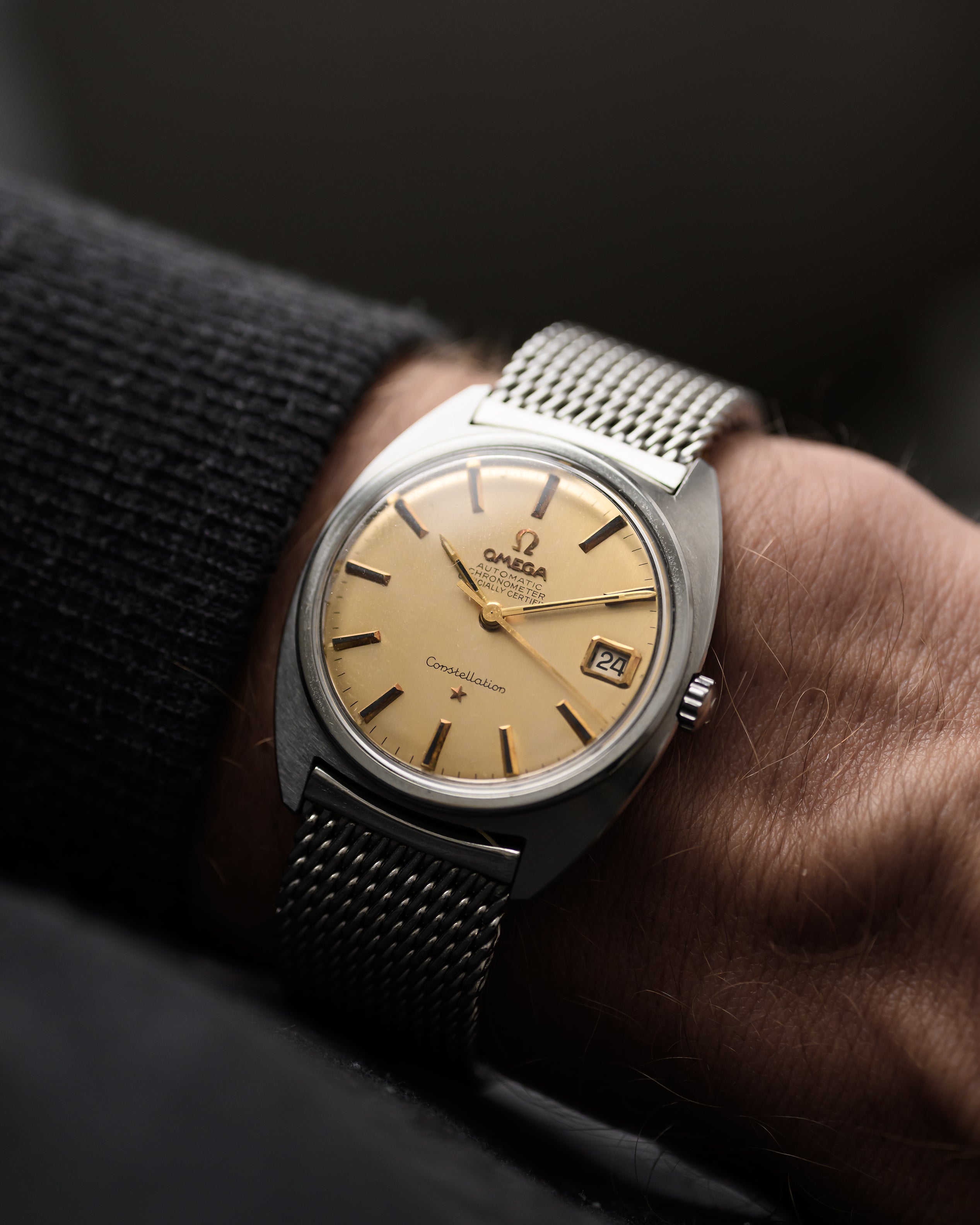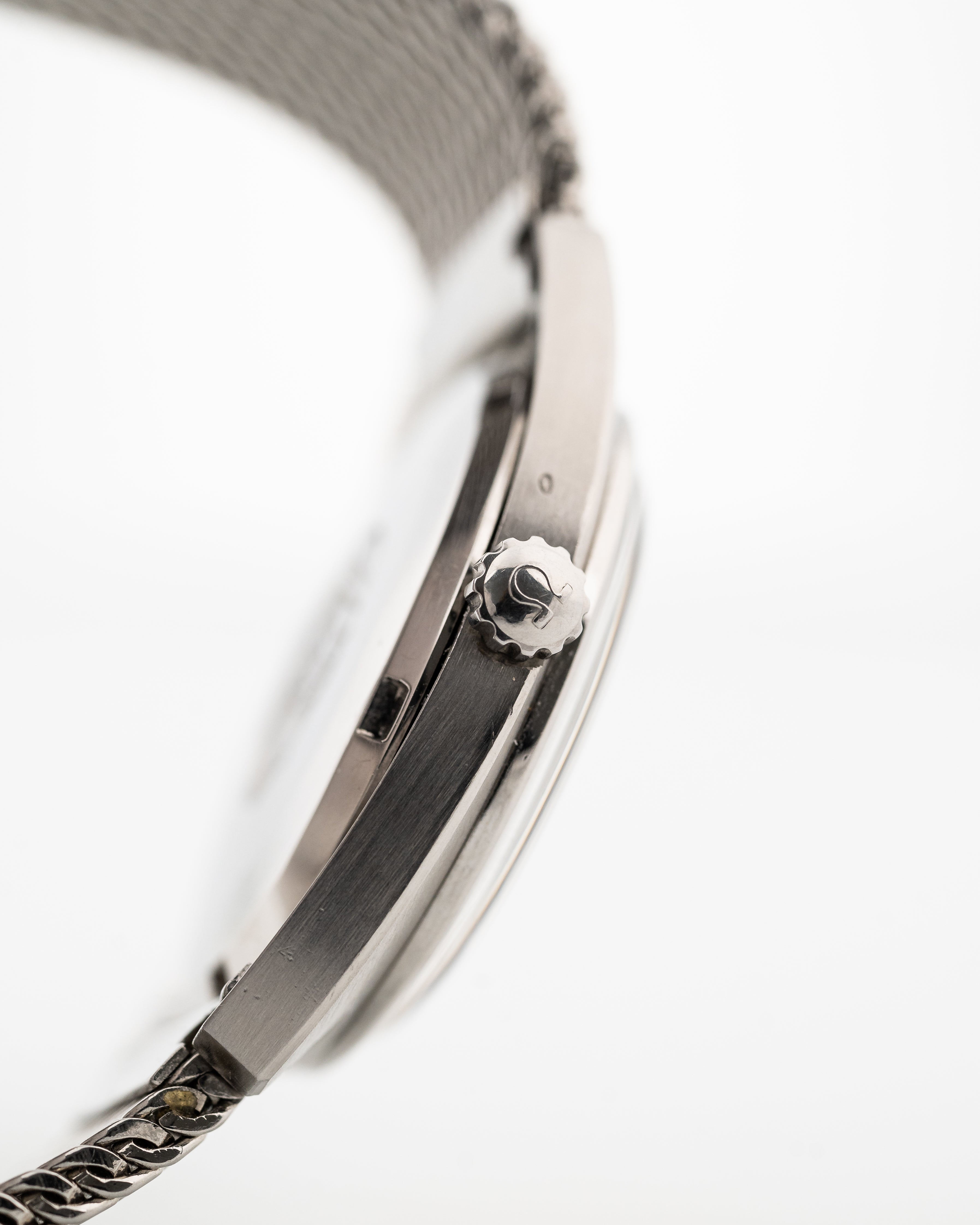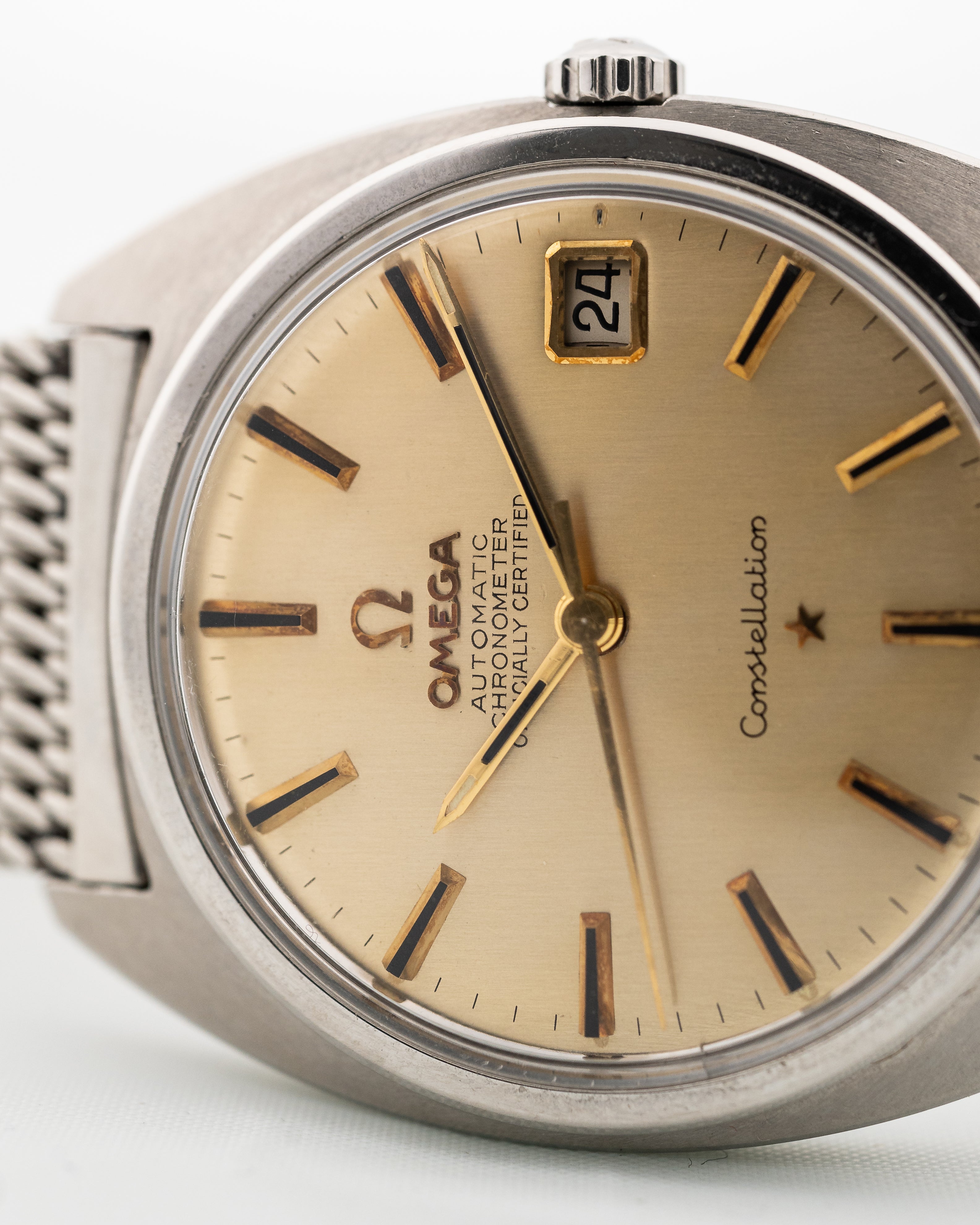 Ben proporzionato, semplice e classico, questo Constellation presenta un fondello a vite, il cronometro automatico Omega Calibro 562 e ottime condizioni generali.