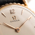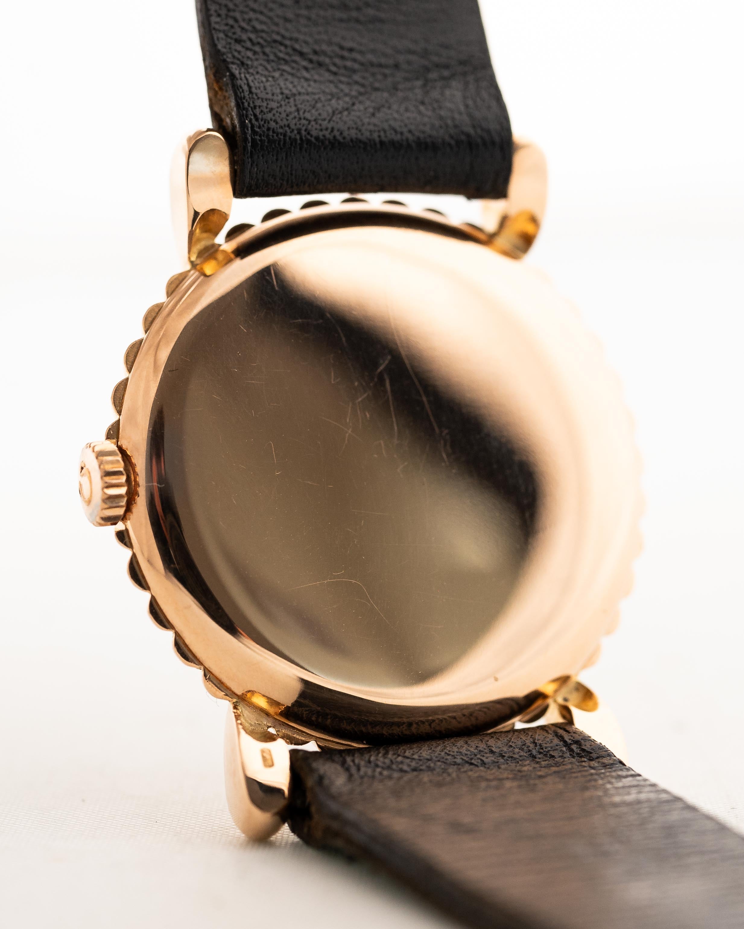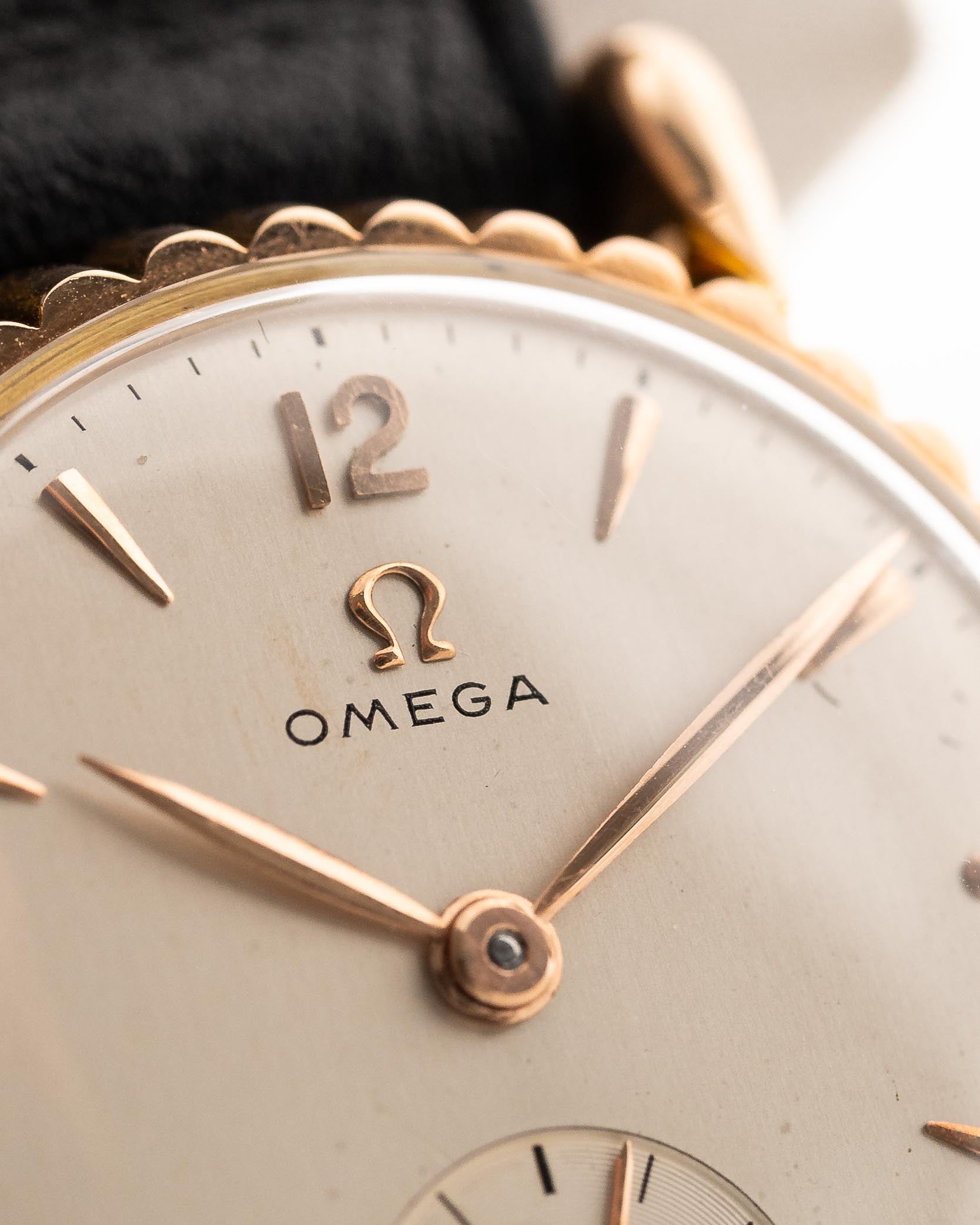 Questo Omega del 1947 è qualcosa di veramente unico. Questo design della cassa si trova molto raramente - in queste condizioni è quasi impossibile. La cassa da 32 mm è leggermente più grande a causa dello speciale design della cassa. Il quadrante pulito di colore argento con secondi sussidiari e la bella cassa in oro rosa, le lancette e il logo Omega applicato in oro rosa lo portano a un altro livello di orologi da cerimonia.