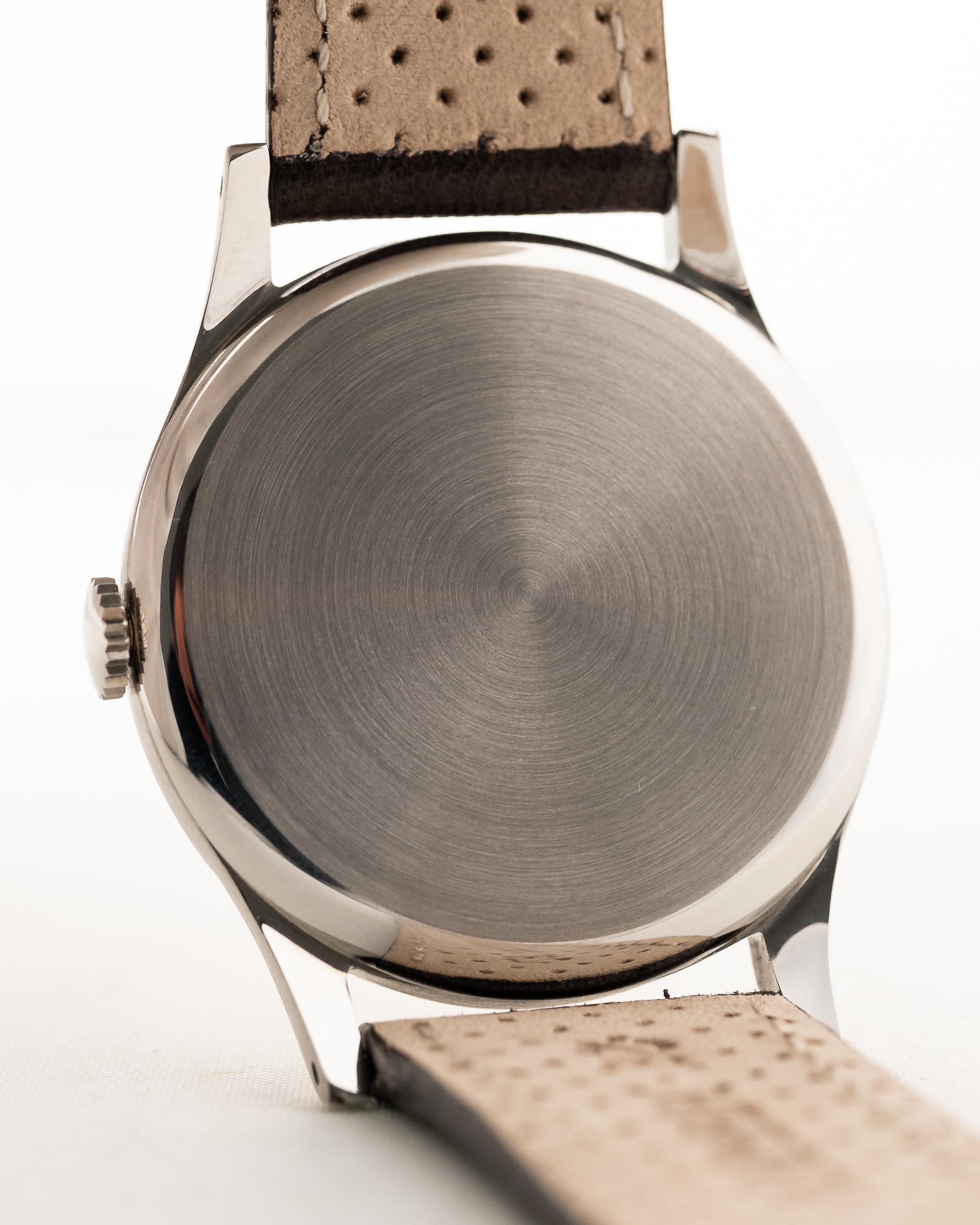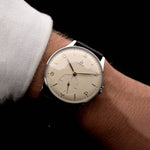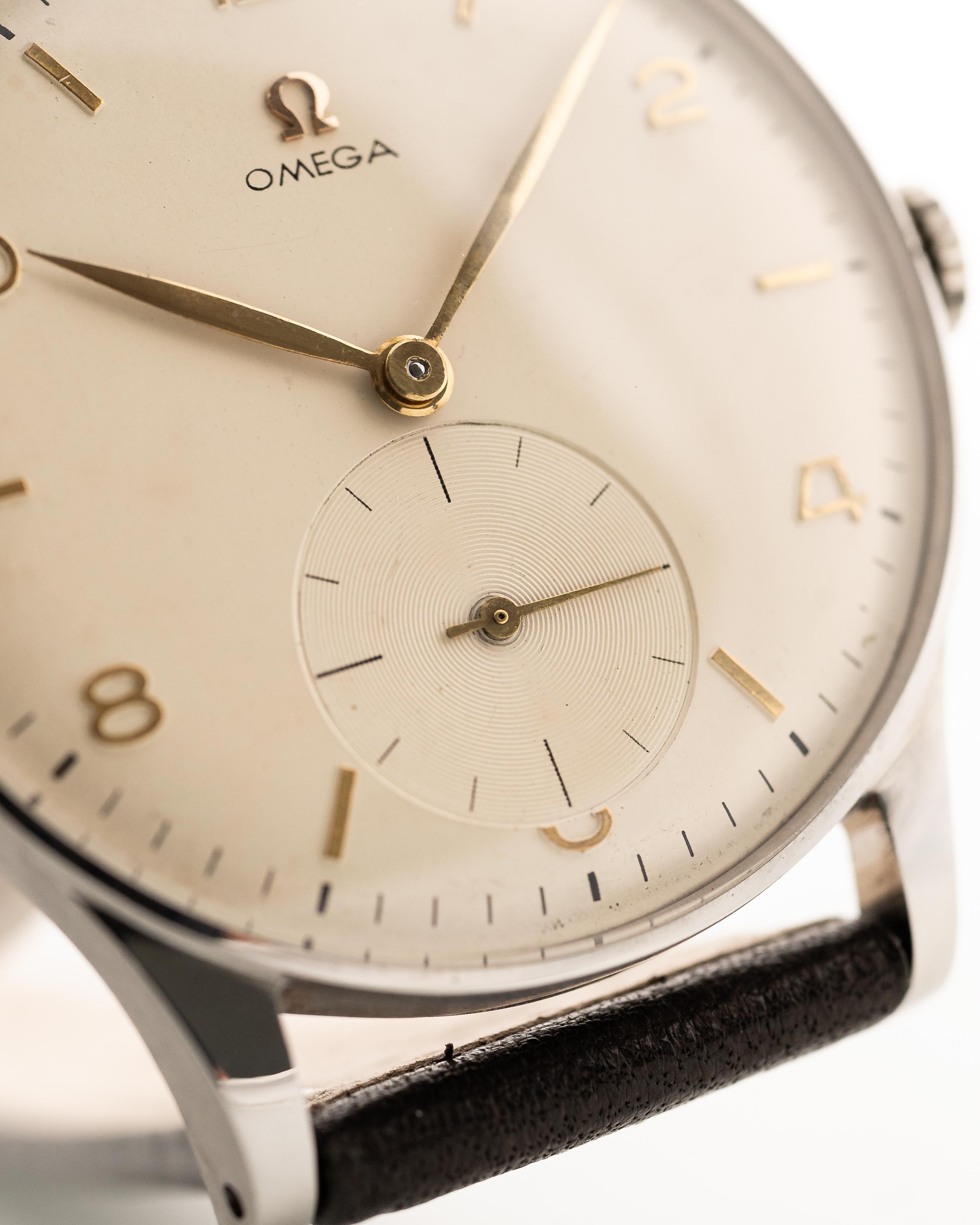 Gli anni '40 sono stati un buon periodo per Omega, come esemplificato da questo bellissimo orologio da sera. Questo esemplare non è solo bello, ma anche sostanzioso. Dotato di un'enorme cassa in acciaio inossidabile da 37,5 mm, di anse ribassate e di uno splendido quadrante bianco pulito, questo orologio è davvero imbattibile.