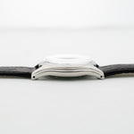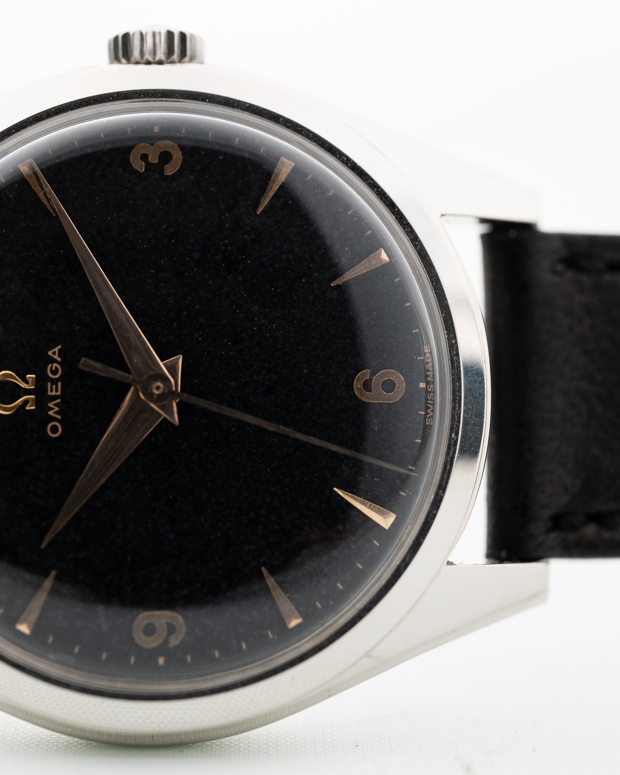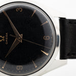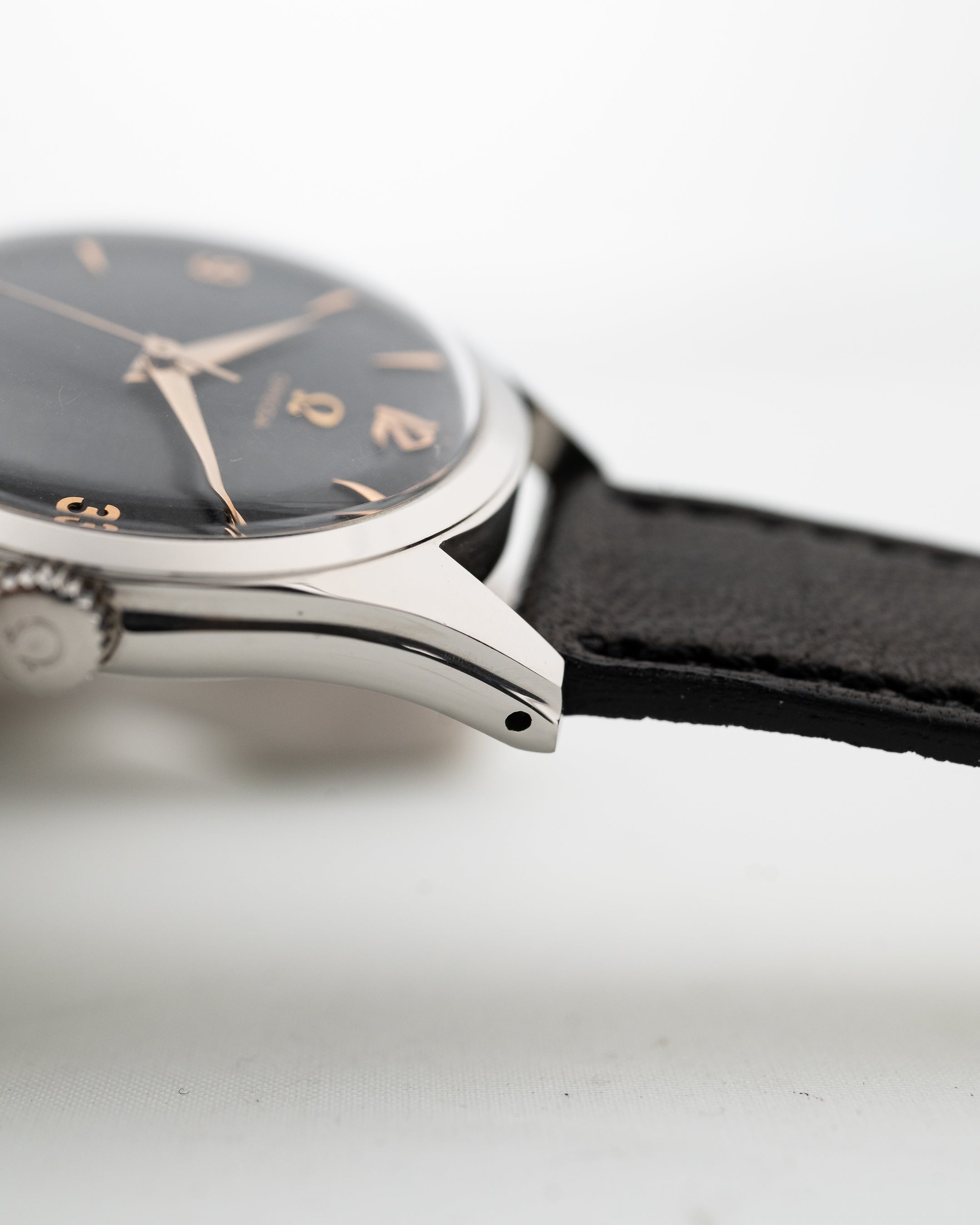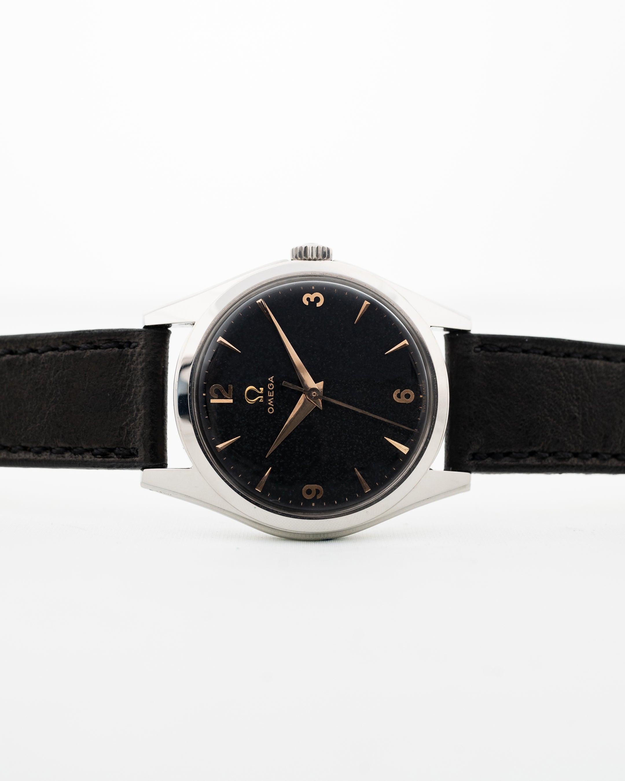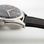 Gli anni '50 sono stati un buon periodo per Omega, come esemplificato da questo orologio da sera. Questo esemplare non è solo bello, ma anche sostanzioso. Dotato di una cassa in acciaio sovradimensionata da 36 mm, di anse ribassate e di uno splendido quadrante nero opaco, questo orologio è davvero imbattibile. Il quadrante è invecchiato magnificamente e presenta numeri arabi e indici e lancette in oro rosa, che migliorano ulteriormente l'eleganza di questo orologio.