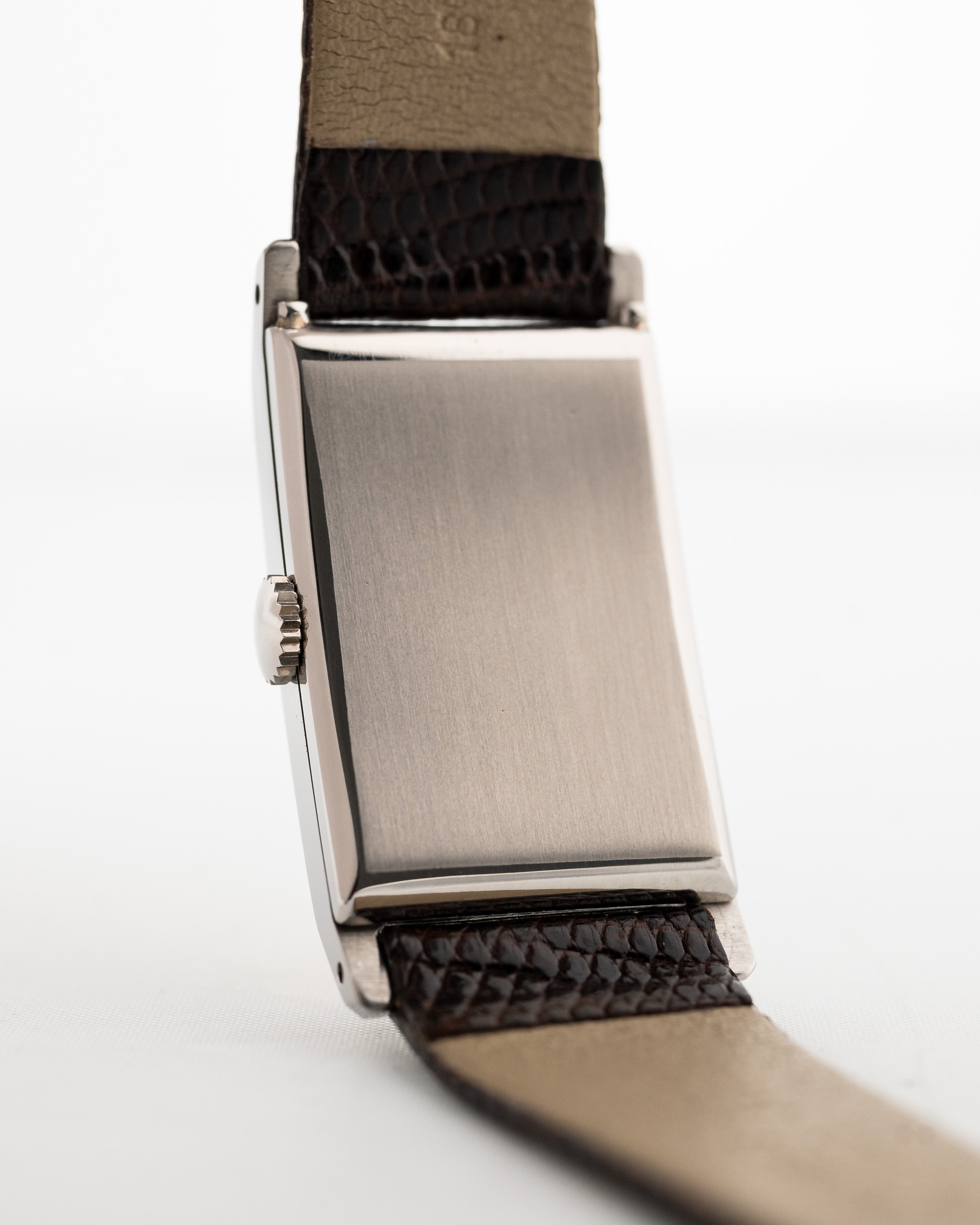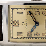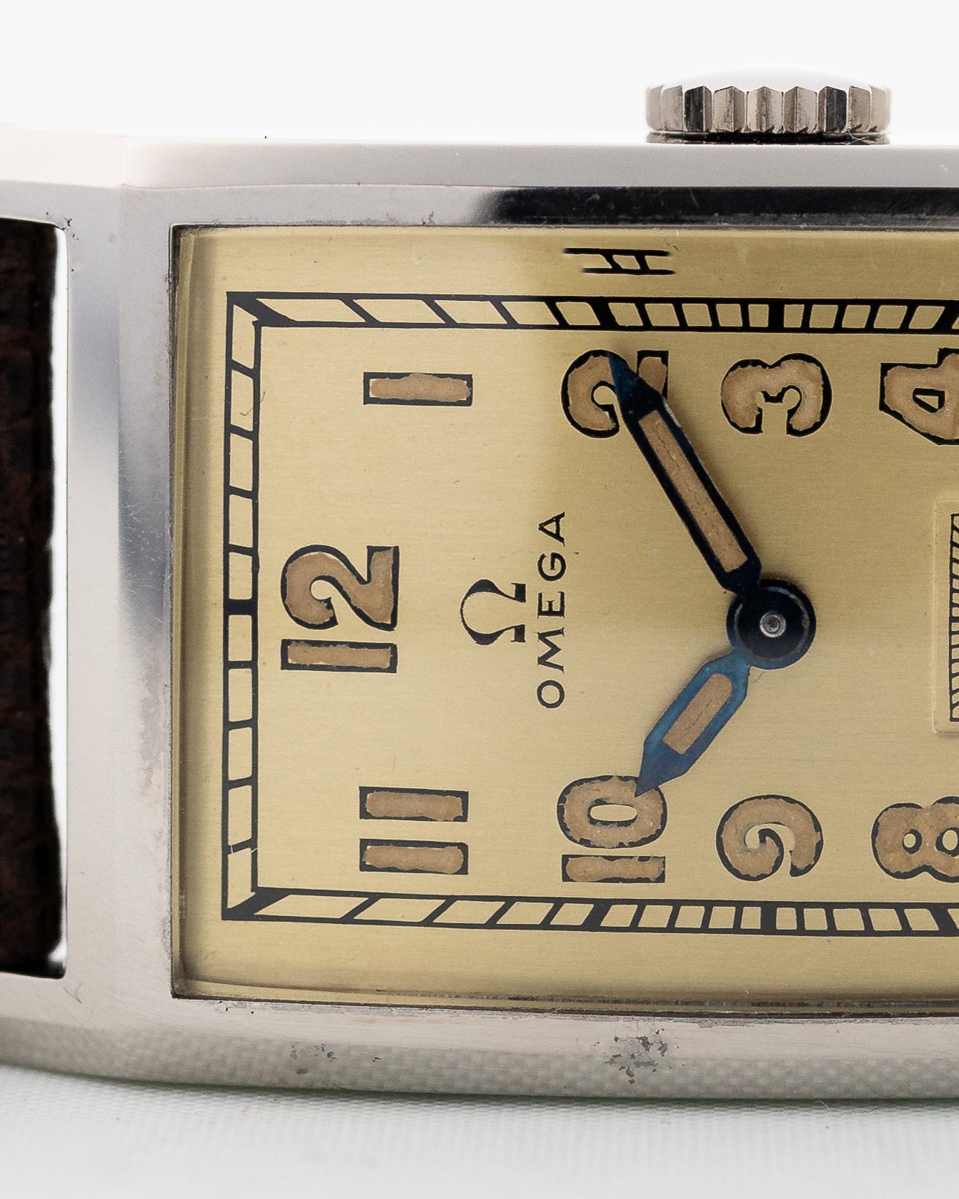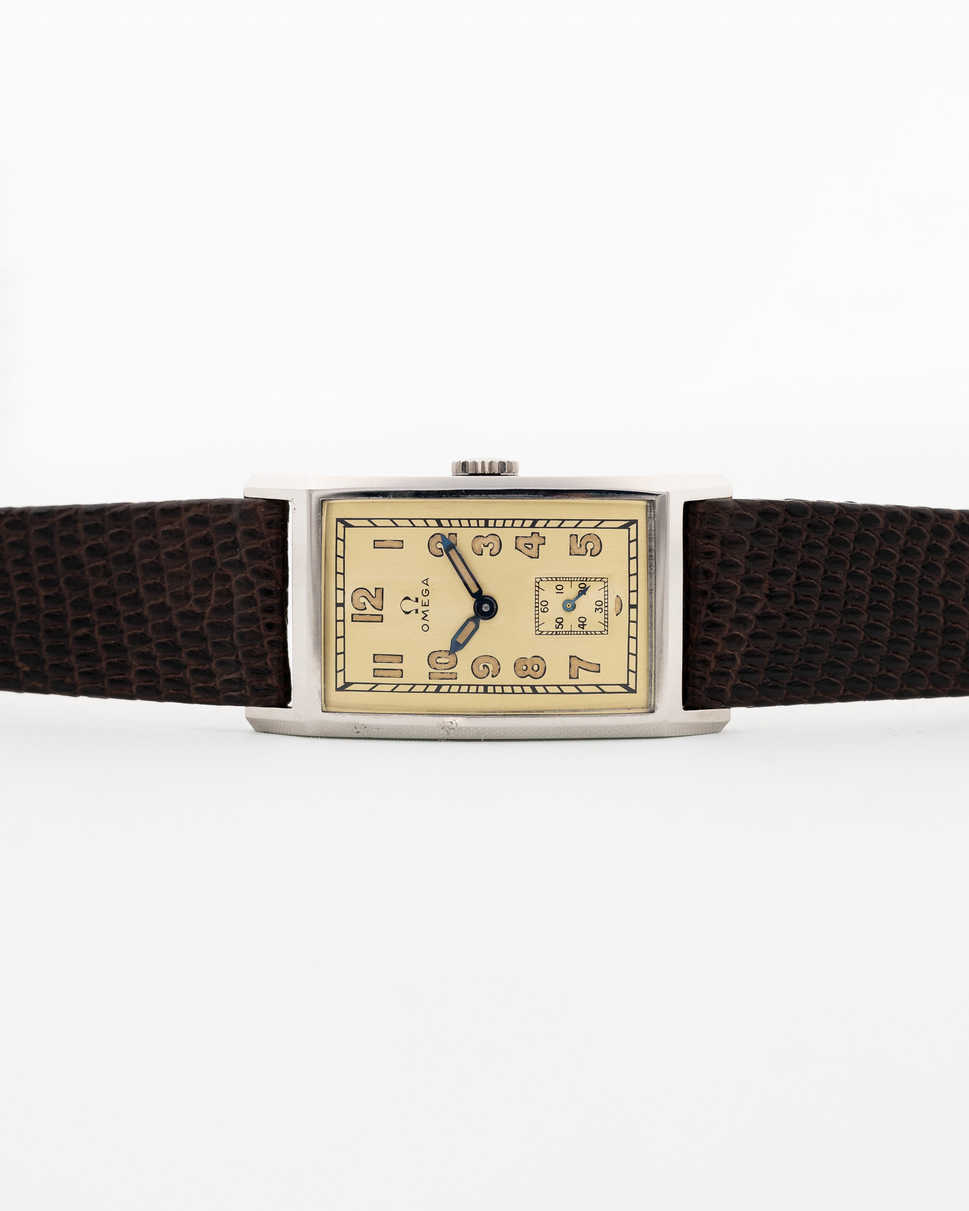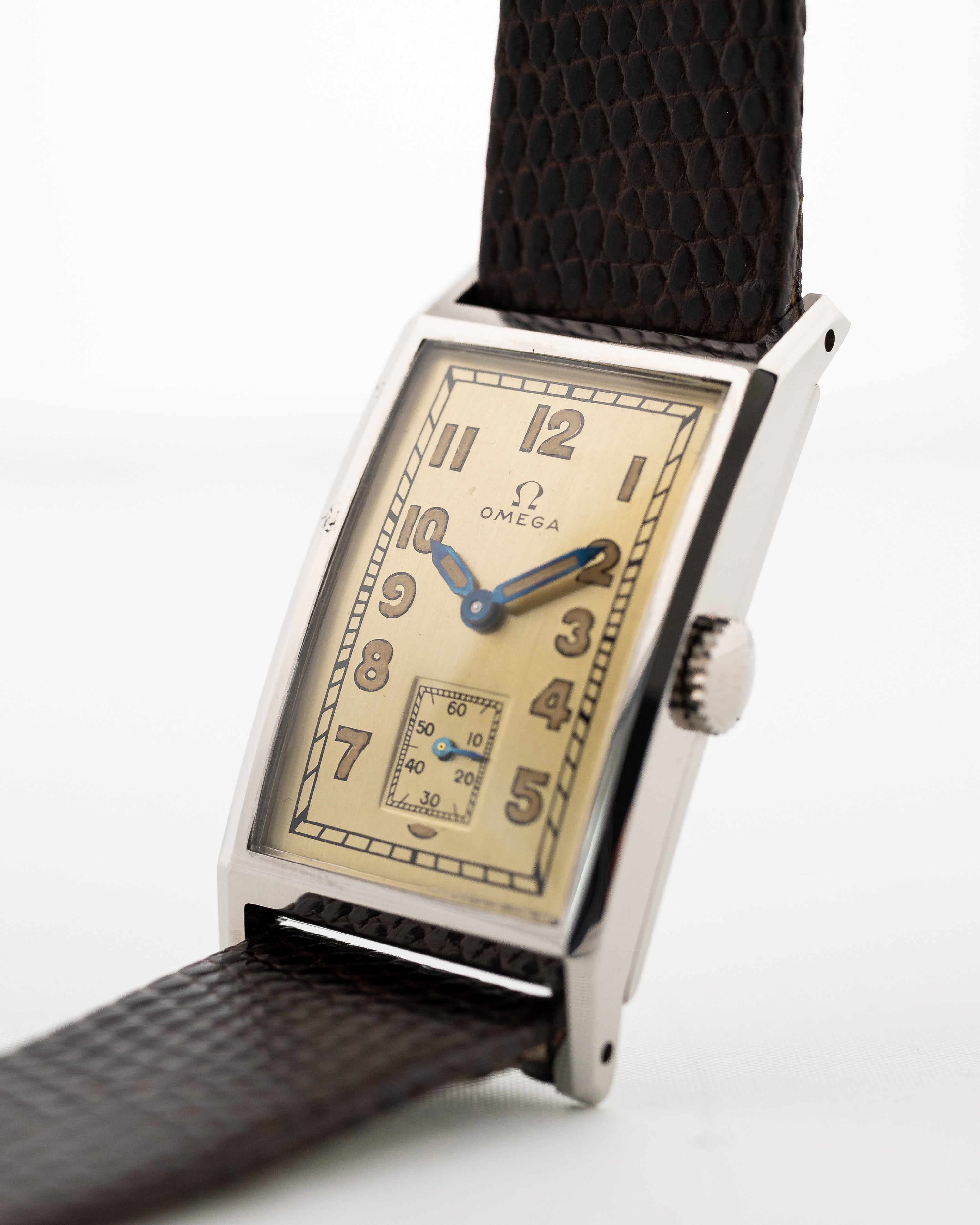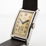 Questo non è il primo Omega Art Deco Dress Watch di cui ci siamo innamorati. Questo esemplare presenta un'enorme cassa rettangolare in acciaio ed è reso ancora più attraente grazie al suo splendido quadrante leggermente dorato con numeri arabi Art Déco, secondi sussidiari e una meravigliosa e unica lancetta blu. E la ciliegina sulla torta è la condizione straordinaria!