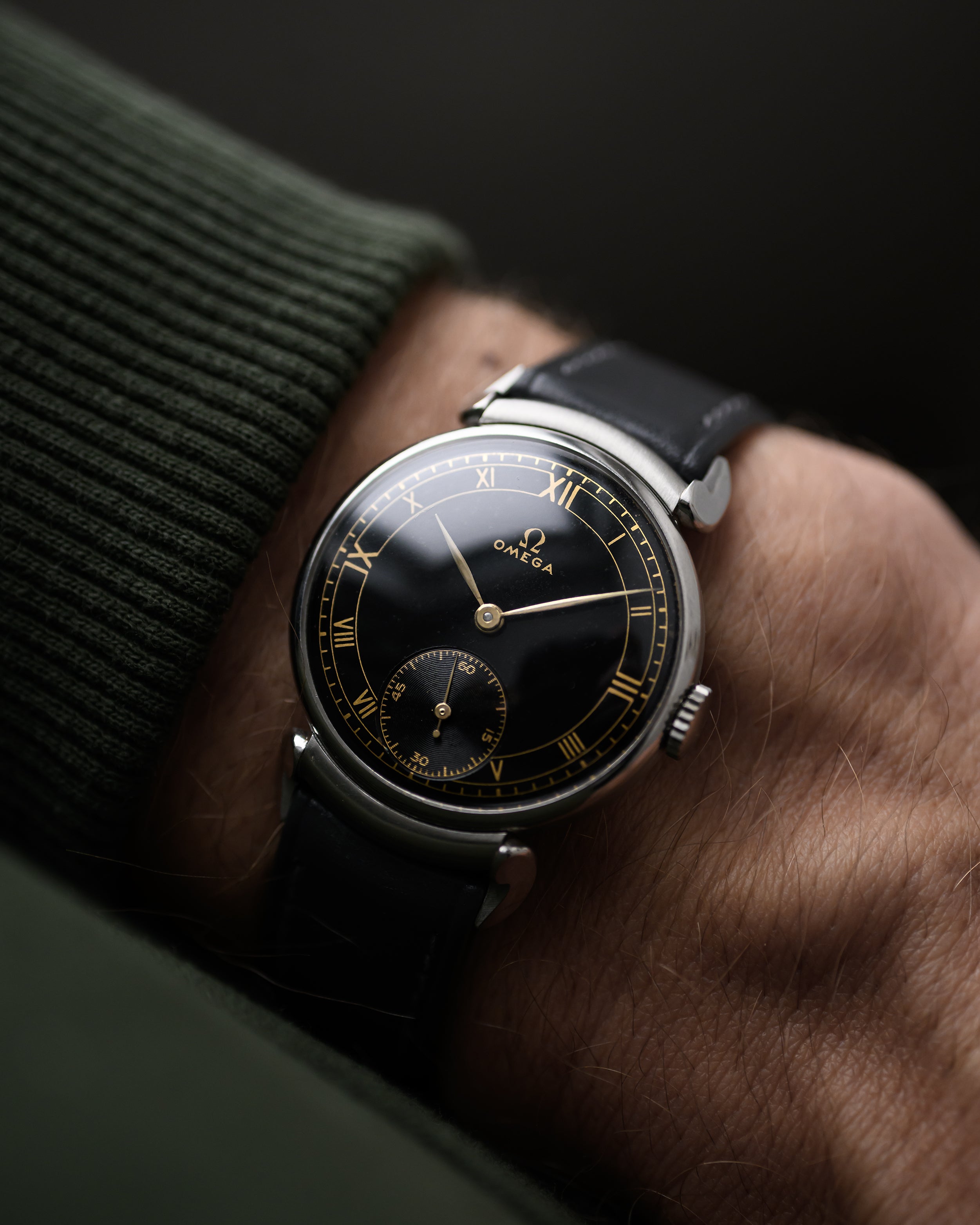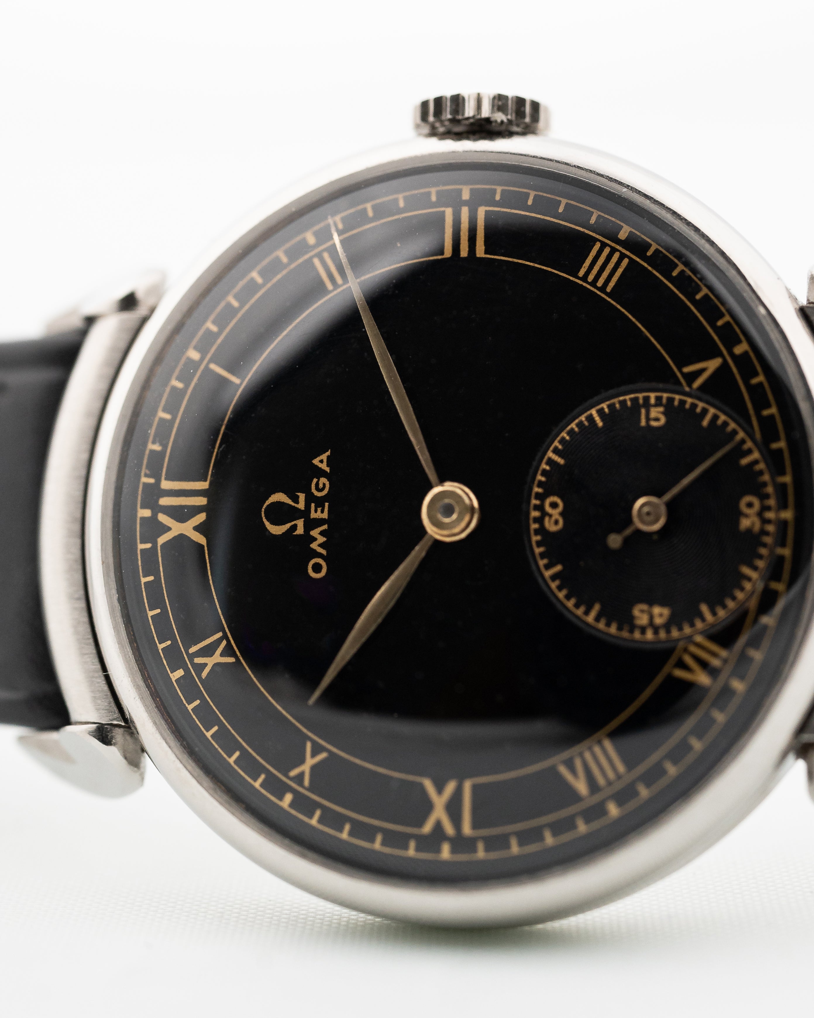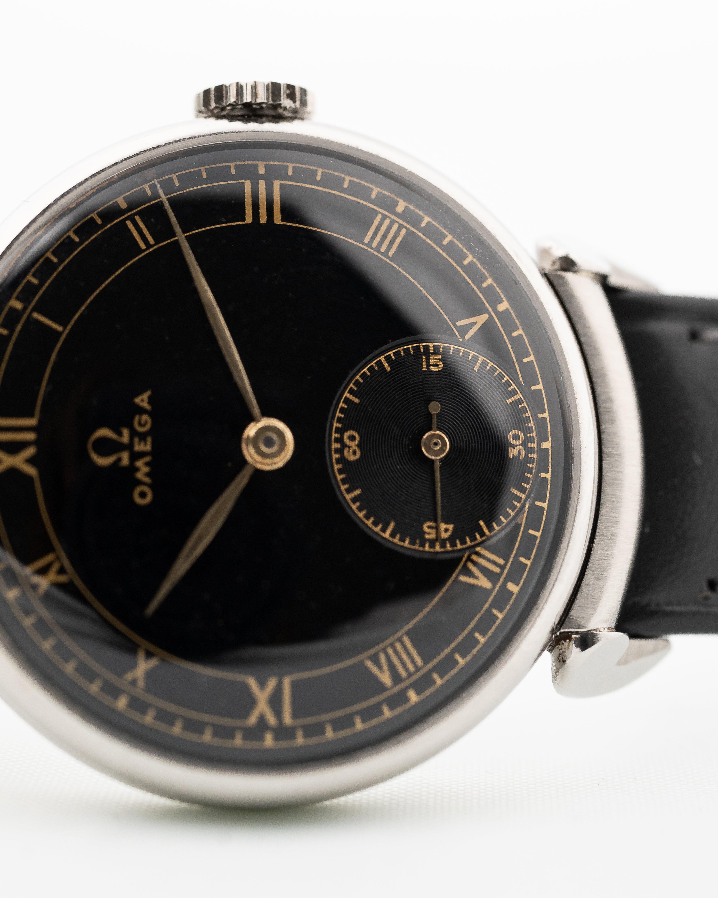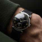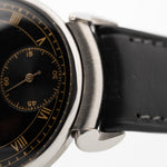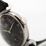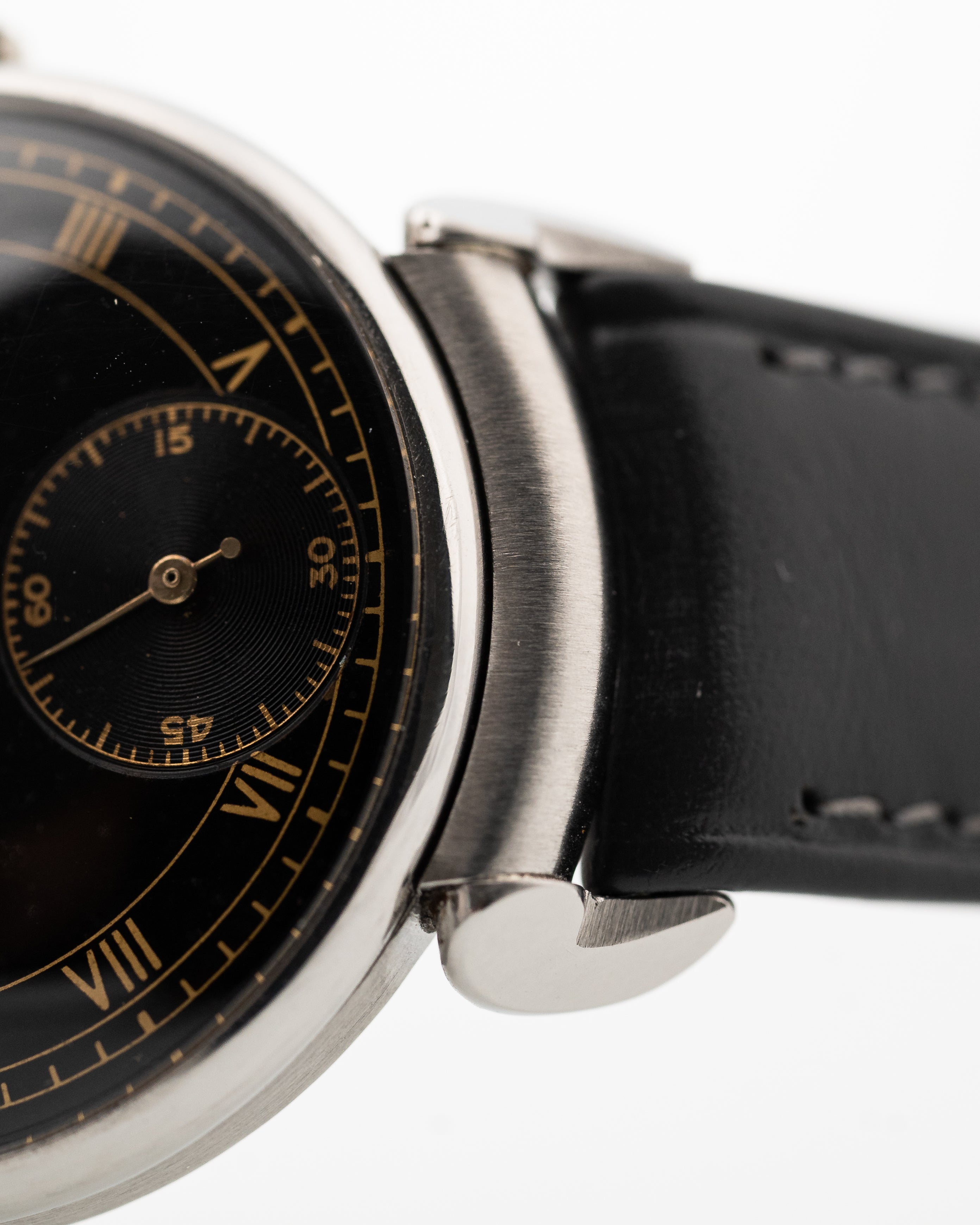 Questa bellezza presenta un grande design della cassa con un fantastico quadrante nero dorato del 1939. A causa del diametro maggiore da lughezza a lughezza, si indossa più come un pezzo da 35 mm.